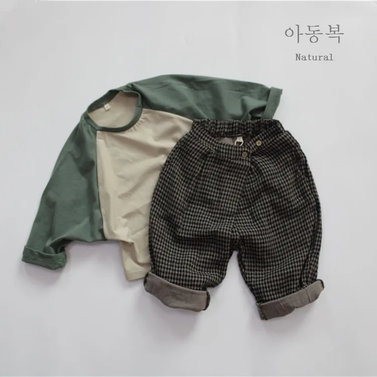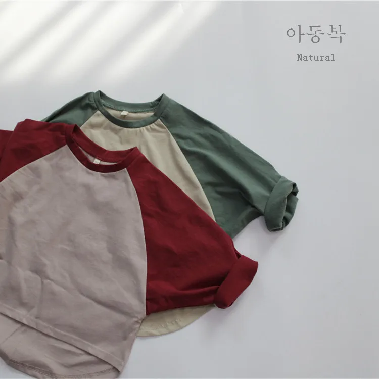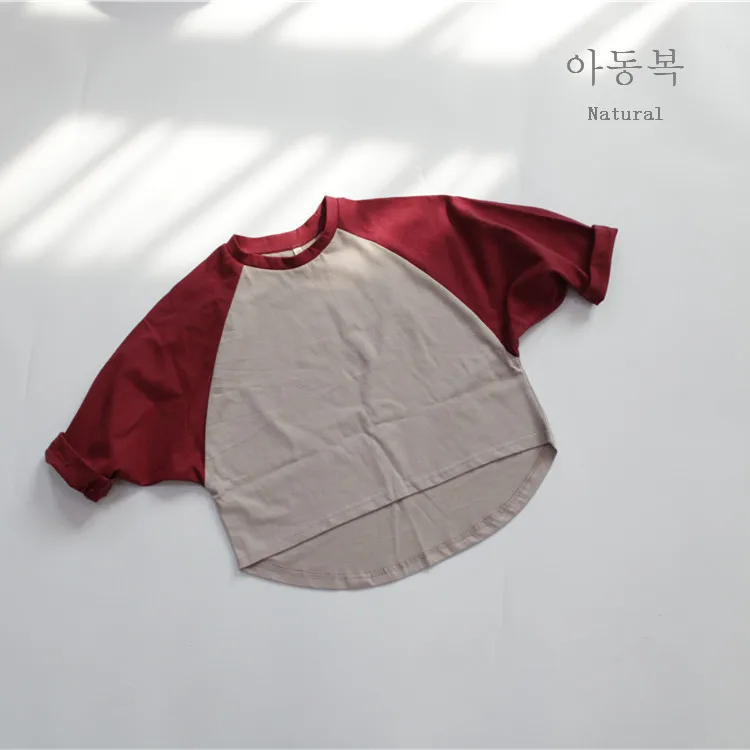 キッズトップス 長袖Tシャツ ラグランTシャツ パッチワーク レッド グリーン 2カラー