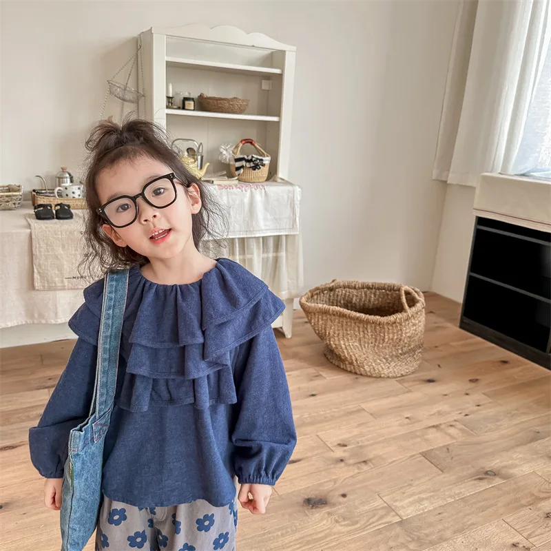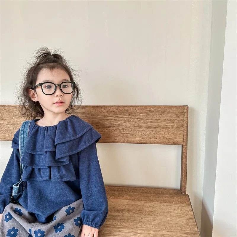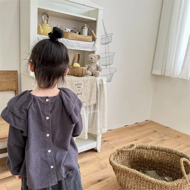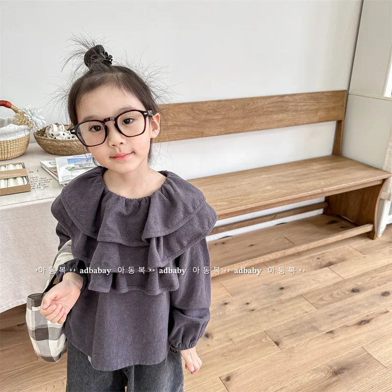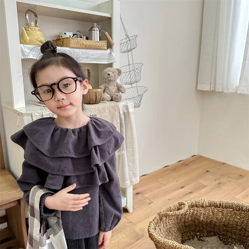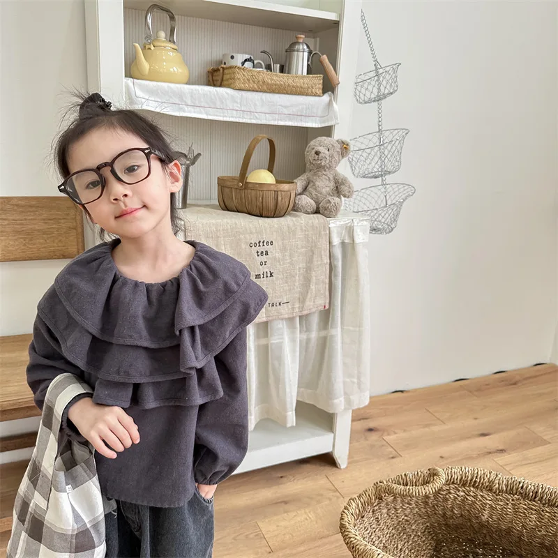 キッズ ラッフルフリル ビッグカラー 長袖 スモック チュニック ブラウス トップス ガールズ