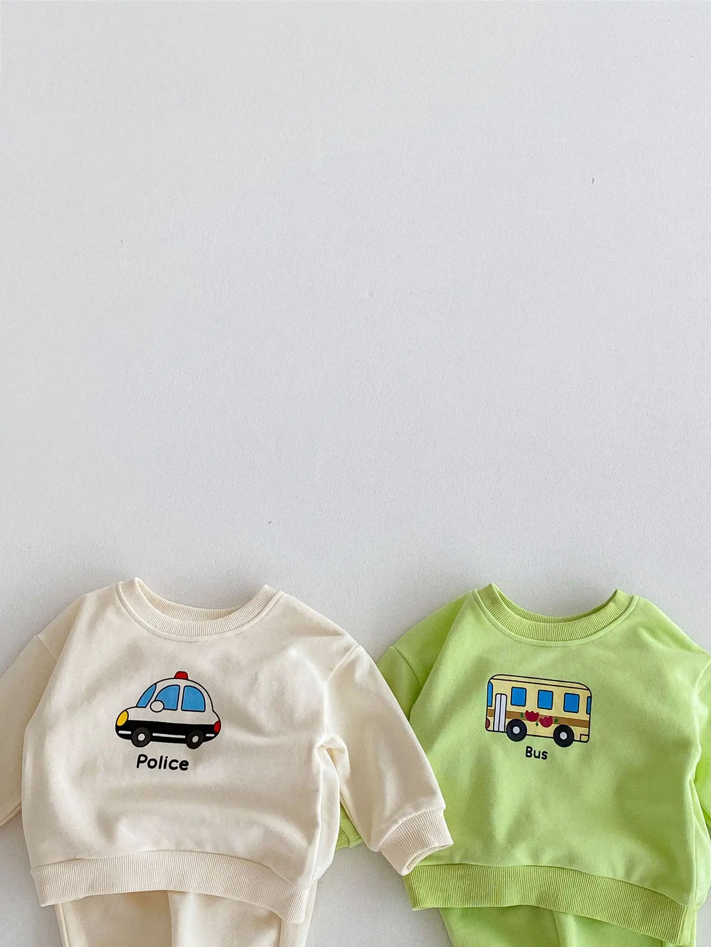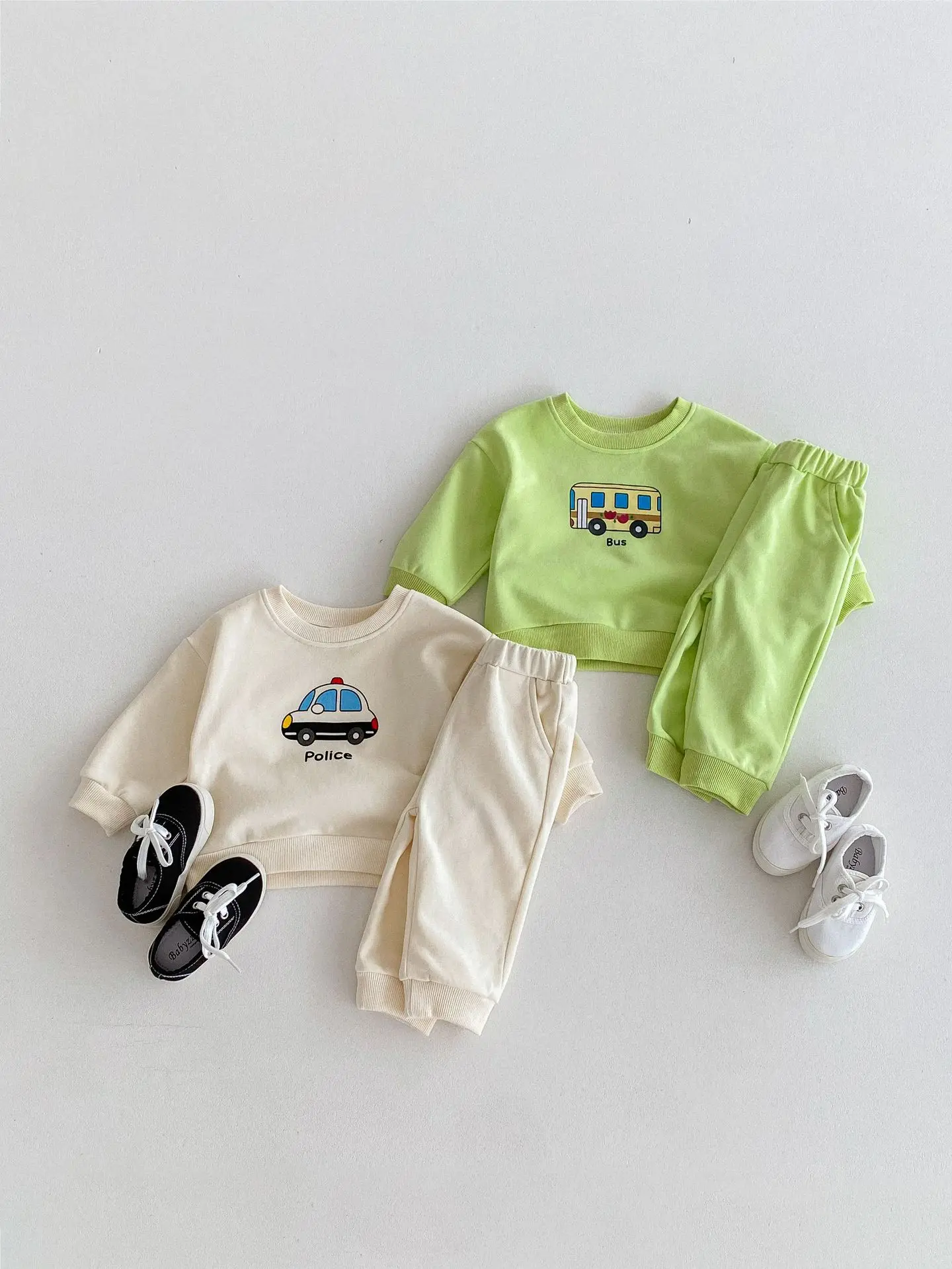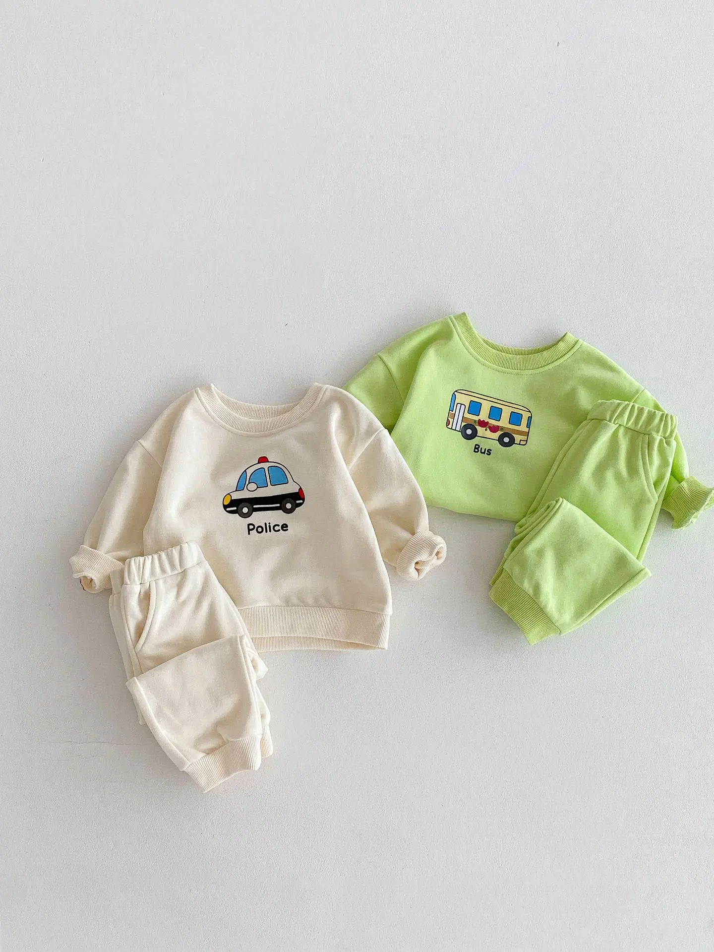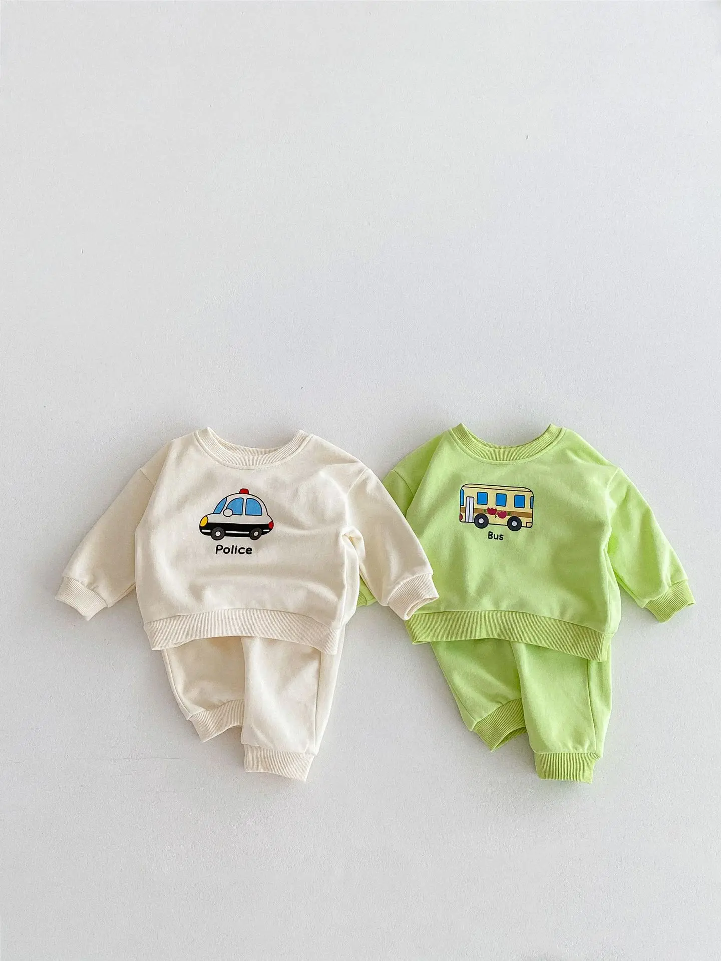 ベビーキッズセットアップ 2点セット パトカー/バス乗り物プリント長袖スウェットシャツ+ロングスウェットパンツ 2カラー【mh0006813】