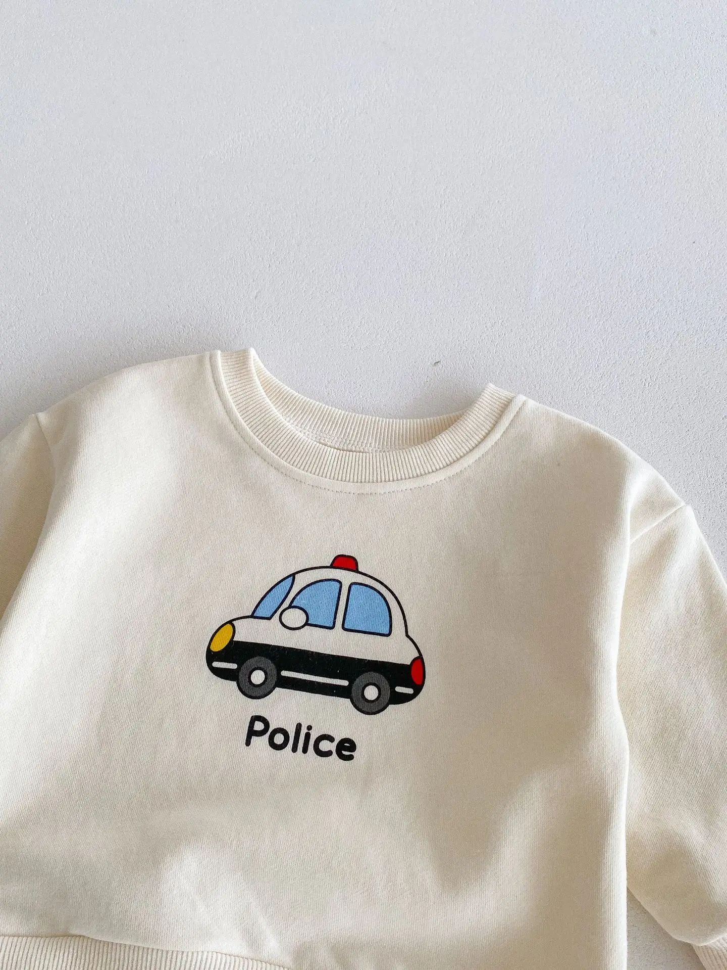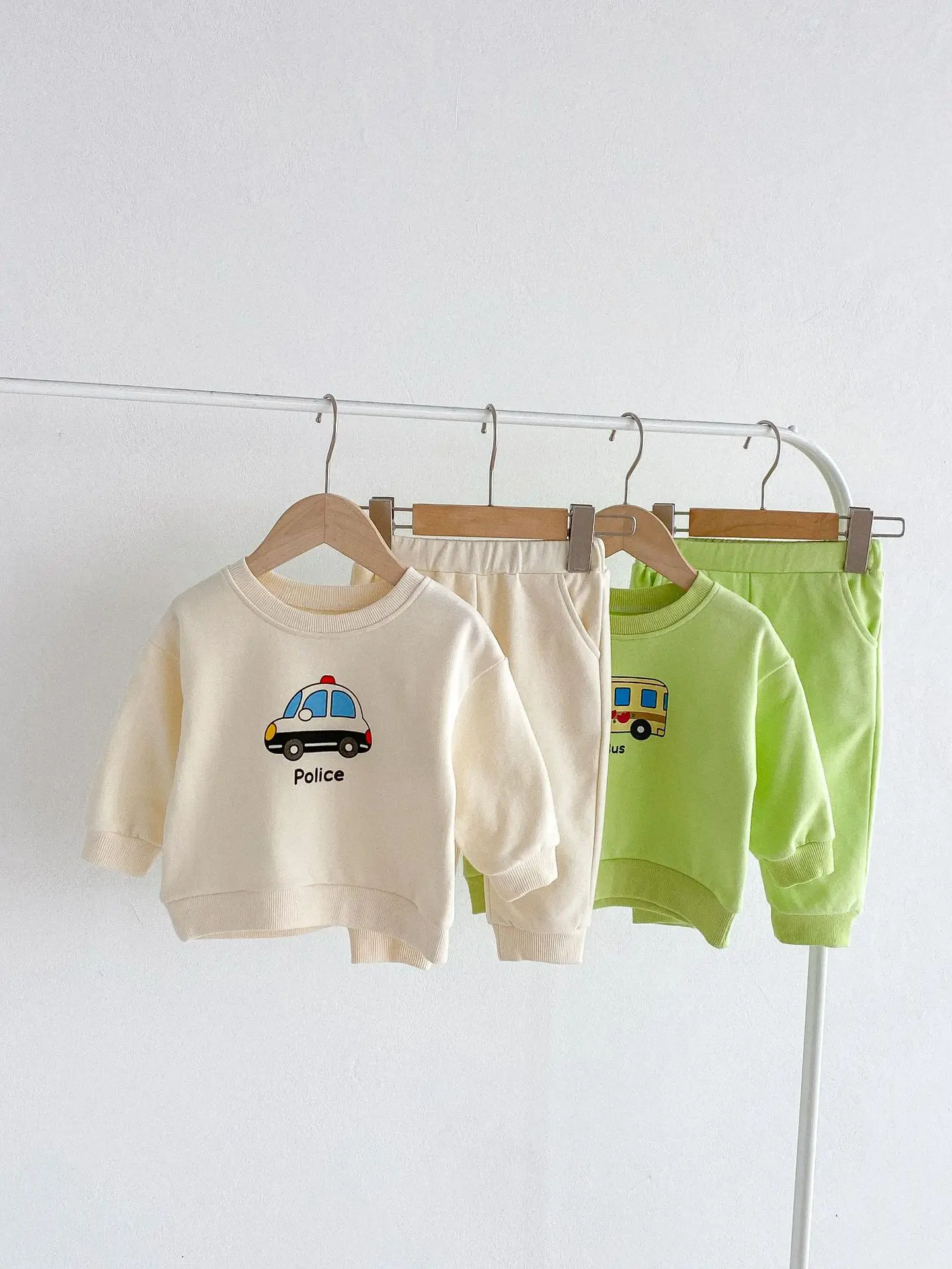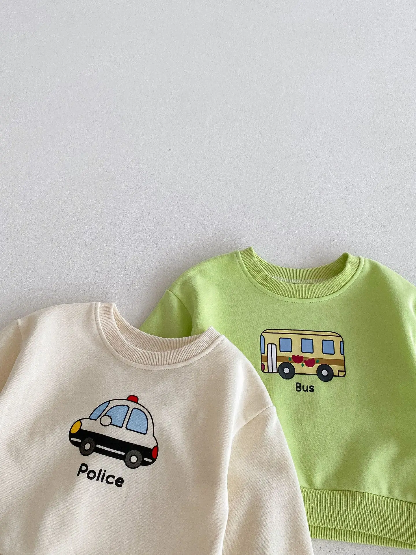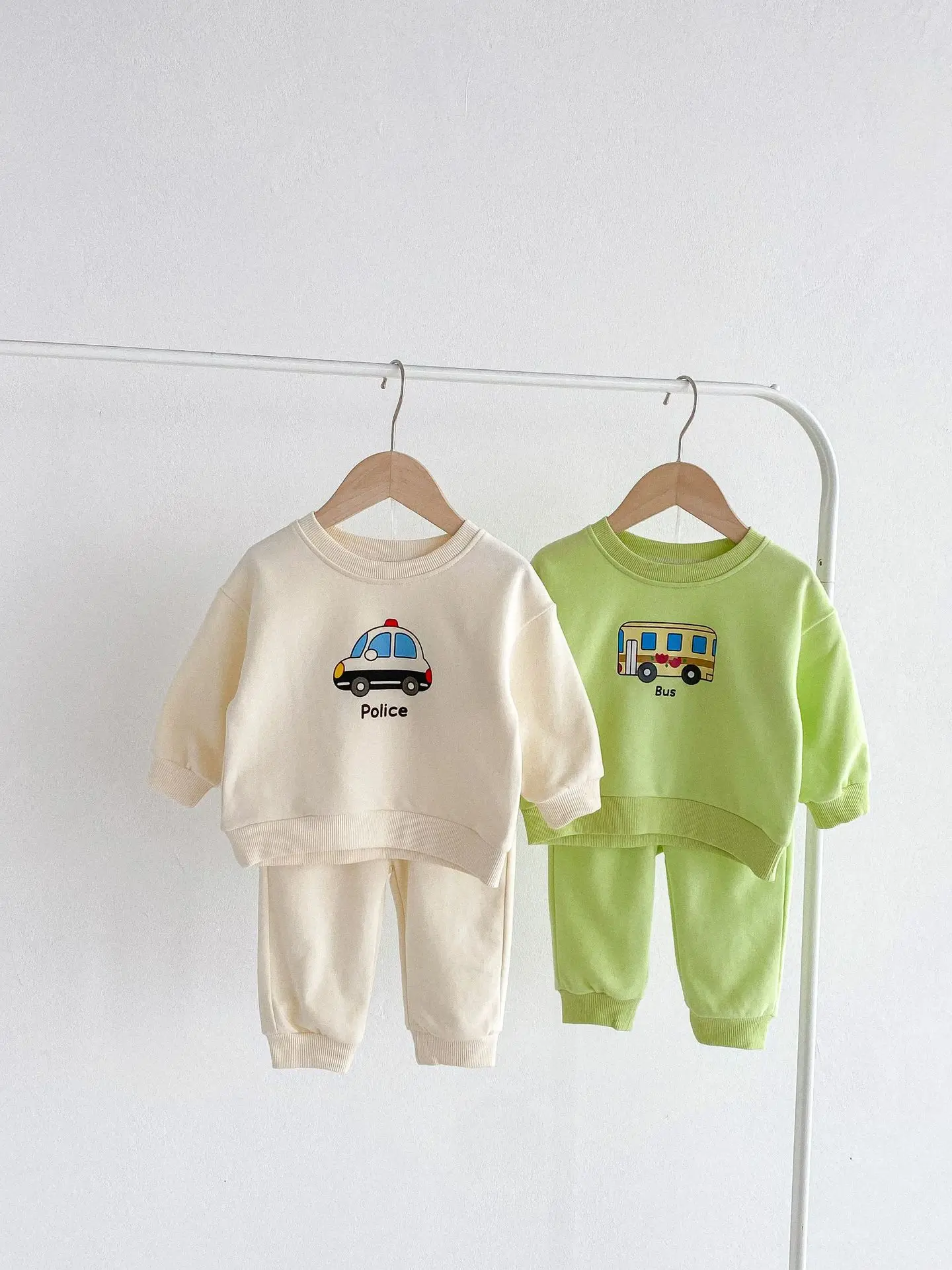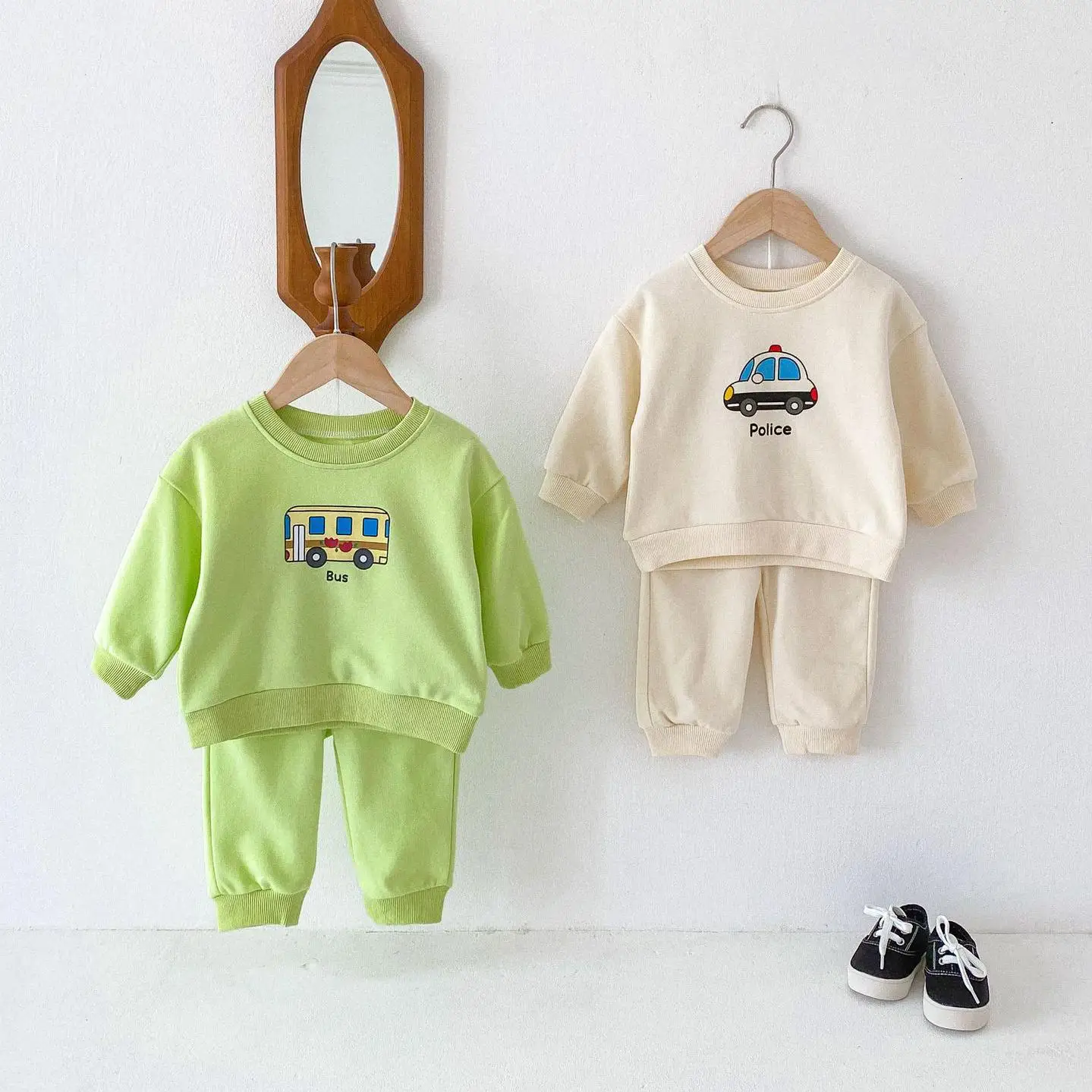 ベビーキッズセットアップ 2点セット パトカー/バス乗り物プリント長袖スウェットシャツ+ロングスウェットパンツ 2カラー【mh0006813】