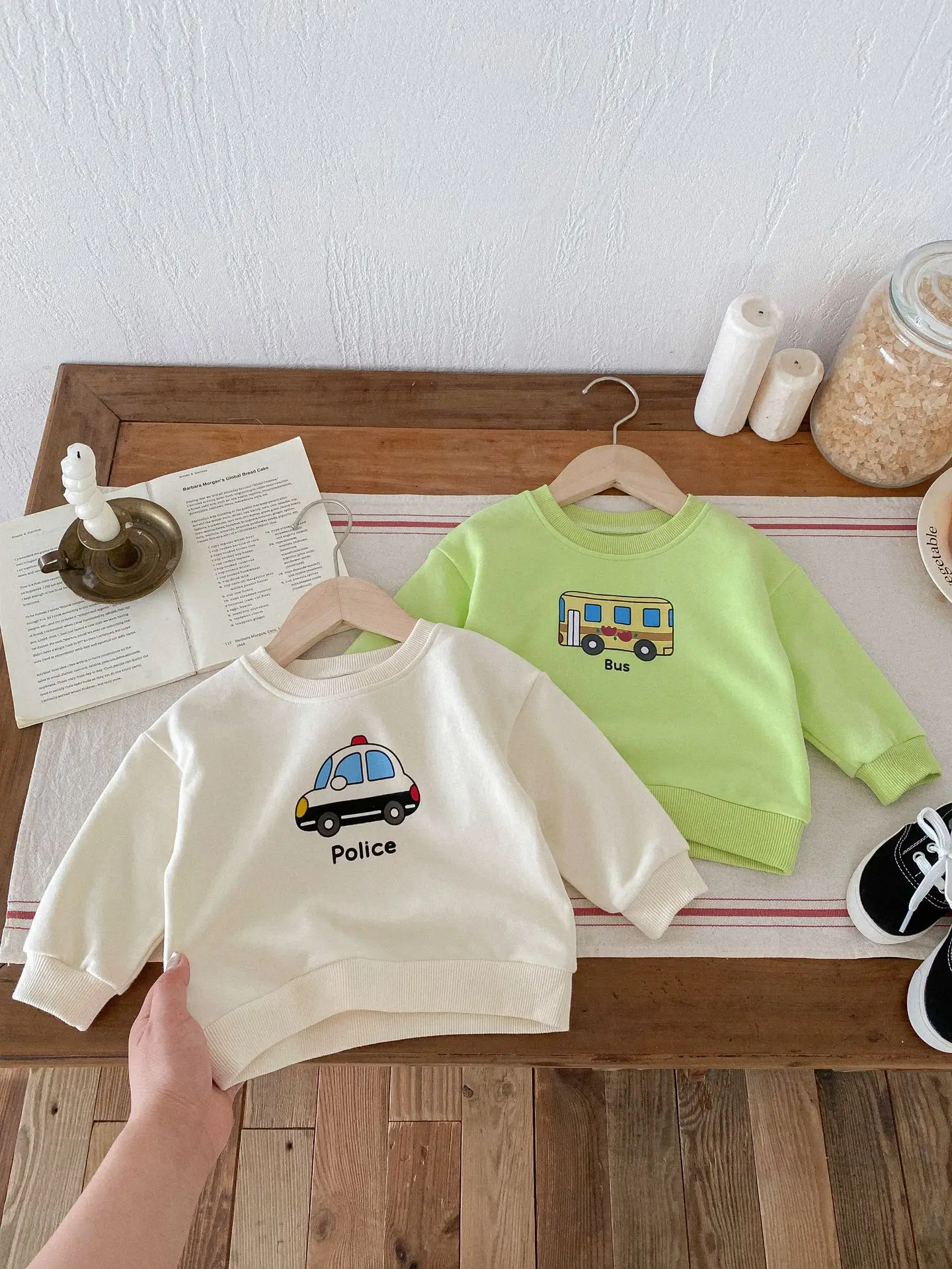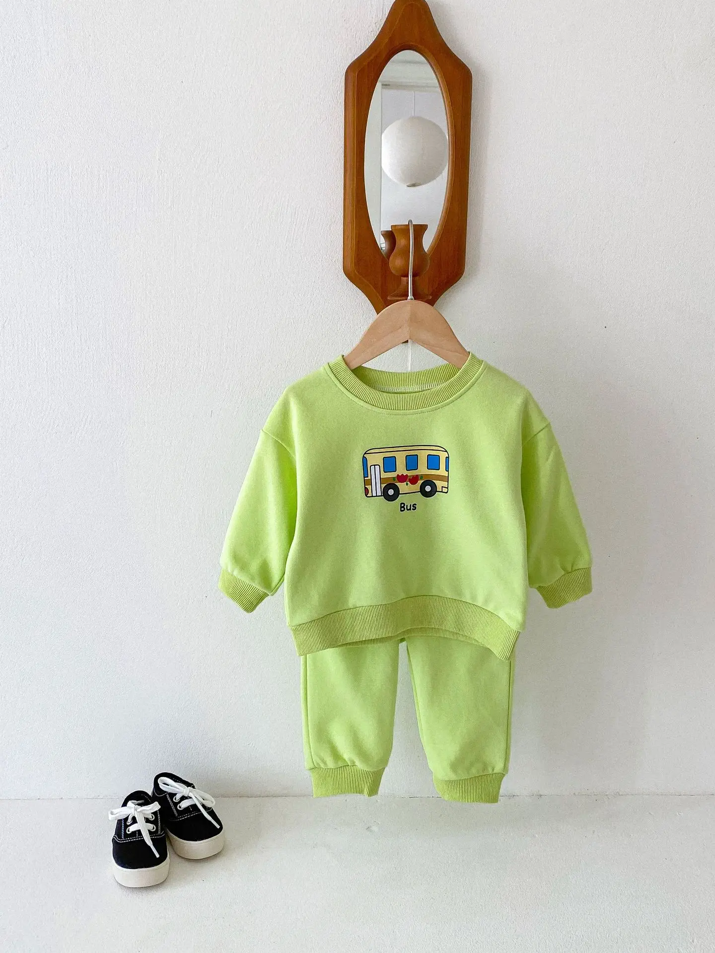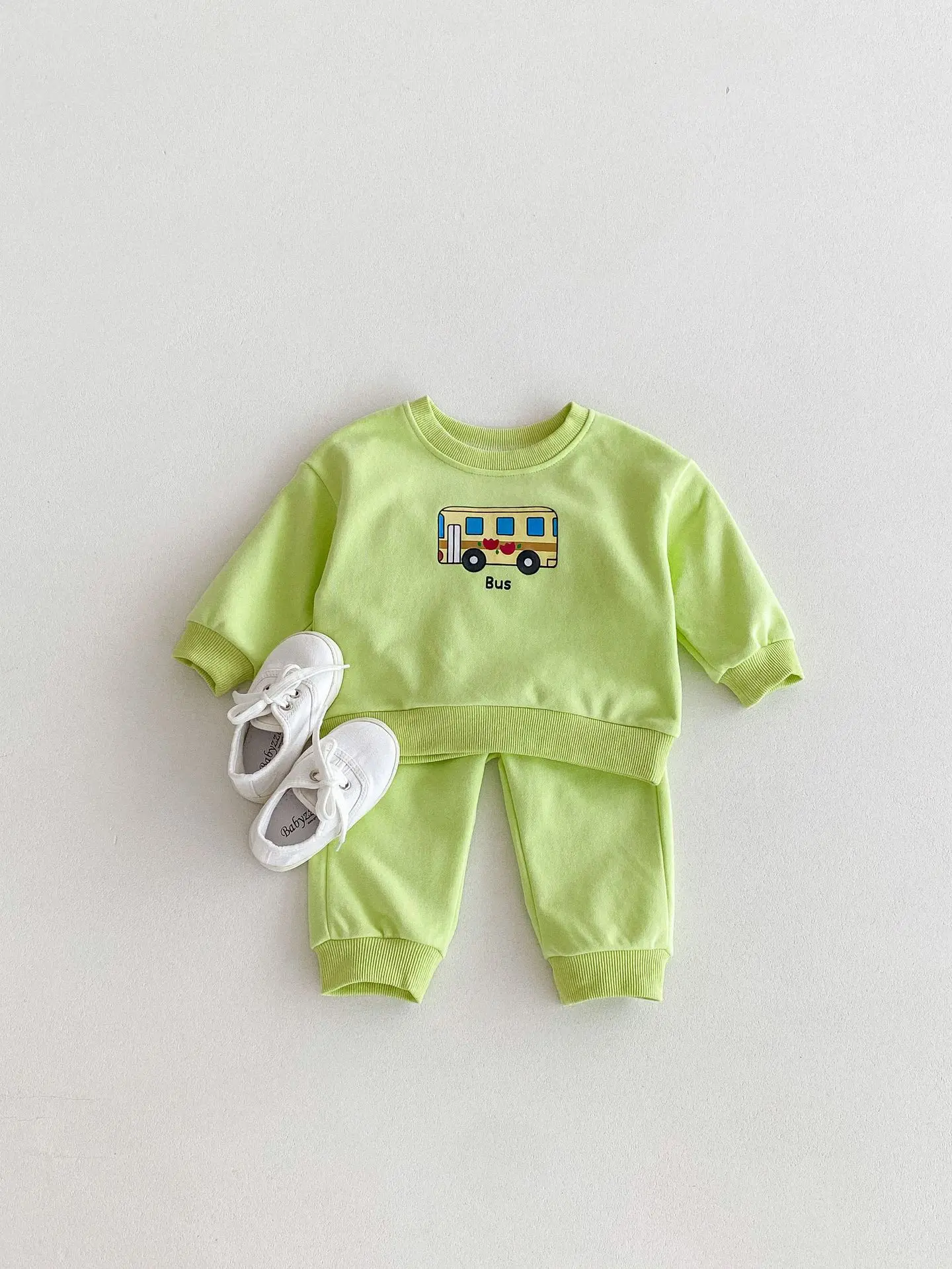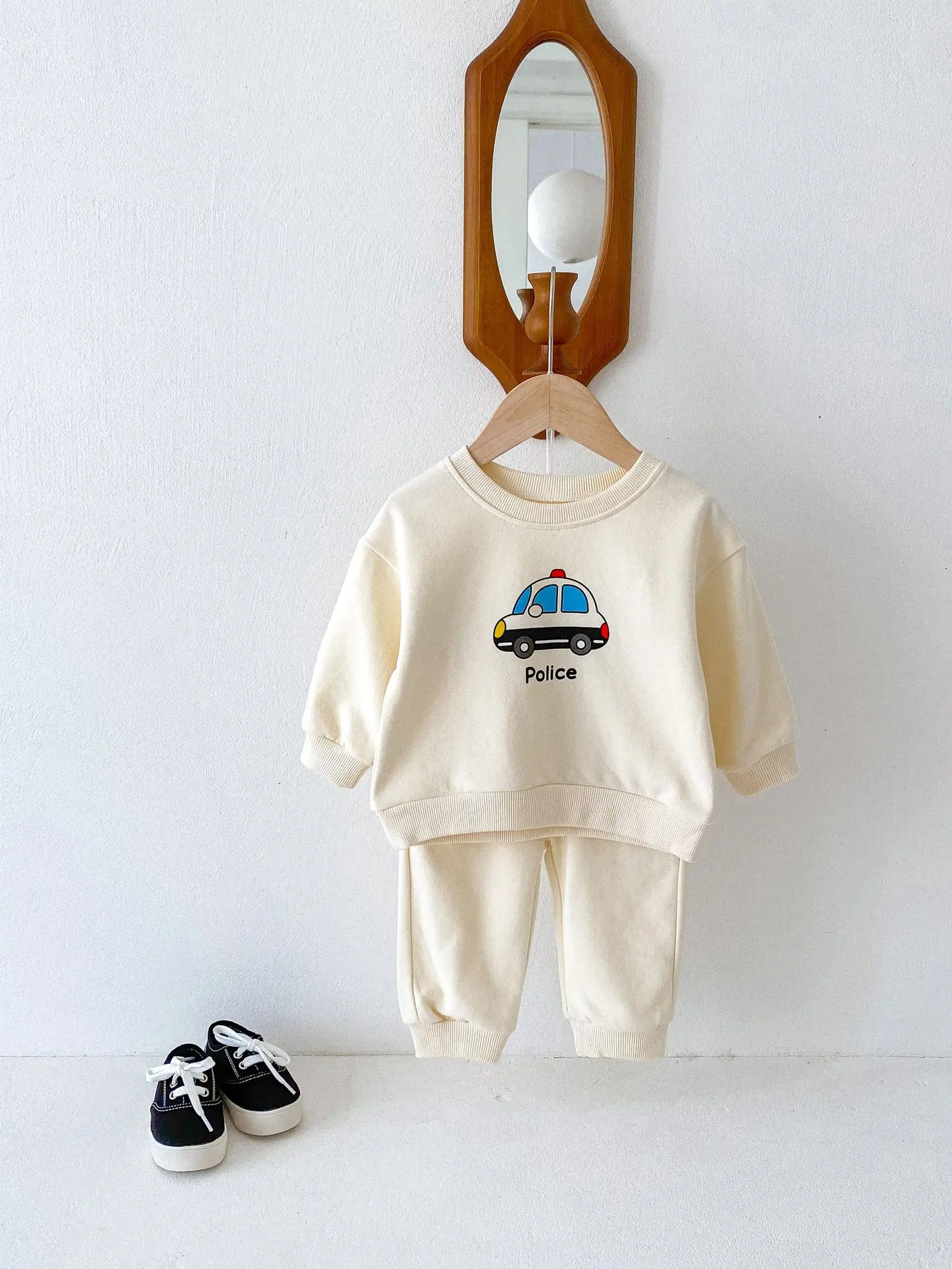 ベビーキッズセットアップ 2点セット パトカー/バス乗り物プリント長袖スウェットシャツ+ロングスウェットパンツ 2カラー【mh0006813】