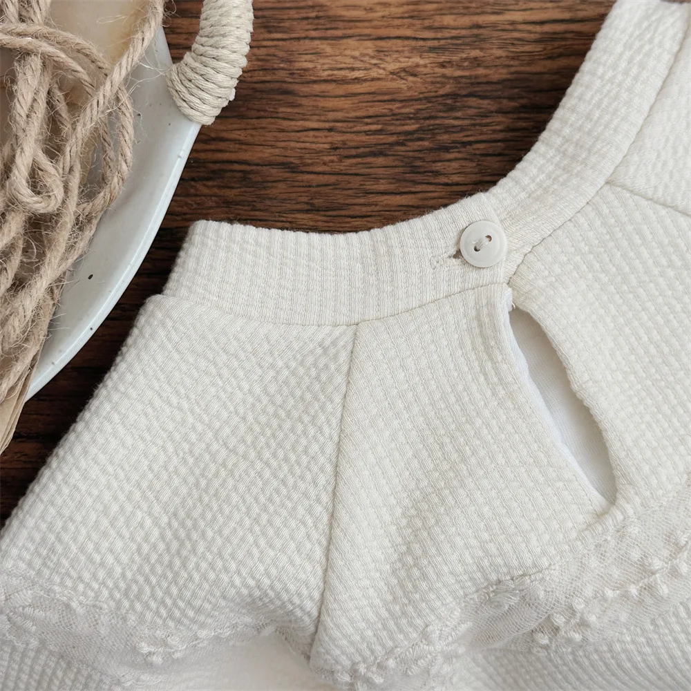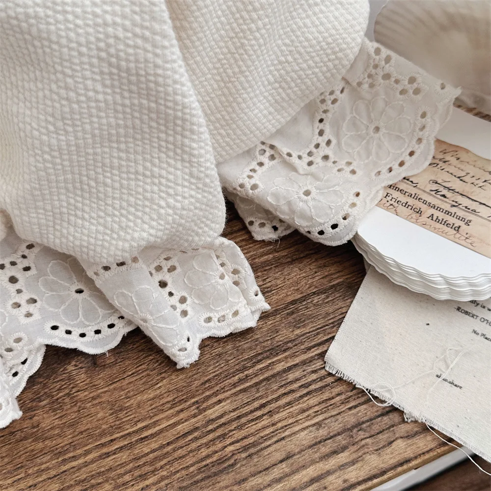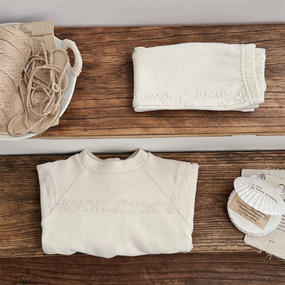 エレガントなレースペプラムドッキング長袖スウェットシャツと、フラワー刺繍が施されたロングパンツの2点セット。スウェットシャツは柔らかなコットン素材で、赤ちゃんの肌に優しく、快適な着心地を実現します。ペプラムデザインが可愛らしく、どんなスタイルにも合わせやすい一枚です。パンツには繊細な刺繍が施され、シンプルながらも特別感をプラス。アプリコットカラーが柔らかい印象を与え、デイリーコーデからお出かけスタイルまで幅広く活躍するアイテムです。