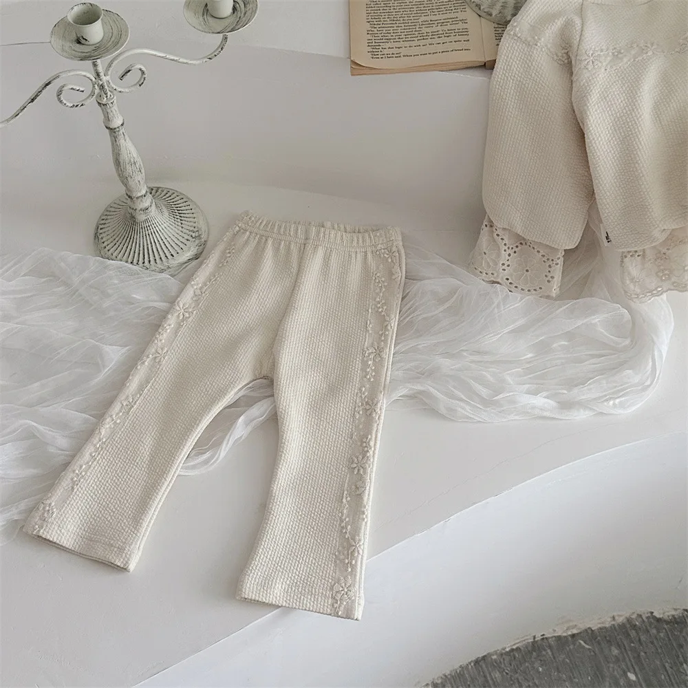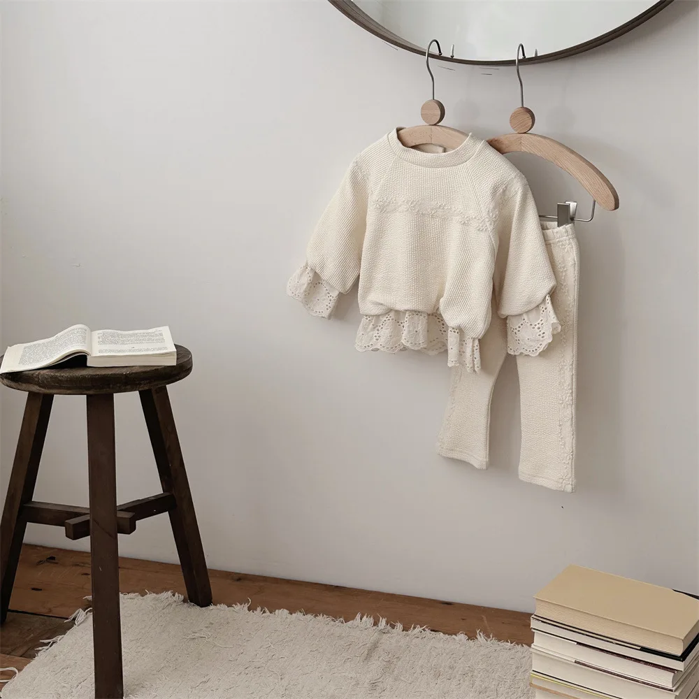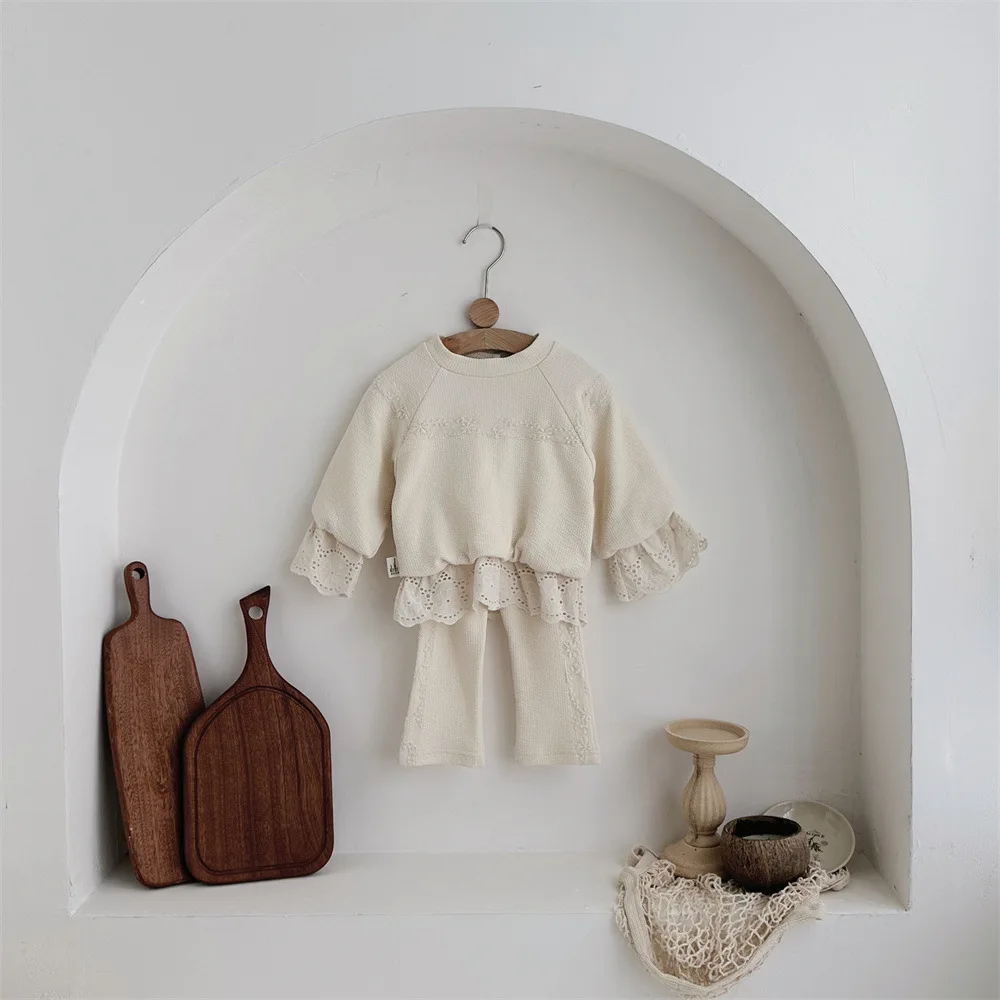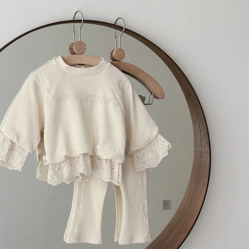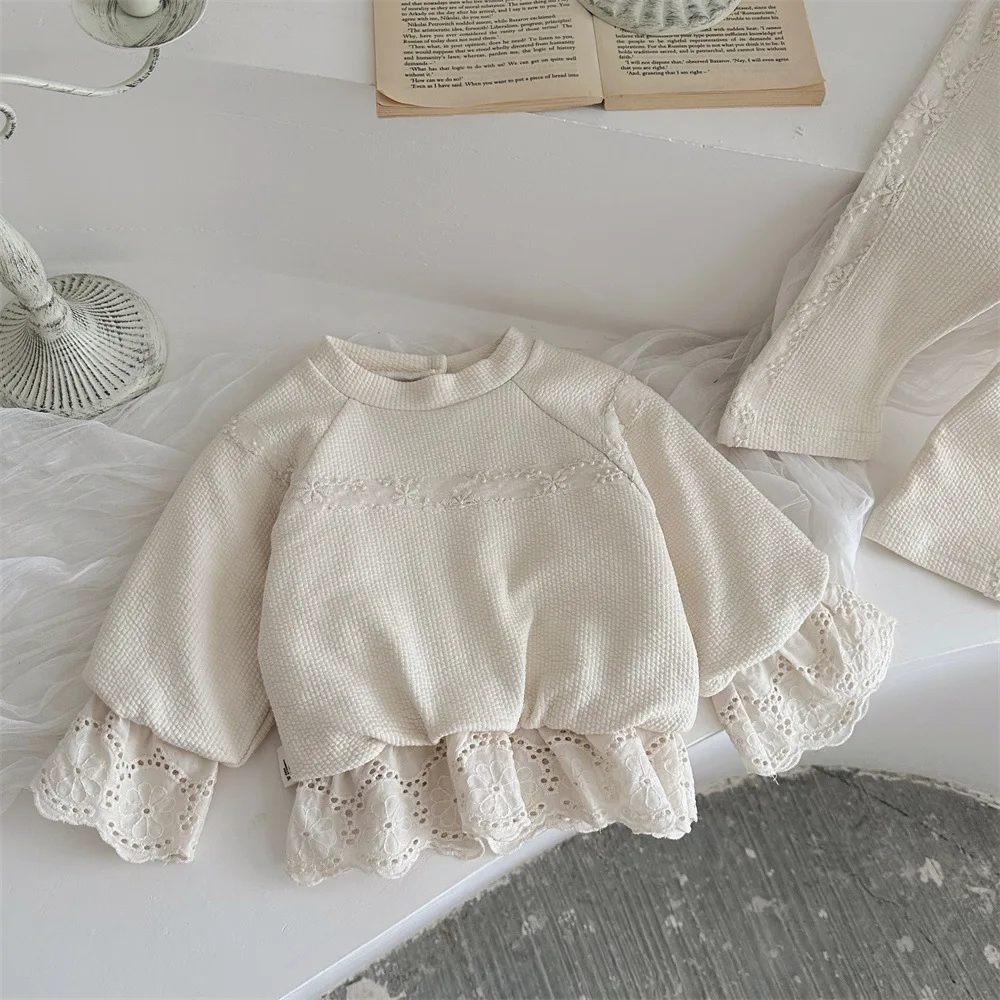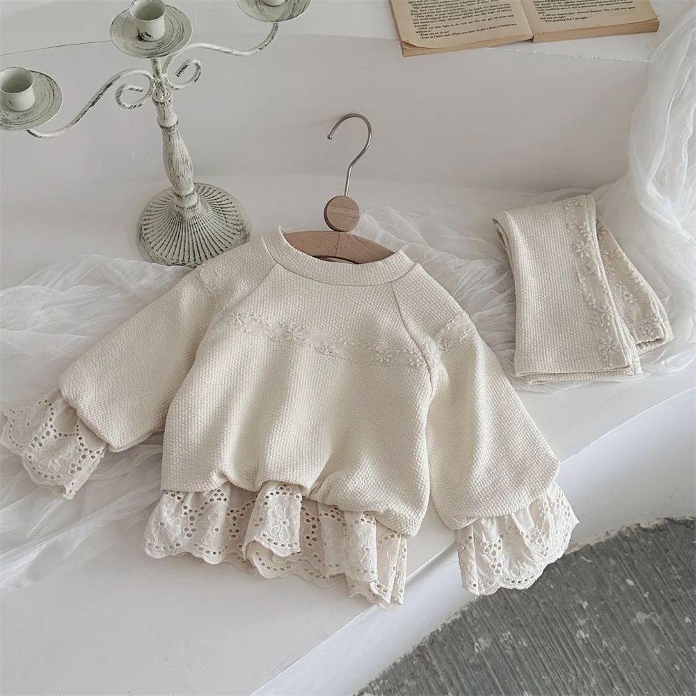 ベビーセットアップ 2点セット レースペプラムドッキング長袖スウェットシャツ+フラワー刺繍アクセントロングパンツ アプリコット【mh0007209】