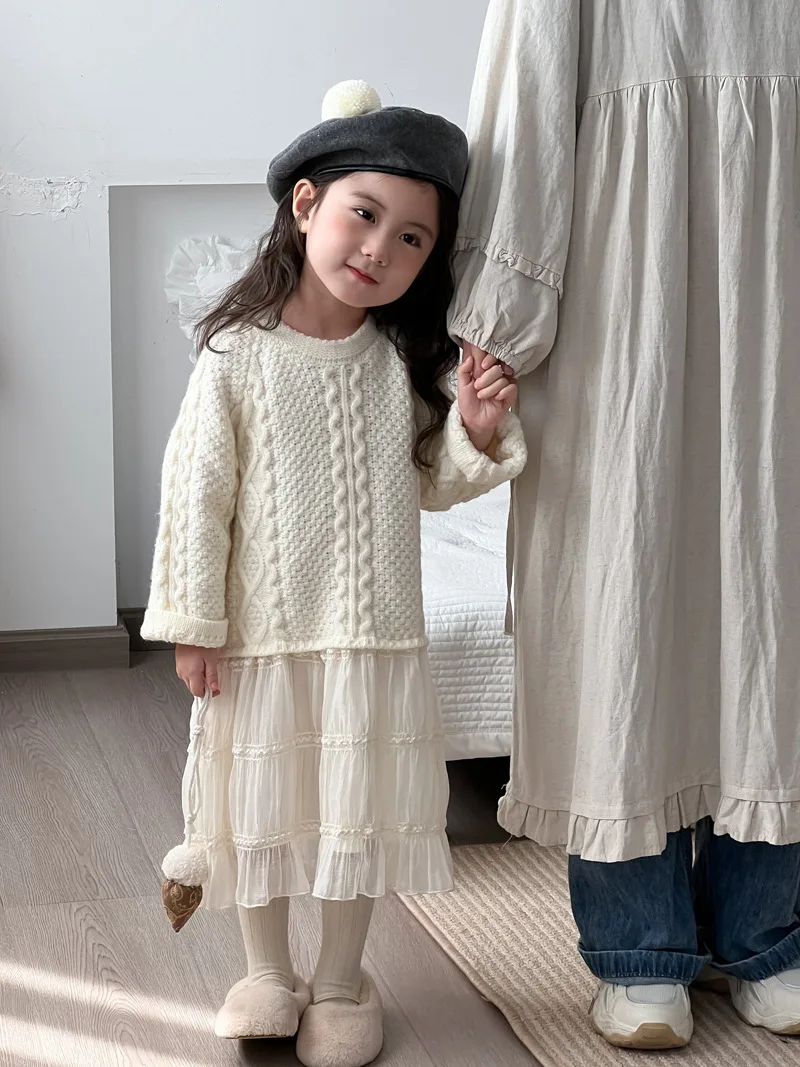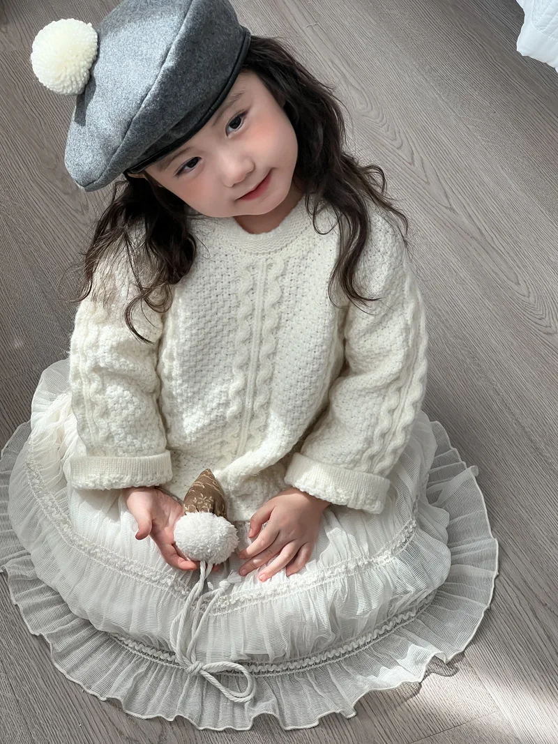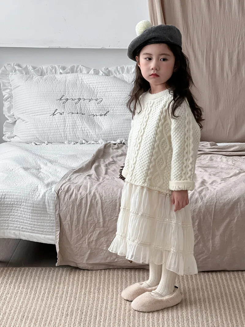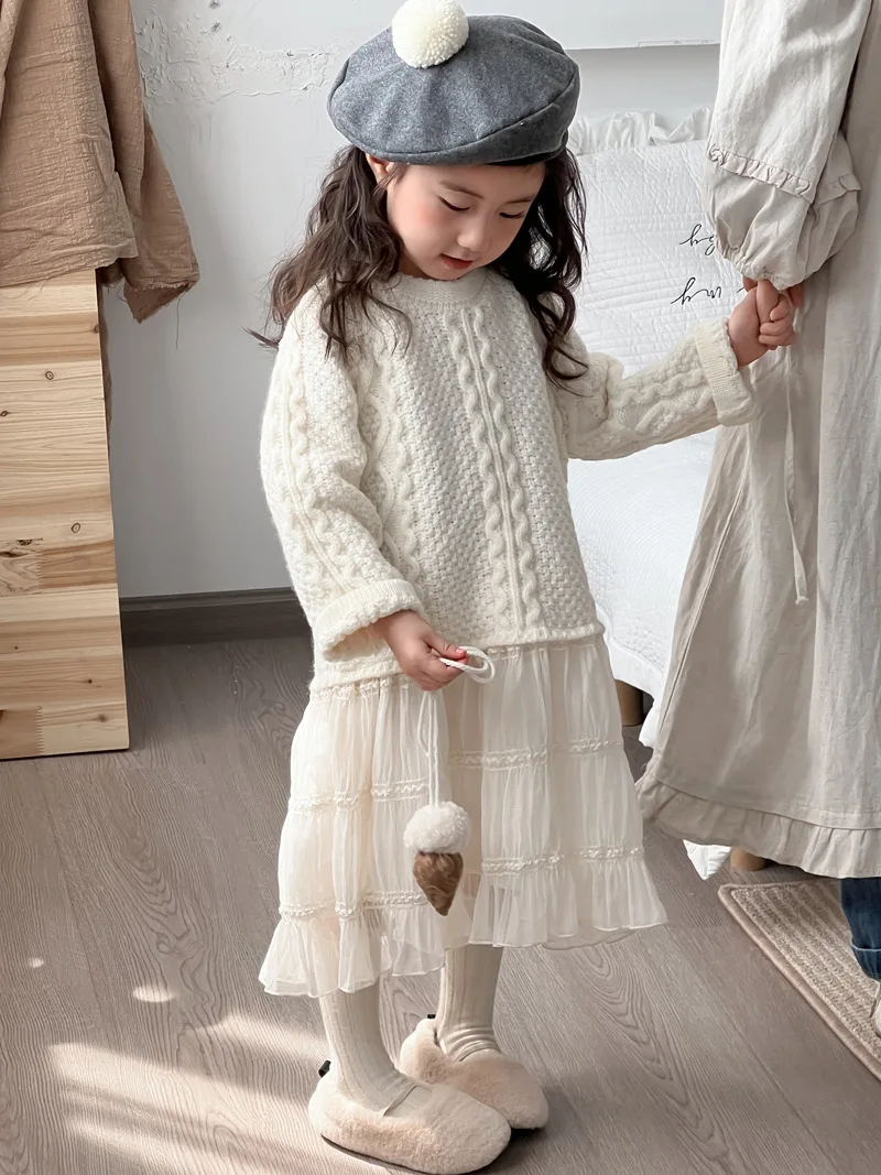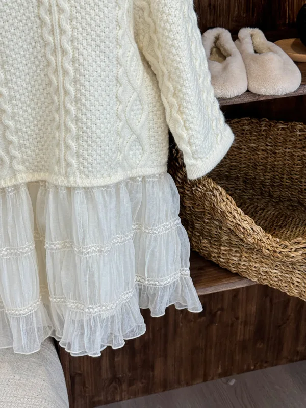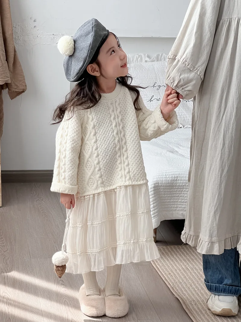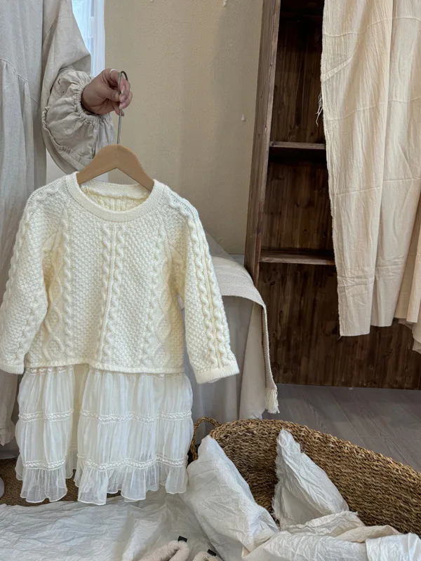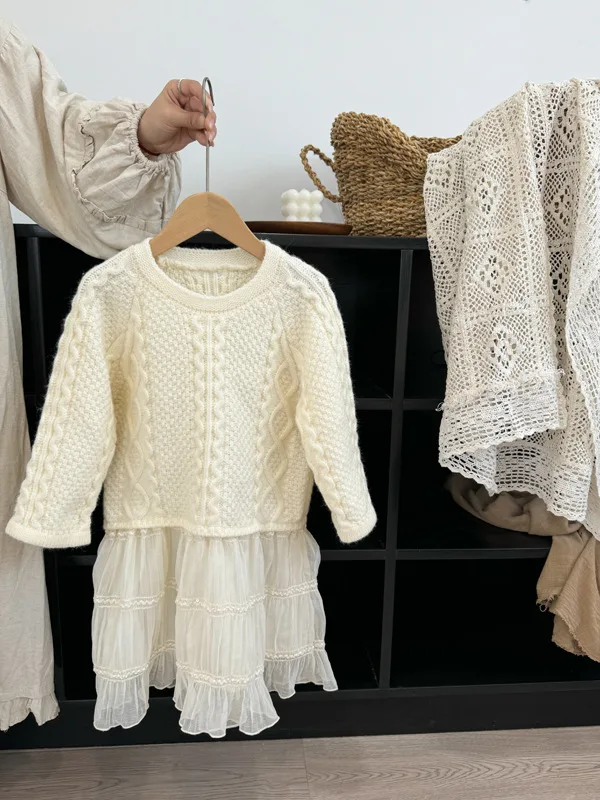 キッズワンピース アランニットケーブル編みセータードッキングレーススカートワンピース【mh0008145】