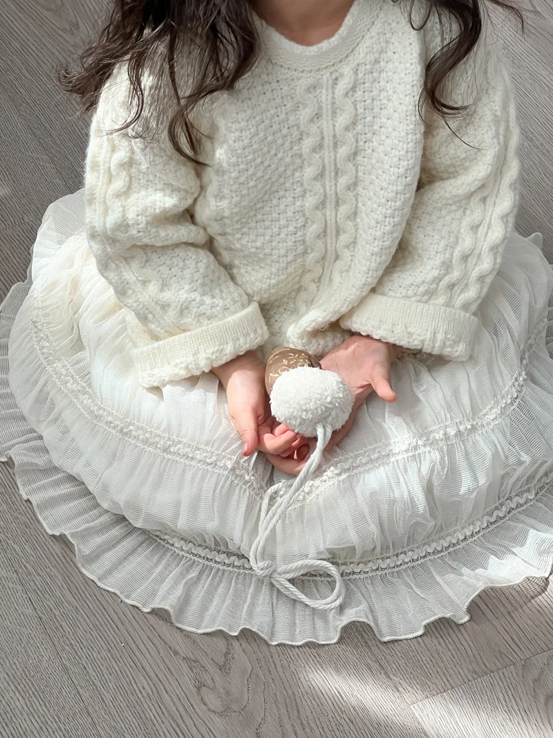 アランニットのケーブル編みセーターとレーススカートがドッキングしたワンピースは、寒い季節にぴったりの可愛らしいアイテムです。柔らかなニット素材が心地よく、温かさを保ちながらもおしゃれなデザインが魅力です。長袖のセーター部分は着心地が良く、寒い日でも安心して着用できます。裾に施された優雅なレースが、まるでプリンセスのような雰囲気を演出し、特別なお出かけにもふさわしい一着です。このワンピースは、日常のコーディネートにも映える華やかさを持ち、お子さまの冬のワードローブにぜひ加えていただきたいアイテムです。おしゃれで快適なスタイルを楽しんでください。
