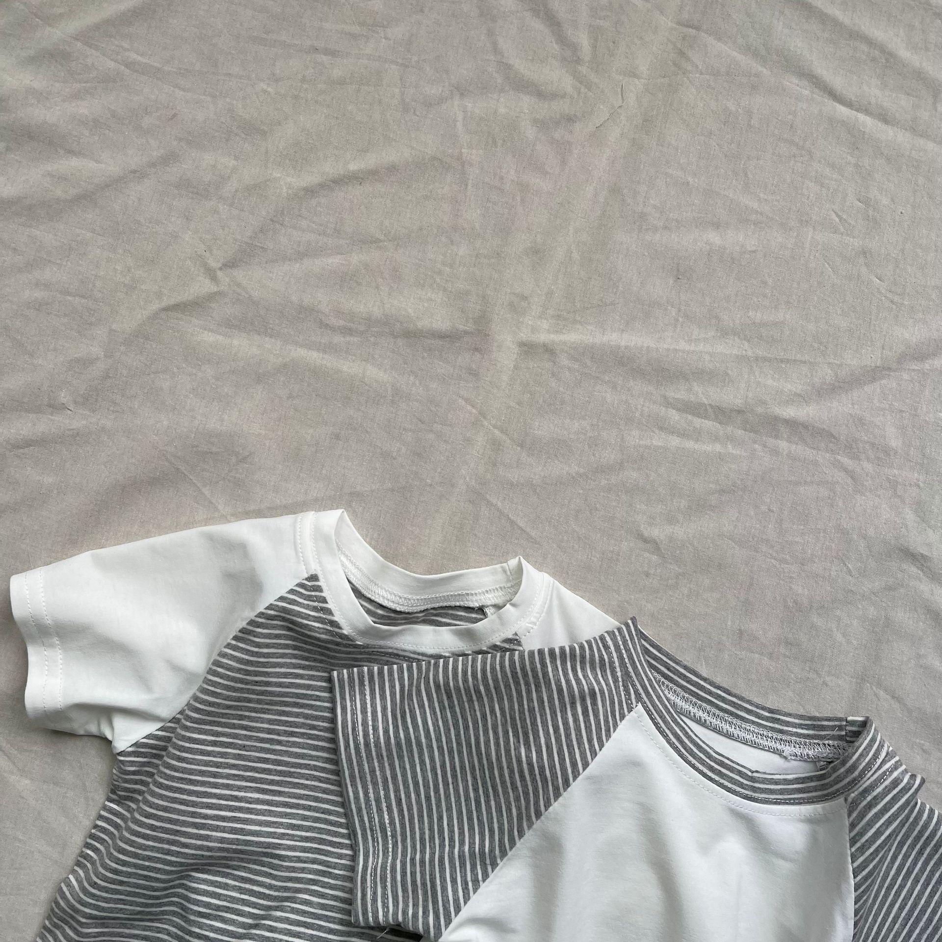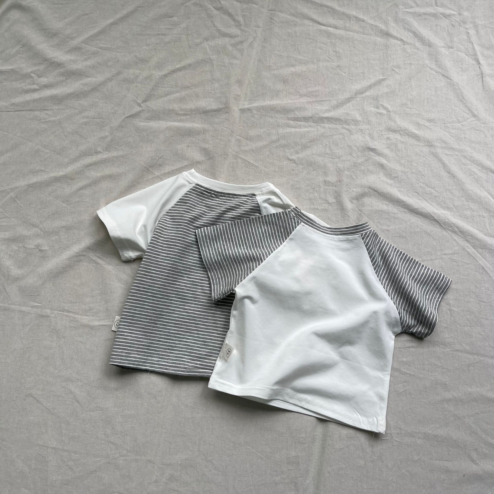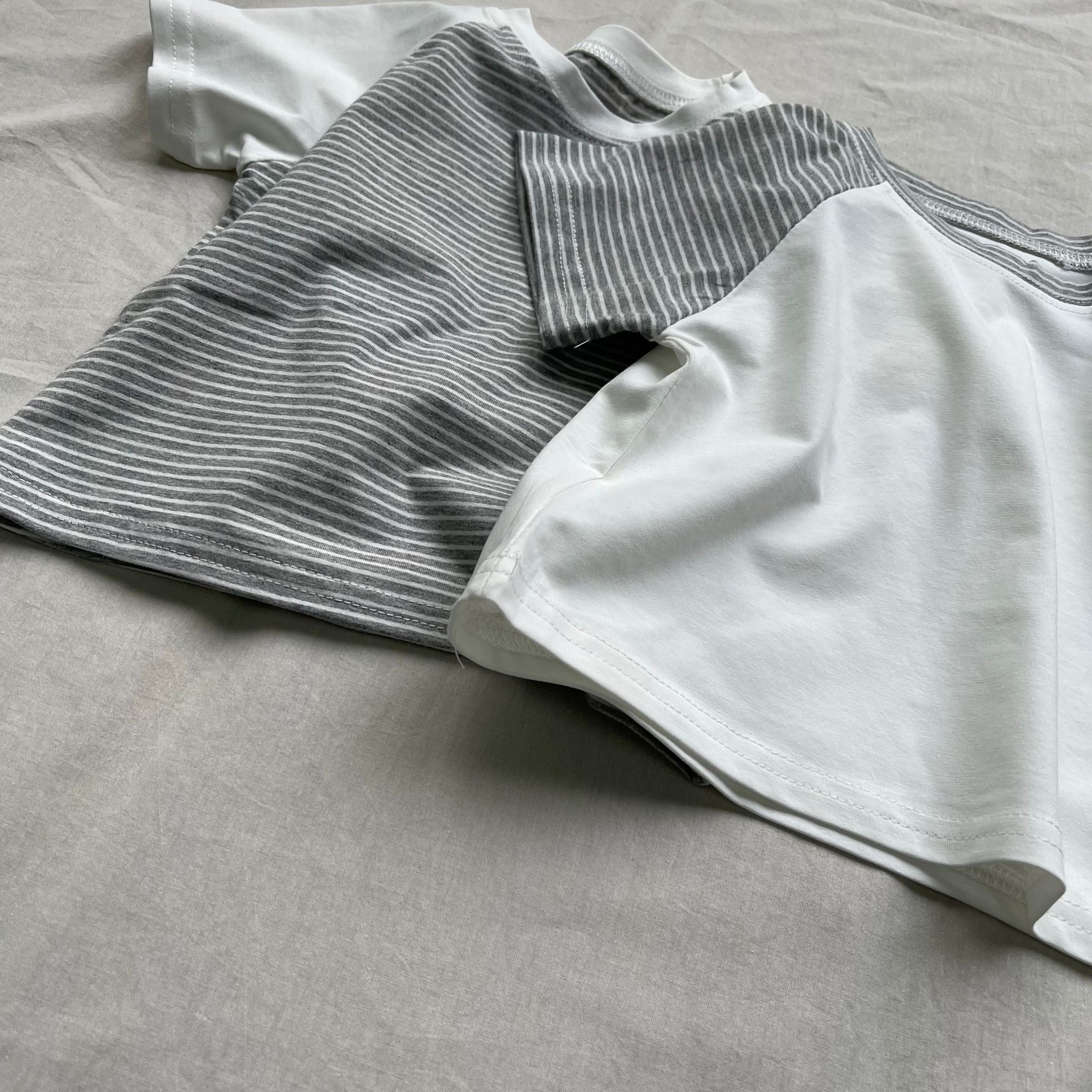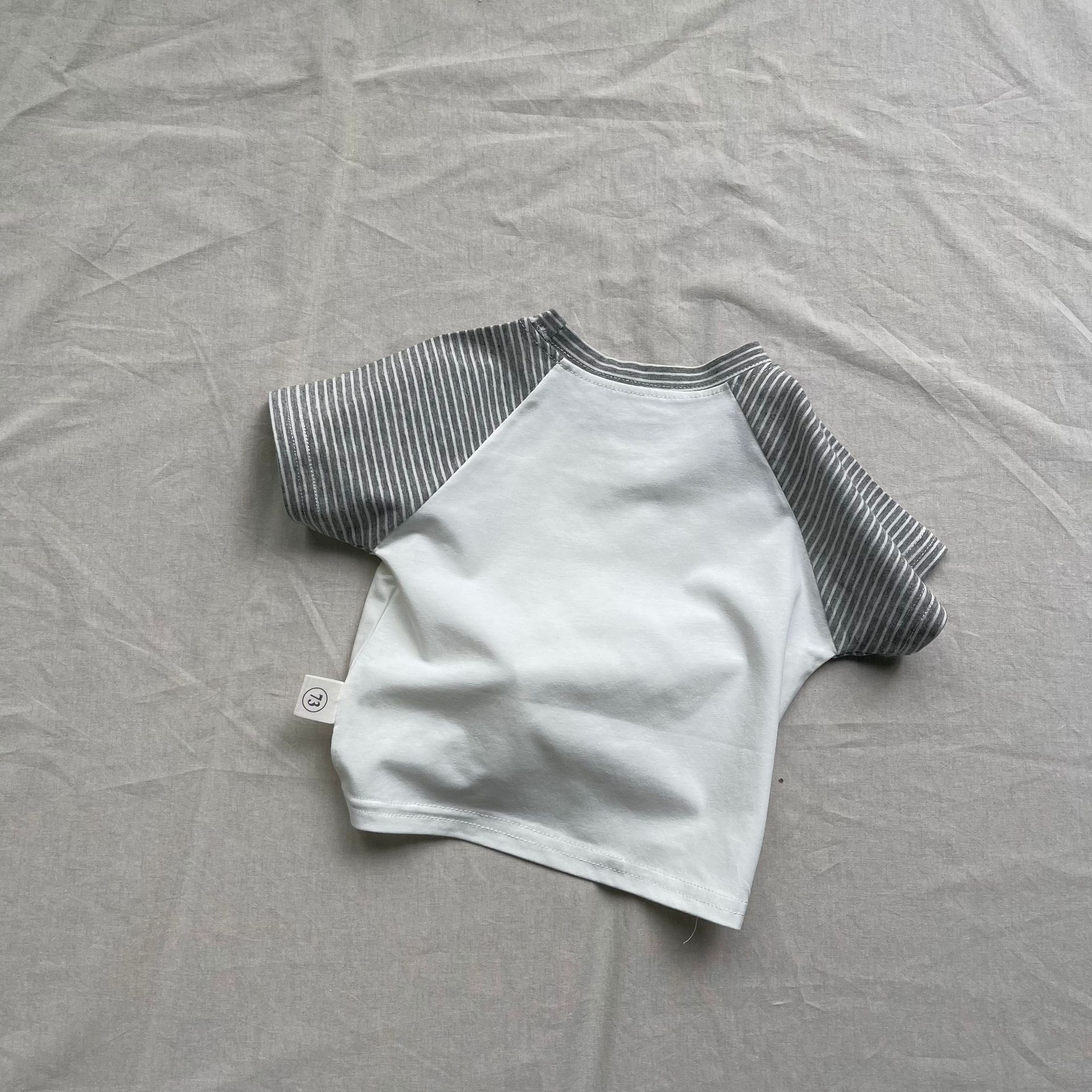 ボーダー柄とラグランデザインが特徴のパッチワーク半袖Tシャツです。カジュアルでありながらもおしゃれな印象を与えるデザインで、様々なスタイルに合わせやすいのが魅力です。柔らかなコットン素材を使用しており、赤ちゃんの肌に優しく、快適な着心地を提供します。ゆったりとしたシルエットで動きやすく、デニムやショートパンツと合わせてカジュアルなお出かけスタイルを楽しむことができます。普段使いから特別な日まで幅広く活躍するアイテムです。