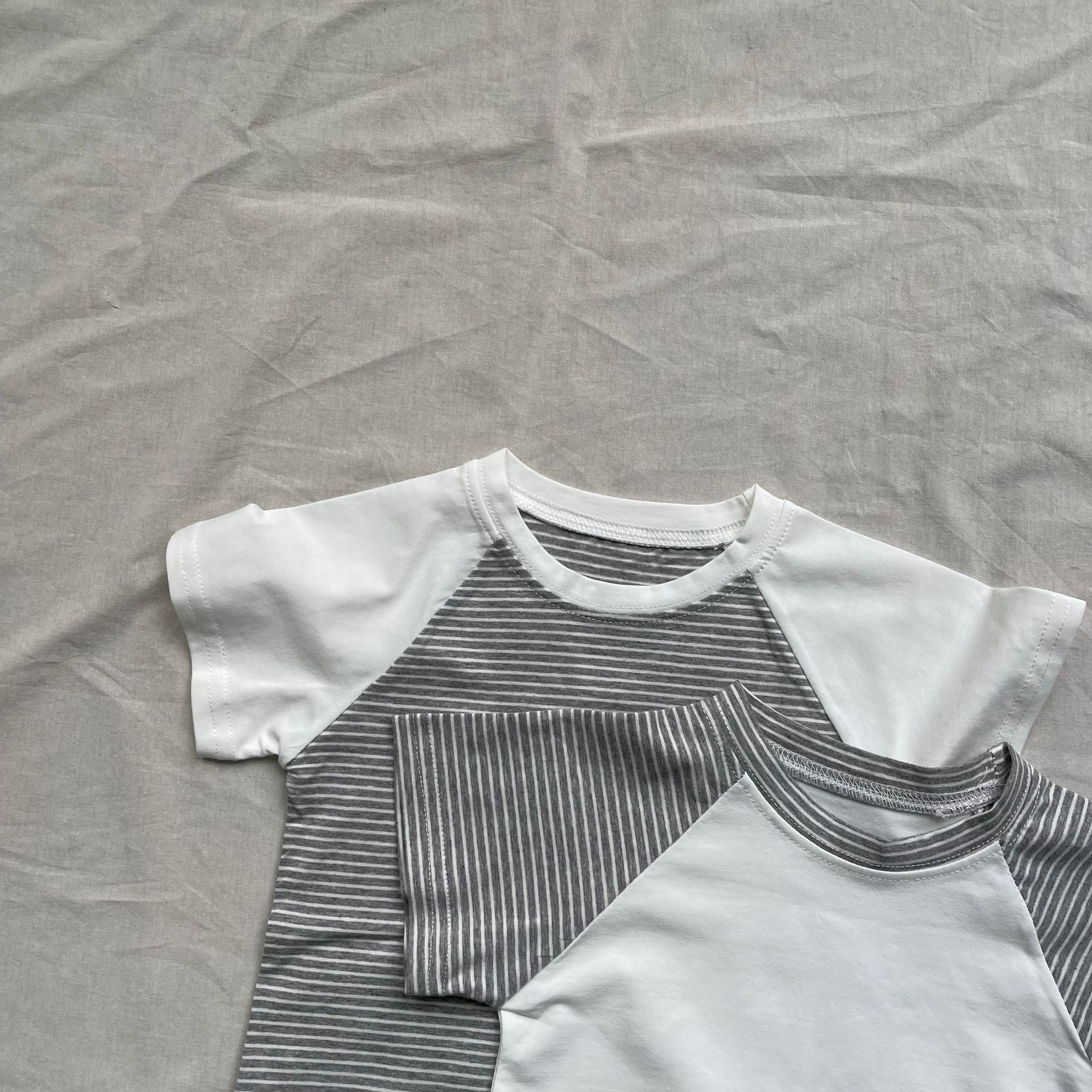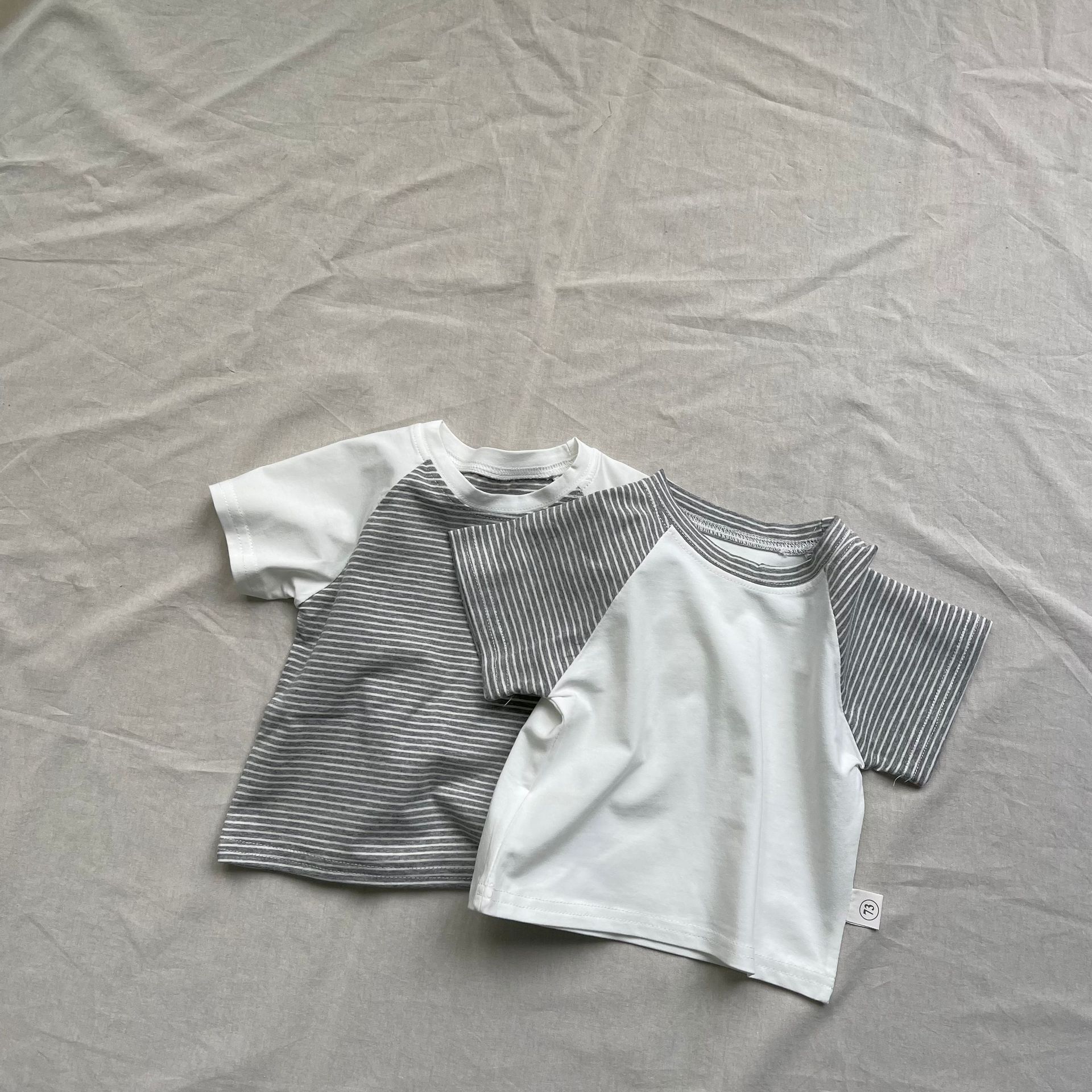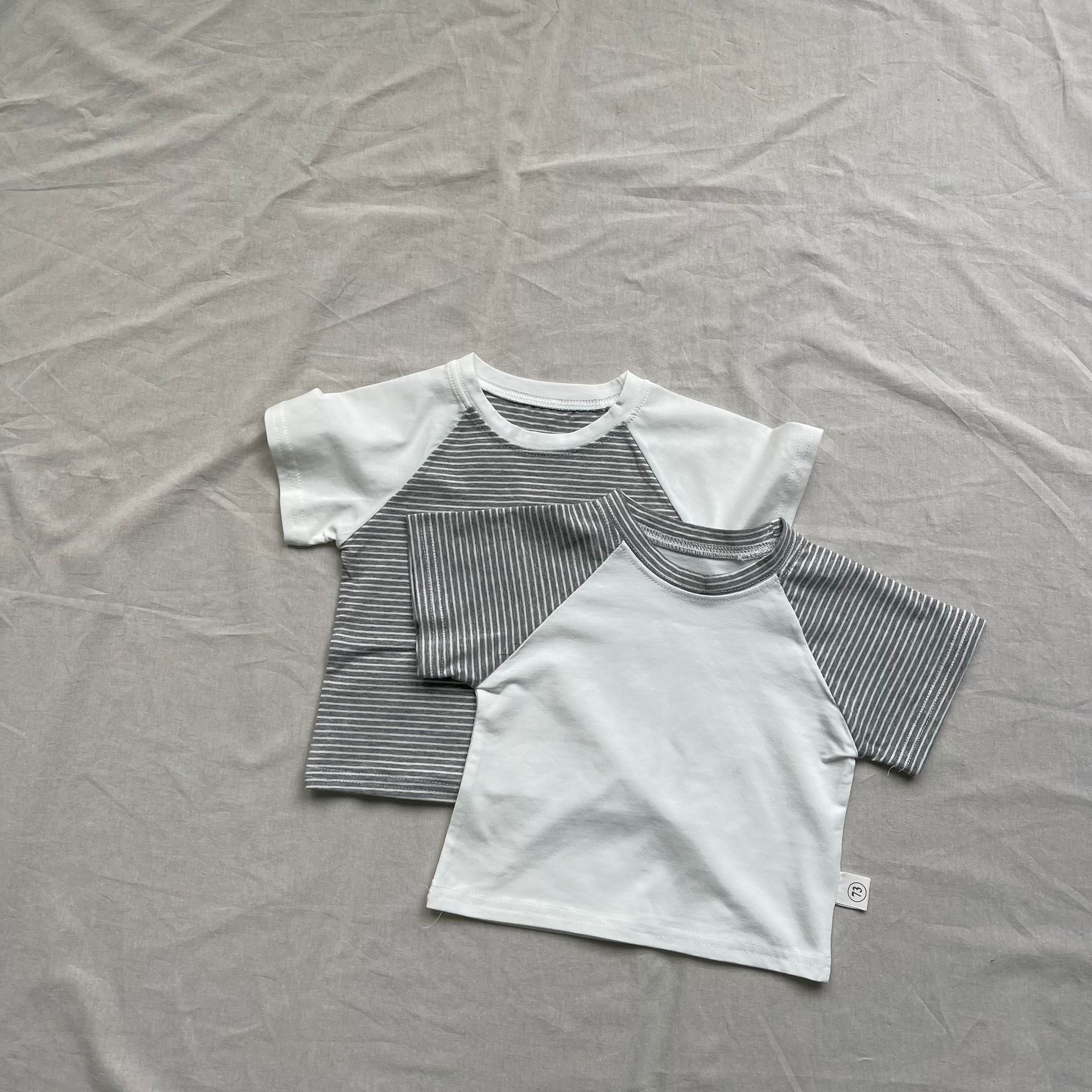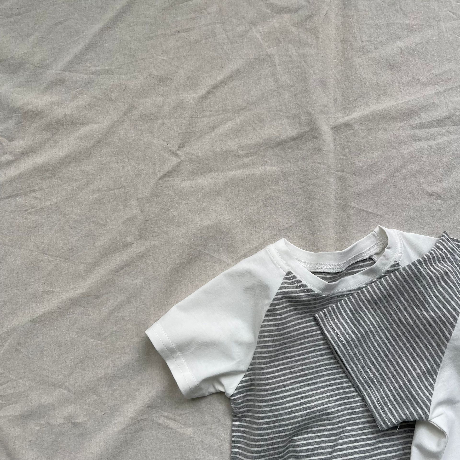 ボーダー柄とラグランデザインが特徴のパッチワーク半袖Tシャツです。カジュアルでありながらもおしゃれな印象を与えるデザインで、様々なスタイルに合わせやすいのが魅力です。柔らかなコットン素材を使用しており、赤ちゃんの肌に優しく、快適な着心地を提供します。ゆったりとしたシルエットで動きやすく、デニムやショートパンツと合わせてカジュアルなお出かけスタイルを楽しむことができます。普段使いから特別な日まで幅広く活躍するアイテムです。