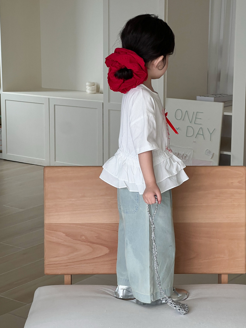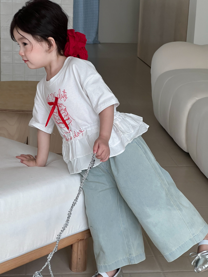 可愛らしいケーキの刺繍と、ふんわりとしたペプラムフリルが目を引くキッズガール用半袖Tシャツです。胸元にあしらわれたリボンが、さらにガーリーな印象をプラス。夏の装いにぴったりの、軽やかな素材を使用しています。普段使いにはもちろん、ちょっとしたお出かけにもおすすめです。お子様の可愛らしさを引き立てる、おしゃれな一枚です。