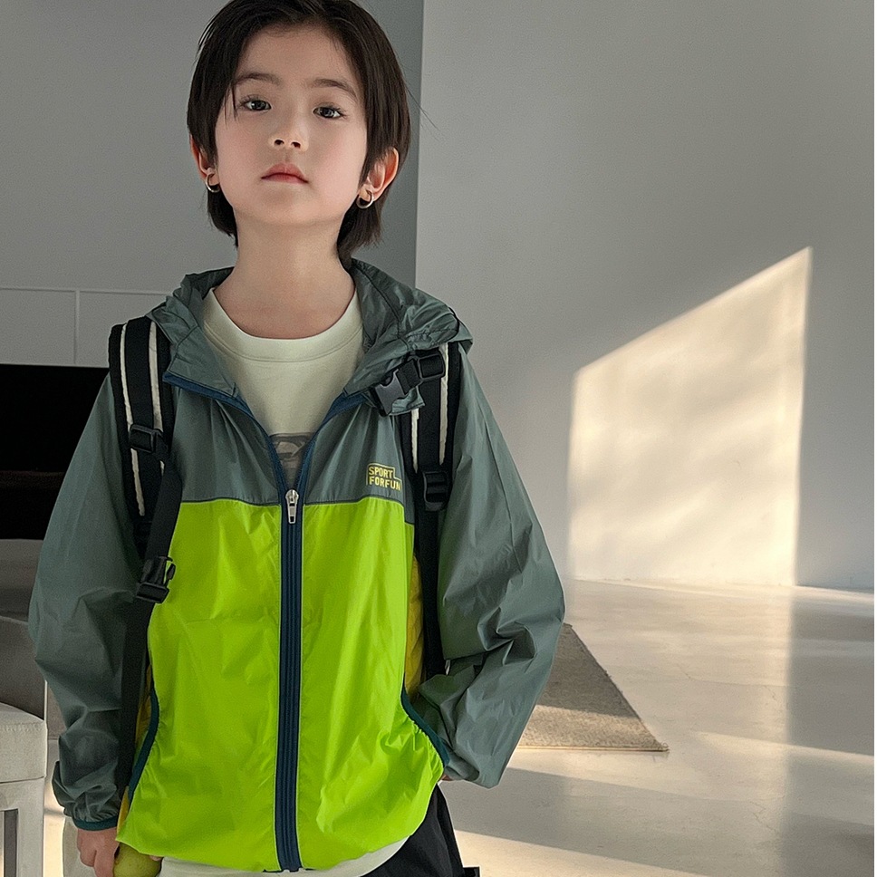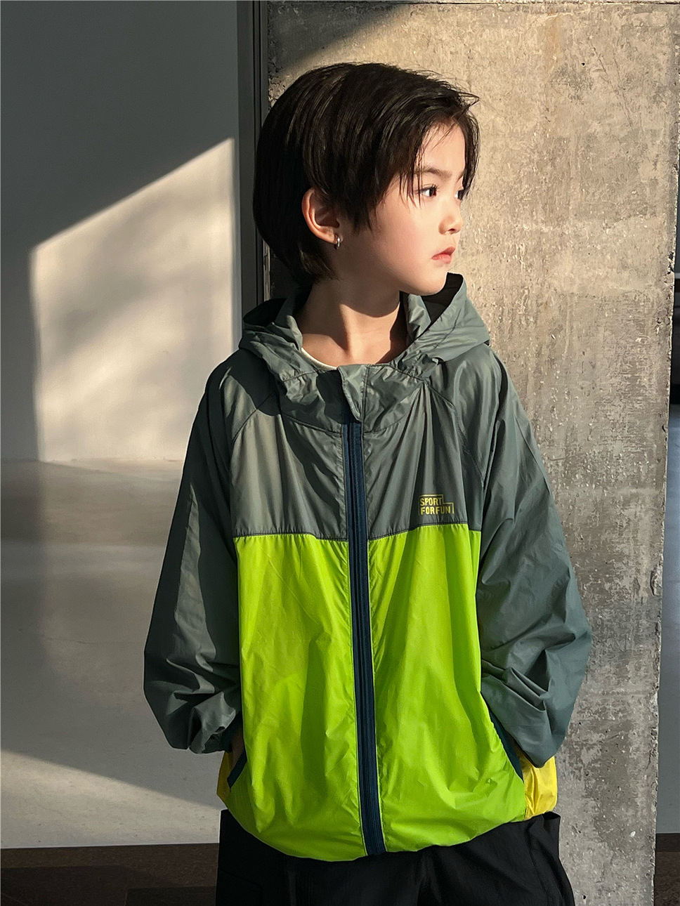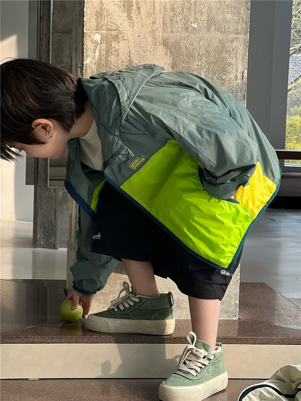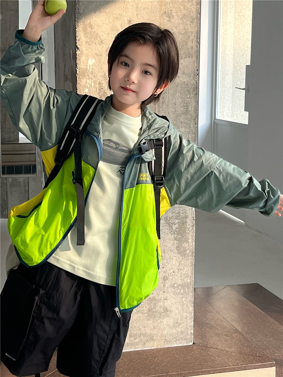 このウィンドブレーカーは、夏の強い日差しからお子様の肌を守る日焼け対策に特化しています。通気性に優れた素材で仕立てられているため、暑い日でもお子様が涼しく快適に過ごせるように配慮しました。男の子、女の子問わず着用できるユニセックスデザインで、Tシャツや薄手のトップスの上から羽織るだけで、おしゃれなレイヤードスタイルが完成します。普段使いはもちろん、アウトドアやレジャーシーンにもおすすめです。このパッチワークフーディウィンドブレーカージャケットは、お子様の日常の装いに彩りを添える一着です。