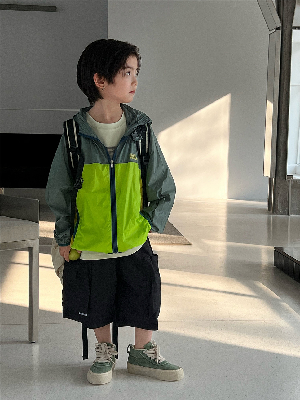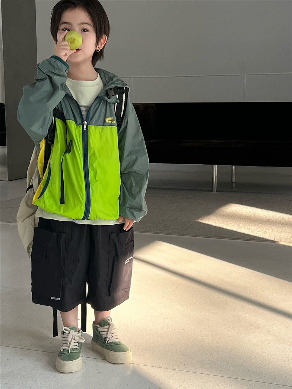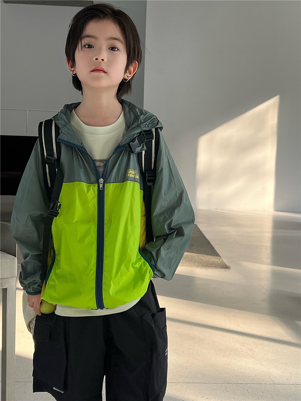 このウィンドブレーカーは、夏の強い日差しからお子様の肌を守る日焼け対策に特化しています。通気性に優れた素材で仕立てられているため、暑い日でもお子様が涼しく快適に過ごせるように配慮しました。男の子、女の子問わず着用できるユニセックスデザインで、Tシャツや薄手のトップスの上から羽織るだけで、おしゃれなレイヤードスタイルが完成します。普段使いはもちろん、アウトドアやレジャーシーンにもおすすめです。このパッチワークフーディウィンドブレーカージャケットは、お子様の日常の装いに彩りを添える一着です。