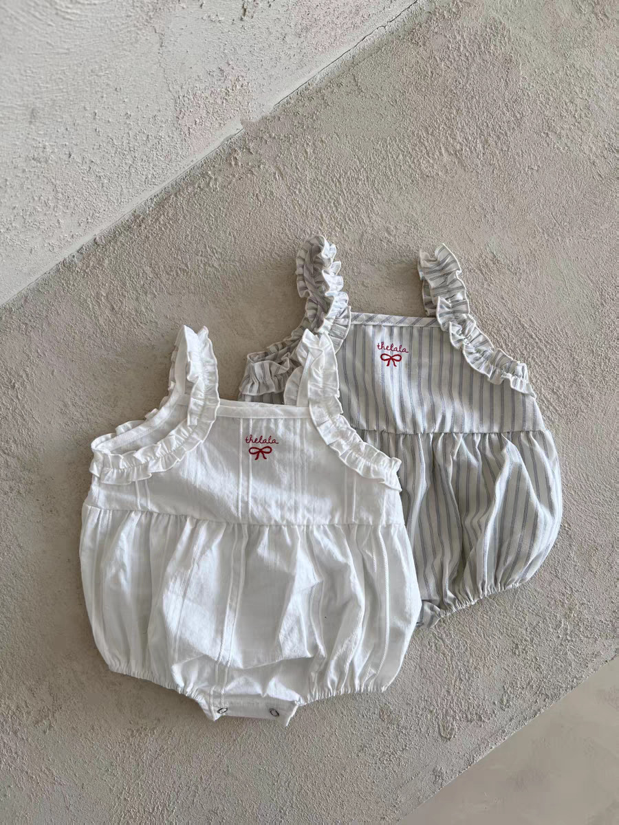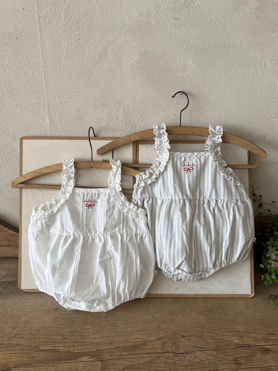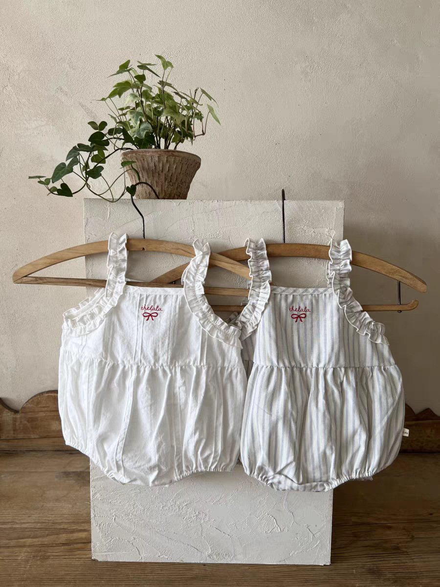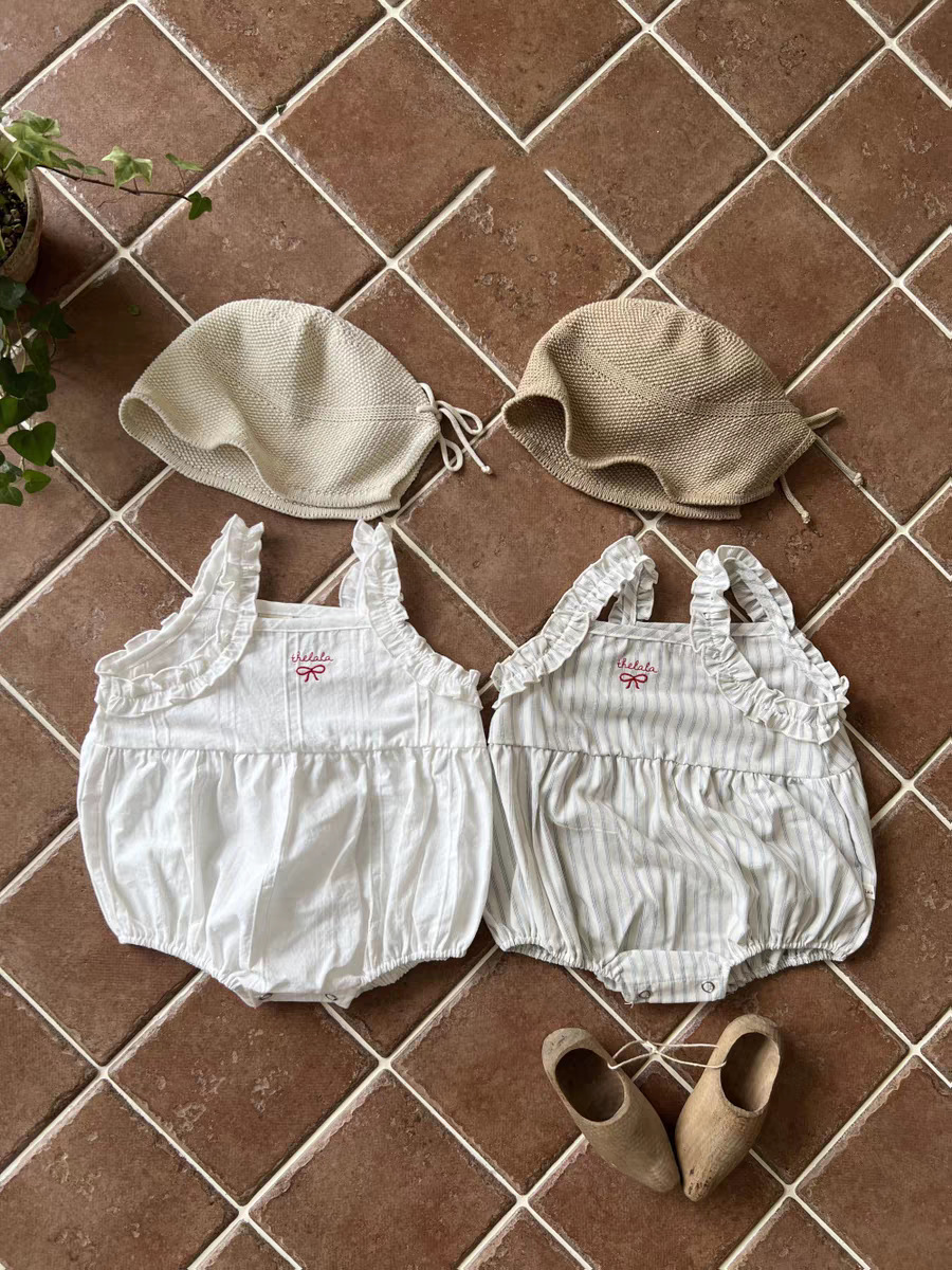 涼しげなキャミソールタイプで、肩紐には繊細なレースのリボンがあしらわれています。胸元や身頃にはフリルが施され、動くたびにふんわりと揺れてとってもキュート。柔らかな素材で肌触りも良く、暑い夏でも赤ちゃんは快適です。股下はスナップボタンで、おむつ替えもスムーズ。普段使いはもちろん、ちょっとしたお出かけや写真撮影にもおすすめですよ。