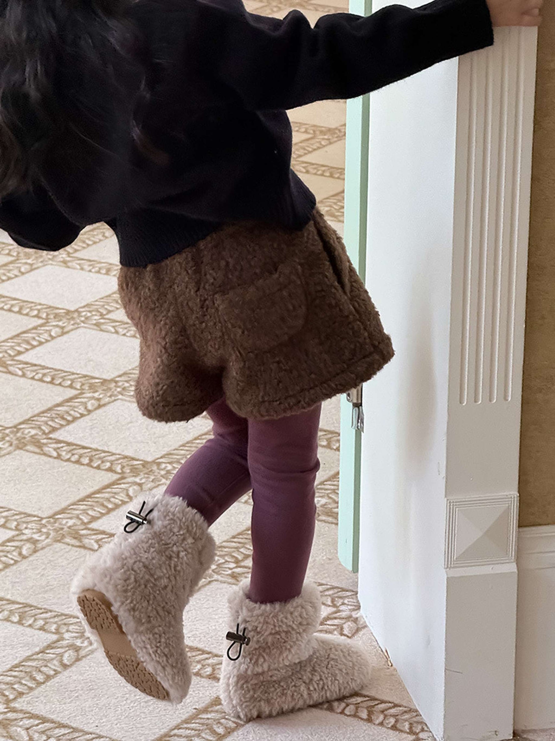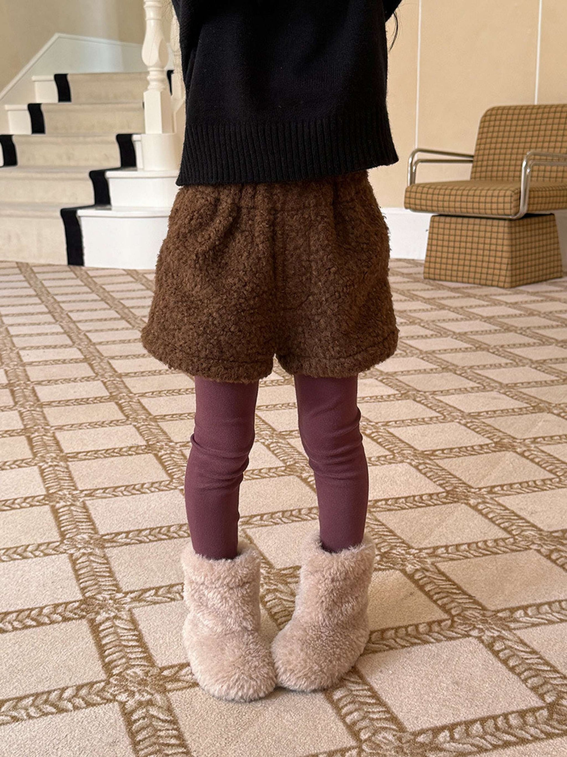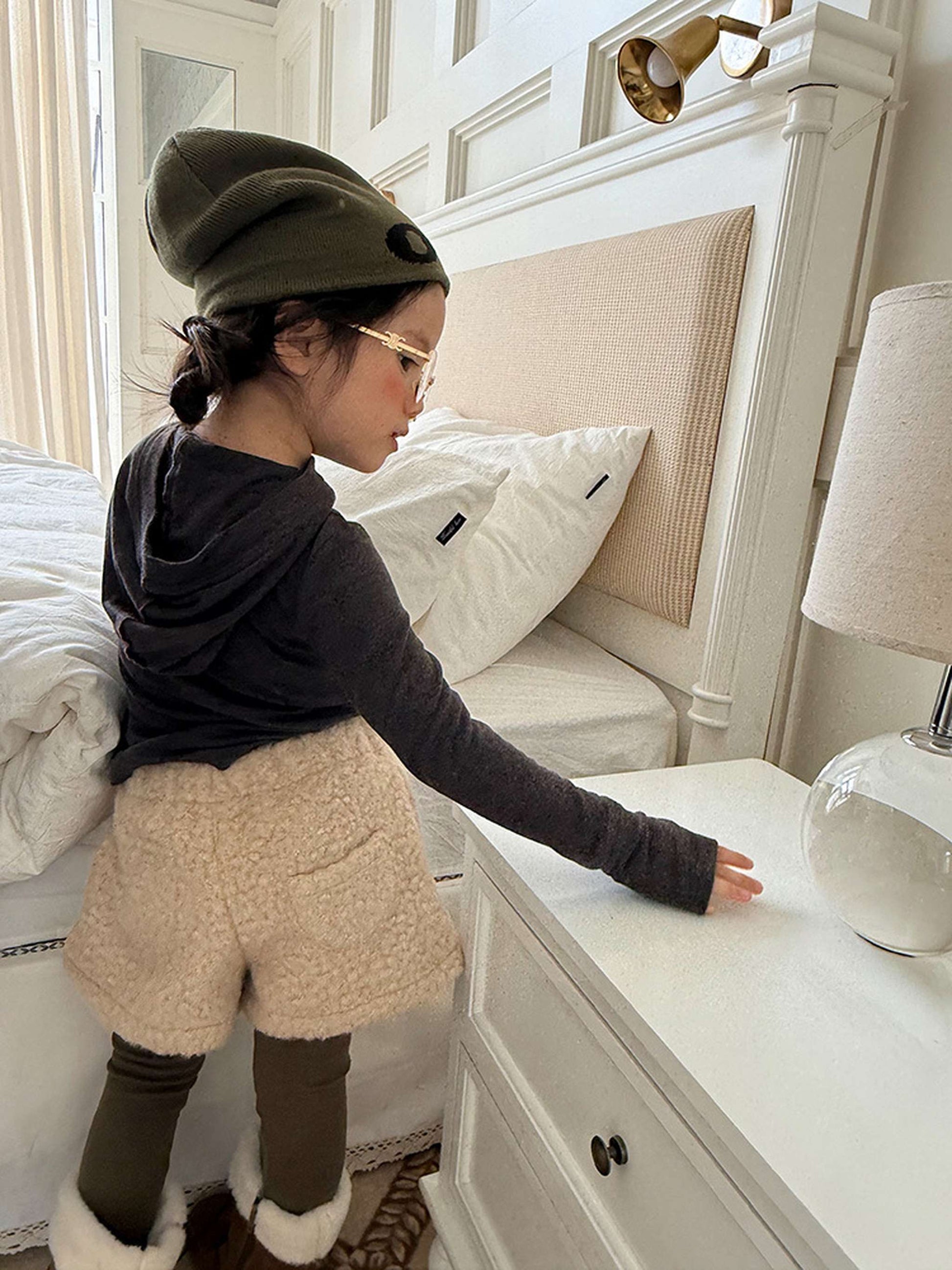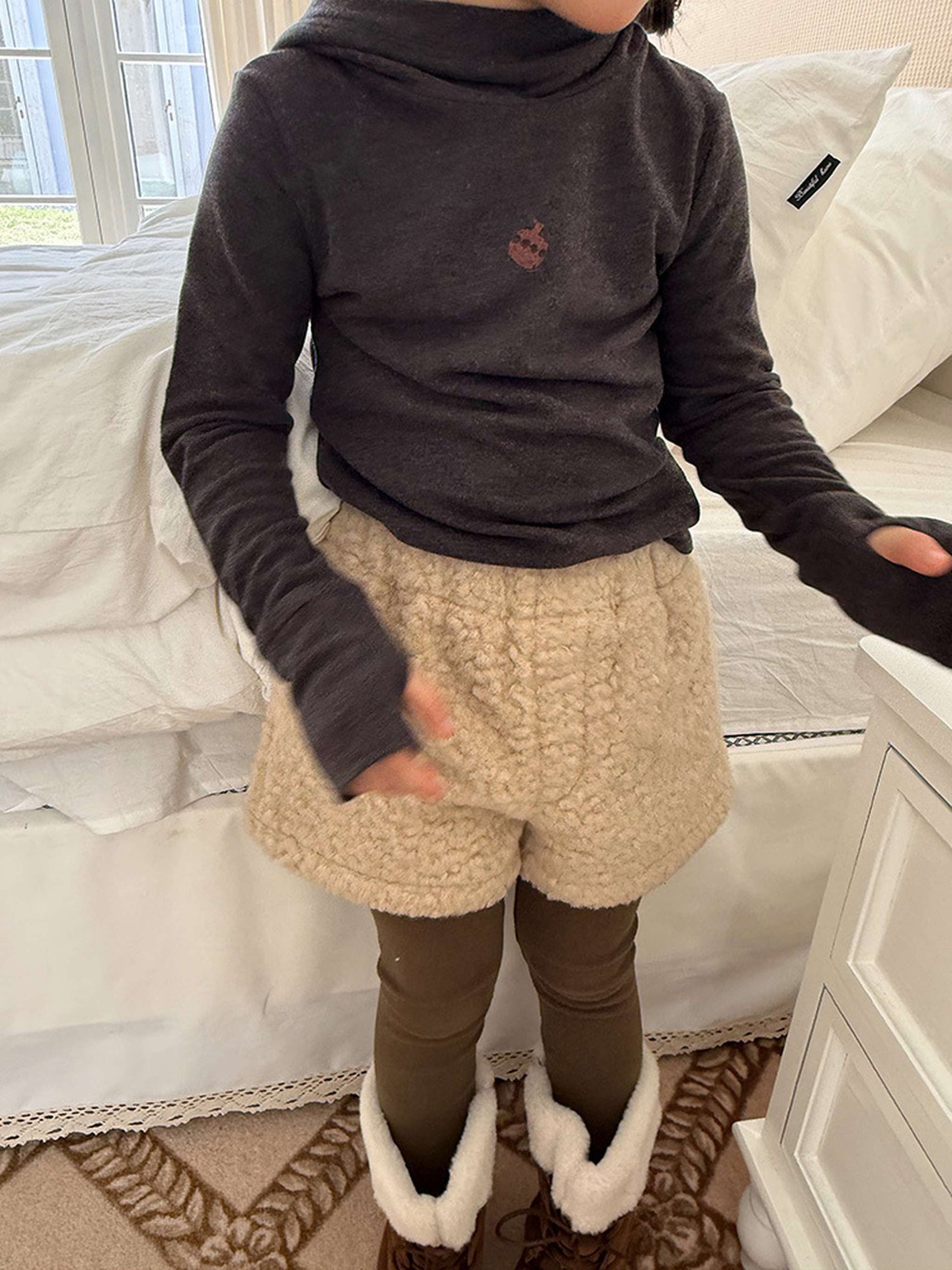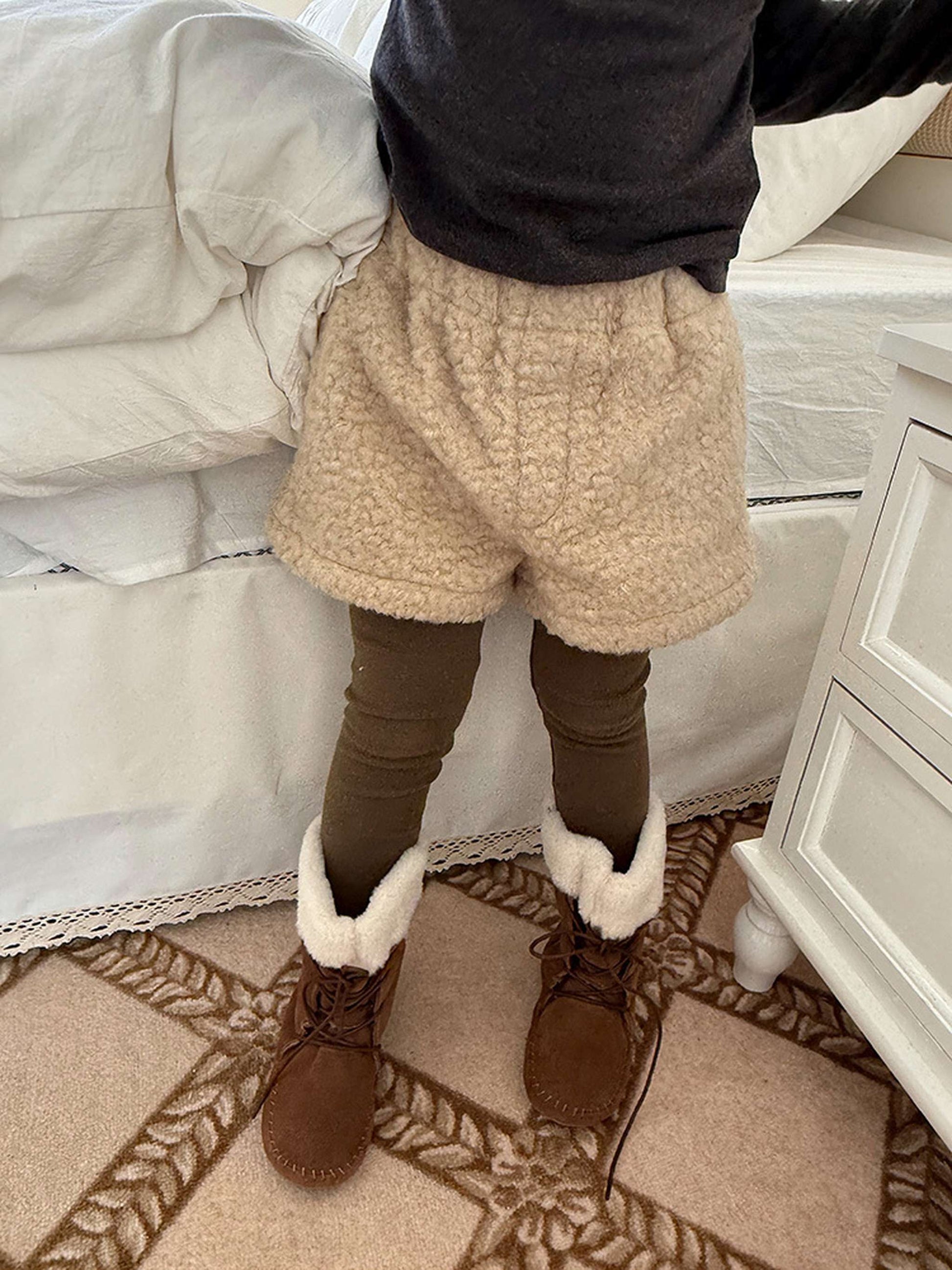 ふわふわのもこもこボアが愛らしいショートパンツは、秋冬の遊び着に暖かさをプラスするボトムスです。無地のデザインに施されたウエストのギャザーが、シンプルな中に洗練された子どもらしい可愛らしさを演出します。裏地付きで厚手の仕上がりは、元気に動き回るキッズの防寒を叶え、レギンスとの重ね着でおしゃれなレイヤードスタイルも楽しめます。