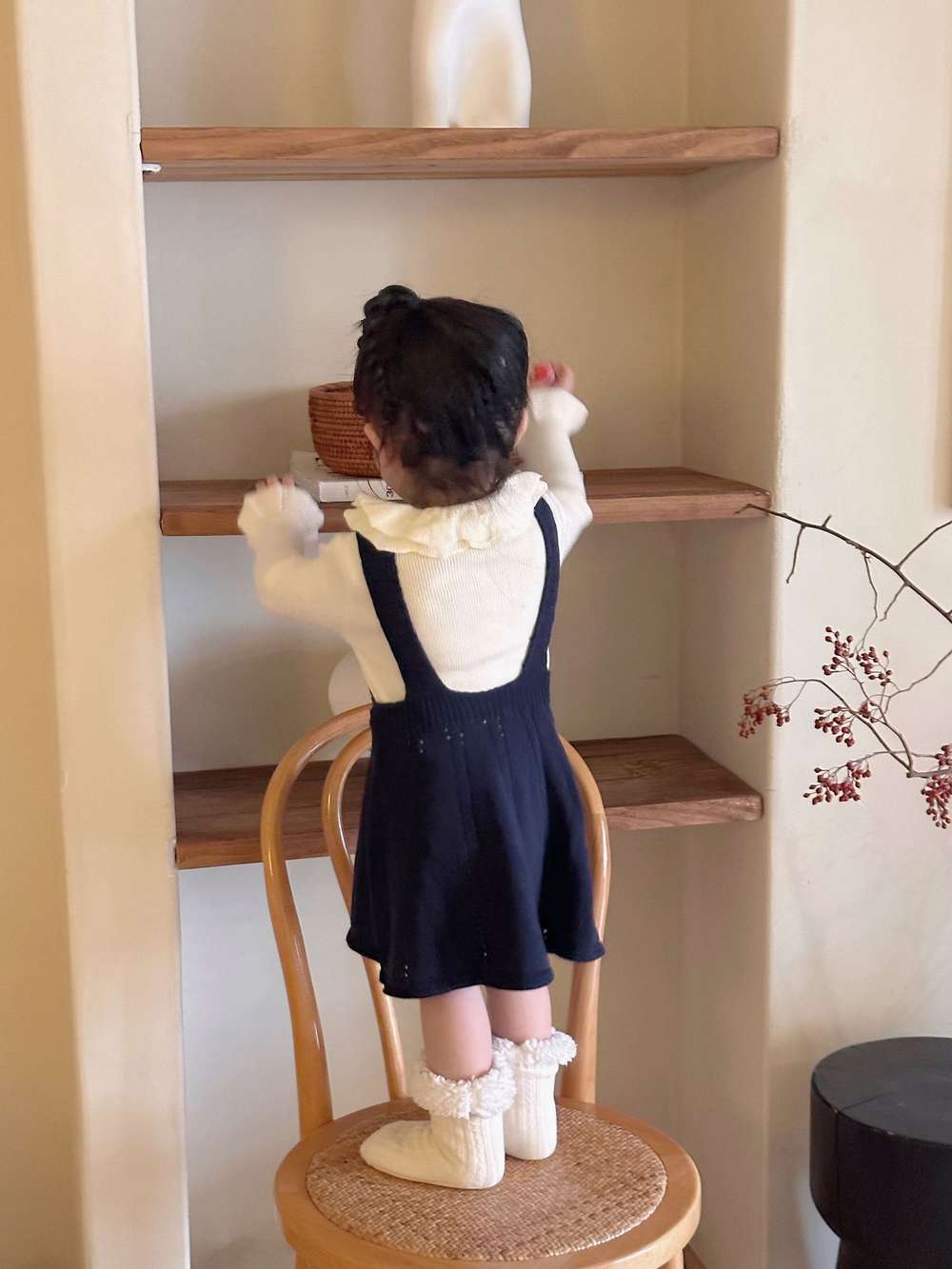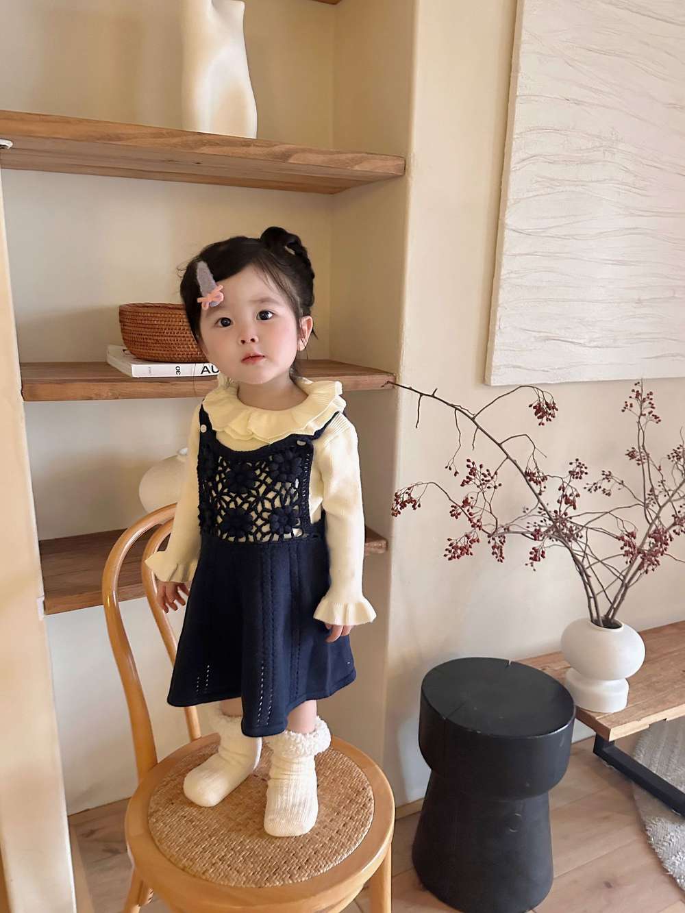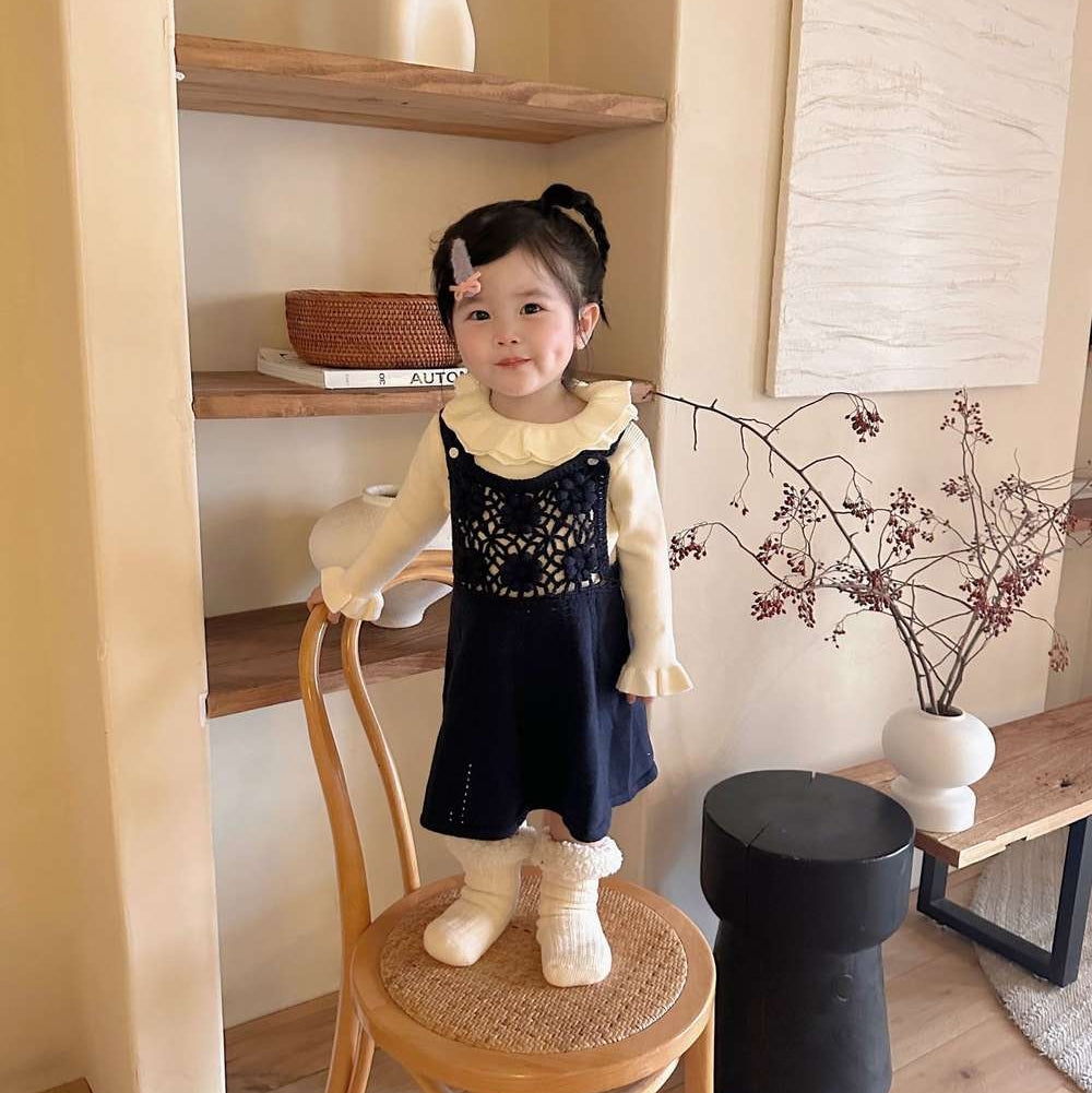 手編み風のフラワーモチーフがあしらわれたノースリーブのクロシェワンピースは、レイヤードスタイルをエレガントに彩る主役級のドレスです。セットのリブセーターは、フリル襟とフリル袖が特徴的なデザインで、単体でも高い着回し力を発揮します。この組み合わせは、ノスタルジックでありながら洗練された子ども服のコーディネートを完成させ、それぞれ別のアイテムと合わせることで多彩なスタイルがお楽しみいただけます。
