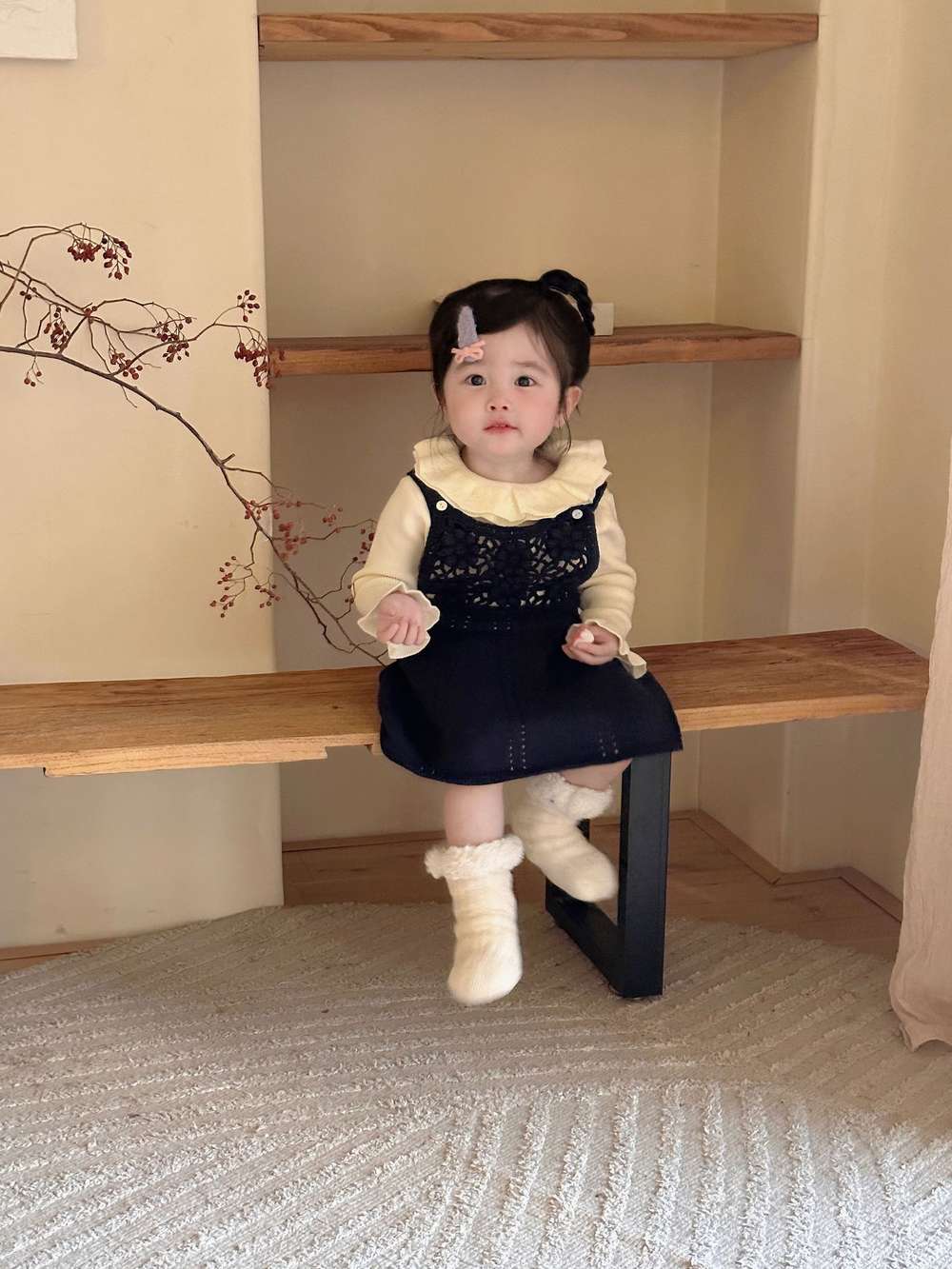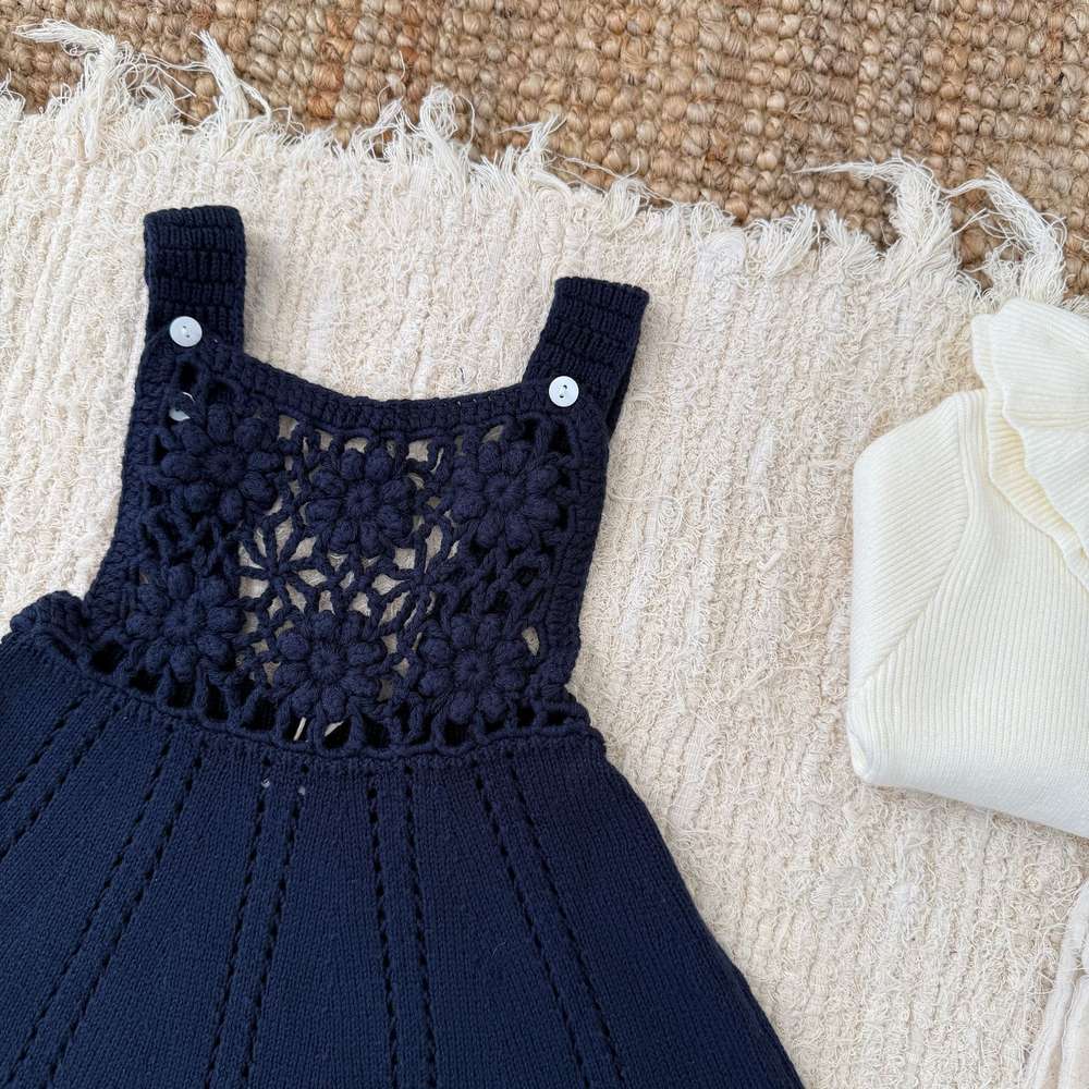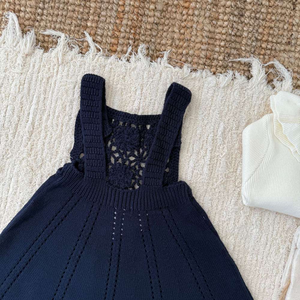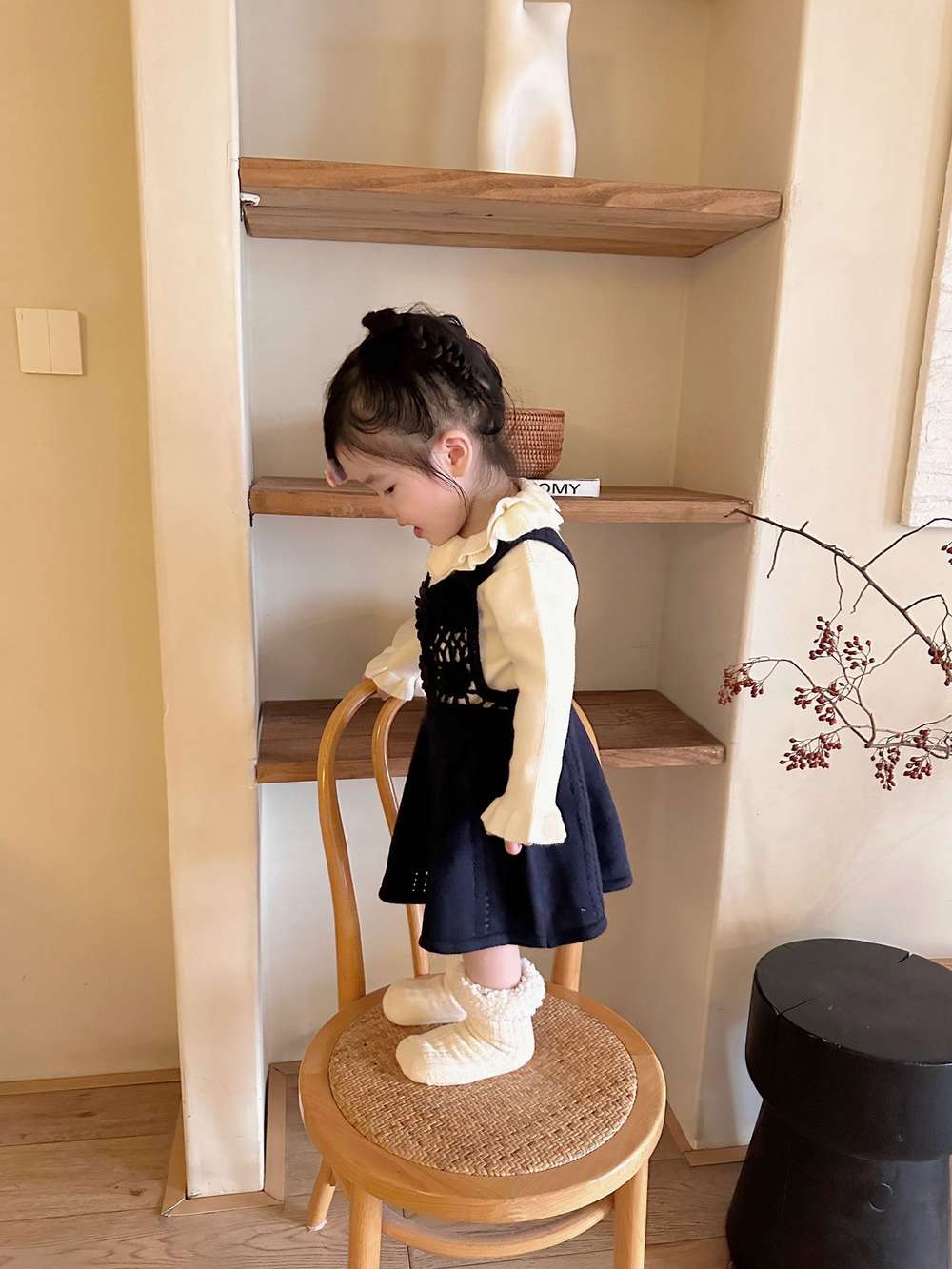 手編み風のフラワーモチーフがあしらわれたノースリーブのクロシェワンピースは、レイヤードスタイルをエレガントに彩る主役級のドレスです。セットのリブセーターは、フリル襟とフリル袖が特徴的なデザインで、単体でも高い着回し力を発揮します。この組み合わせは、ノスタルジックでありながら洗練された子ども服のコーディネートを完成させ、それぞれ別のアイテムと合わせることで多彩なスタイルがお楽しみいただけます。