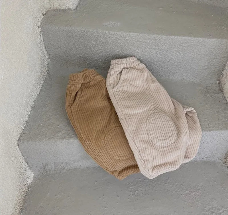 肌触りの良いコーデュロイ生地とおしゃれなデザインが特徴の、キッズ向けルーズパンツが新登場。膝にはしっかりとしたパッチが施され、耐久性も抜群です。ベージュとブラウンの2カラーをご用意し、お子様のスタイリッシュなコーディネートをサポートします。動きやすいので、アクティブなお子様にも最適です。