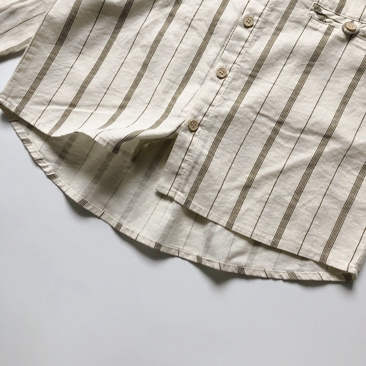 キッズ服の新しいコレクションから、コットンリネンのシャツです。長袖で、ストライプ柄のこなれたデザインが特徴ですが、お子様の快適さを考慮して、ゆったりルーズシルエットで、耐久性も高い素材で作られています。かわいいルックスと機能的なデザインが融合した、お子様におすすめの服です。