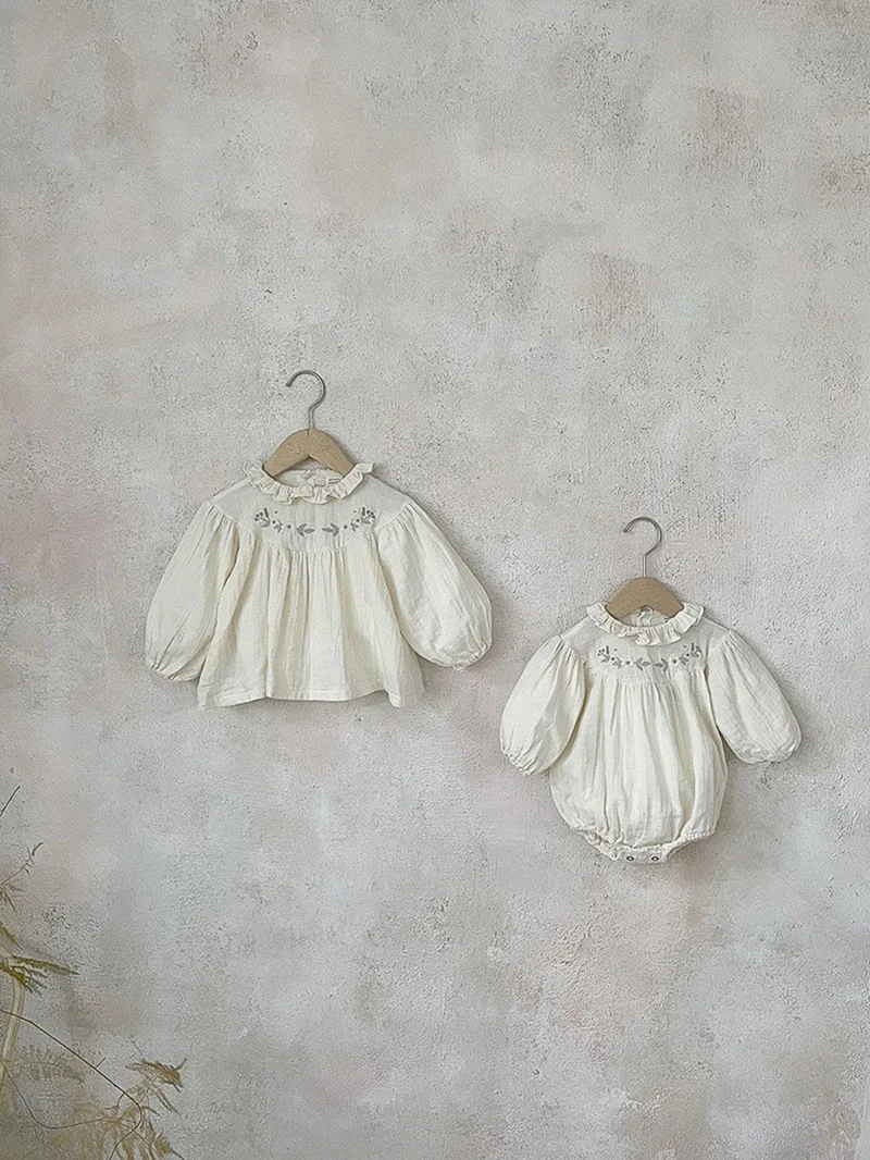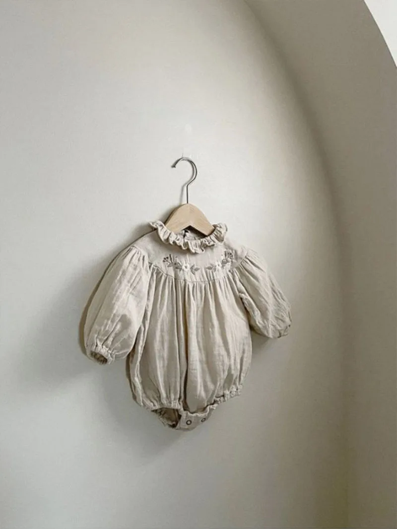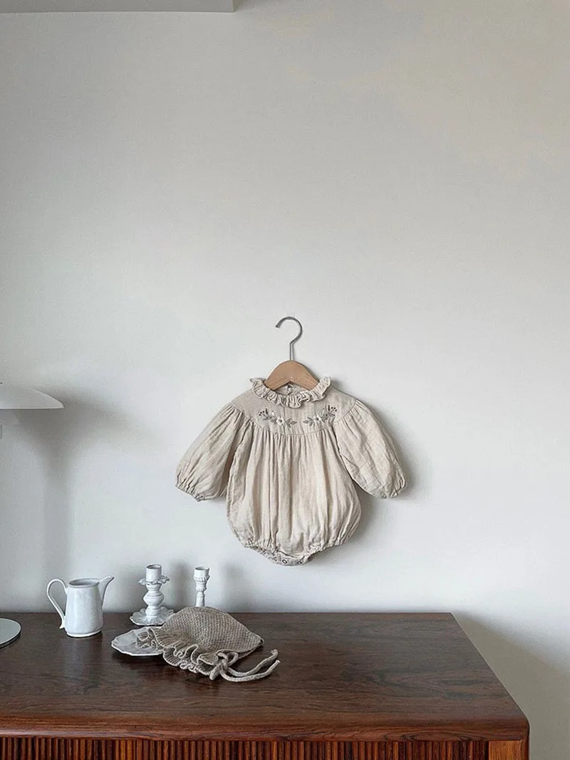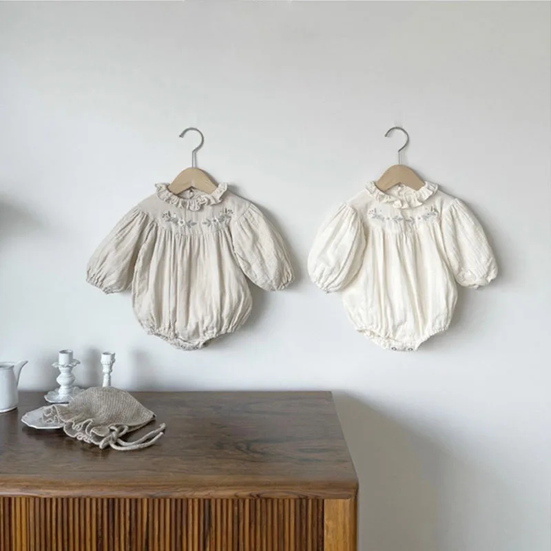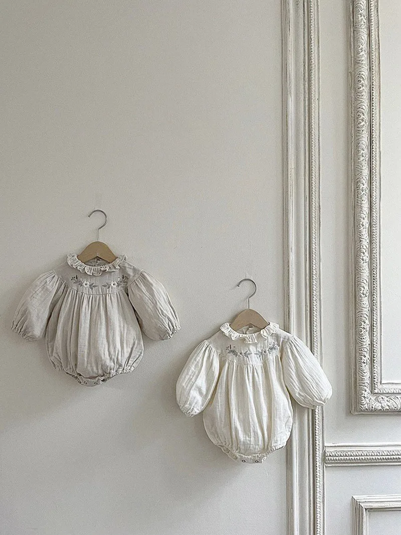 ベビー 長袖ロンパース フラワー刺繍 花柄 フリルカラー フリル クリーム グレー 2カラー ガールズ 女の子 子供服