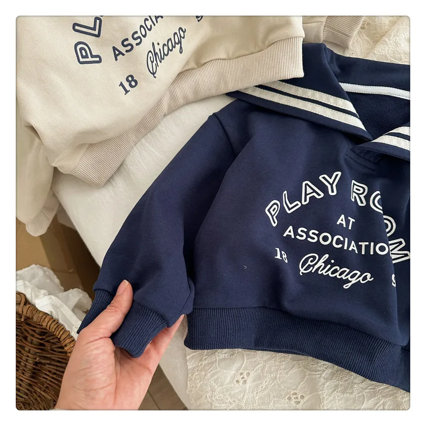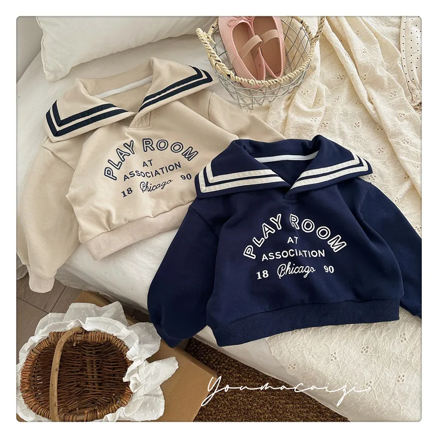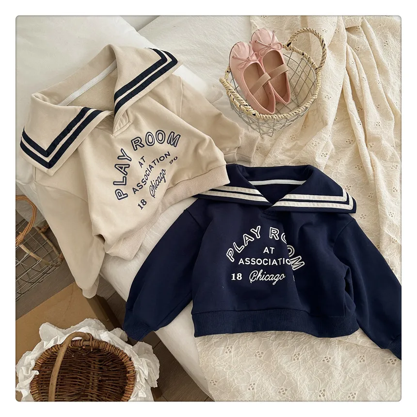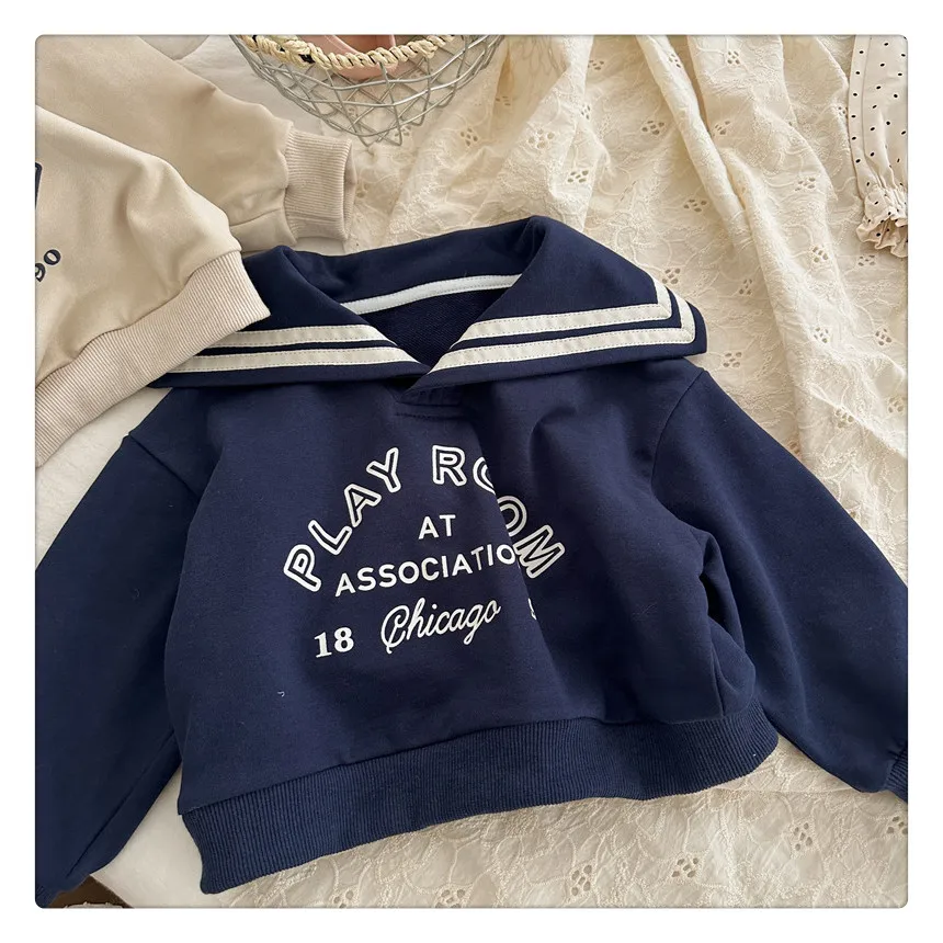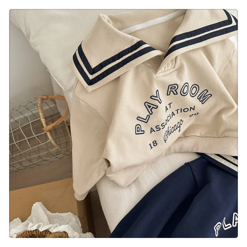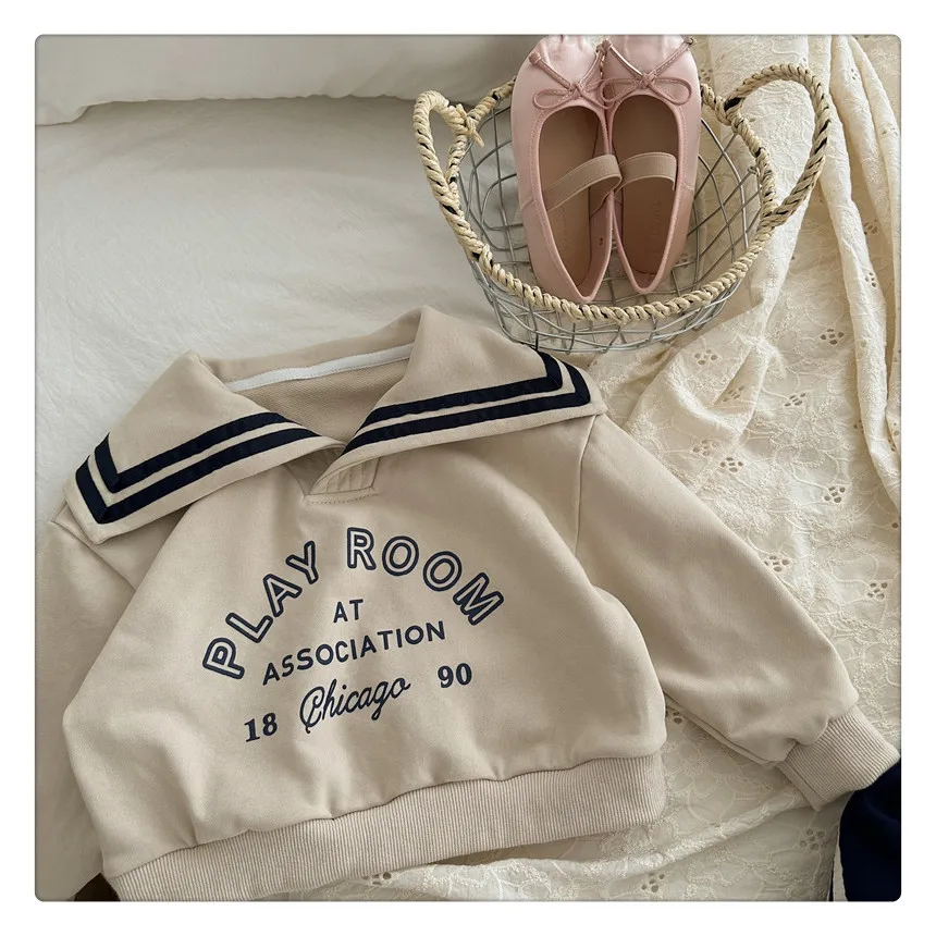 キッズトップス セーラーカラー 長袖スウェットシャツ レターロゴプリント ベージュ/ネイビー/2カラー