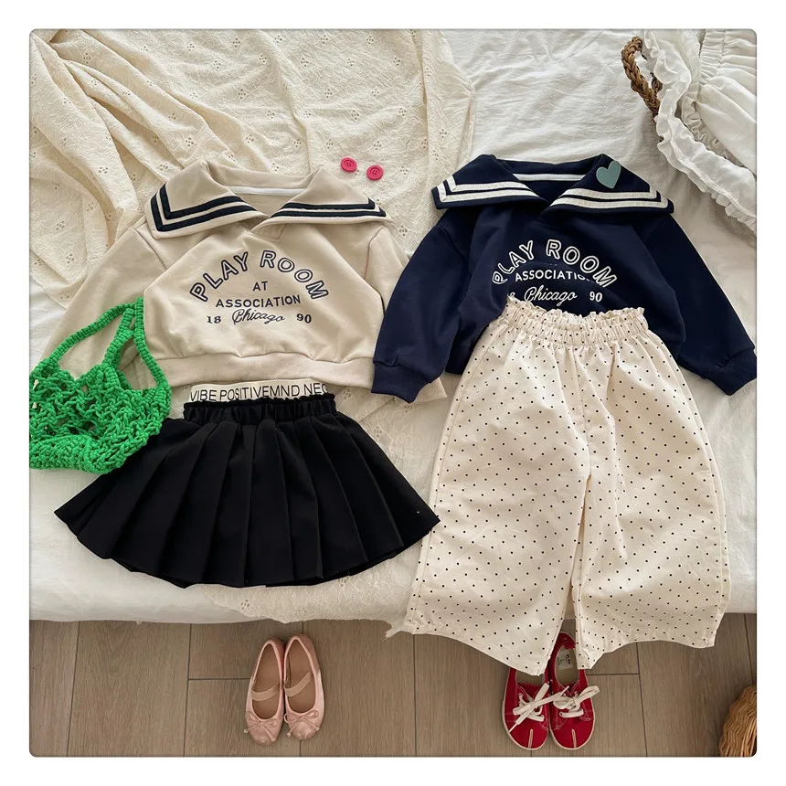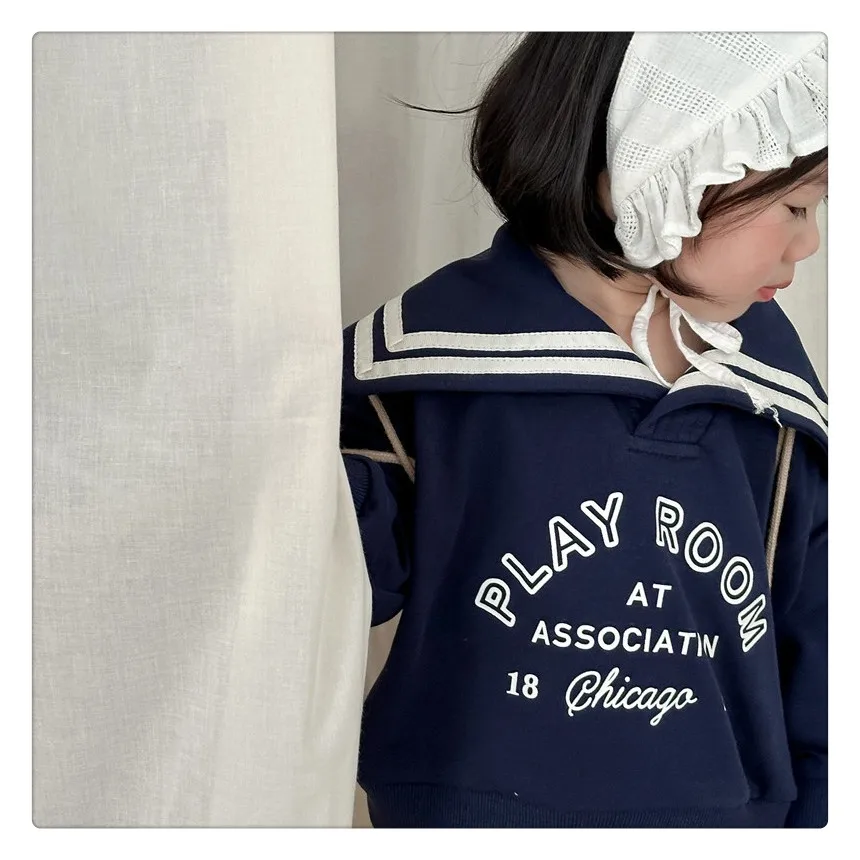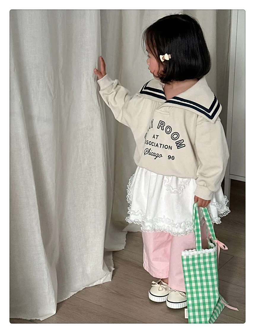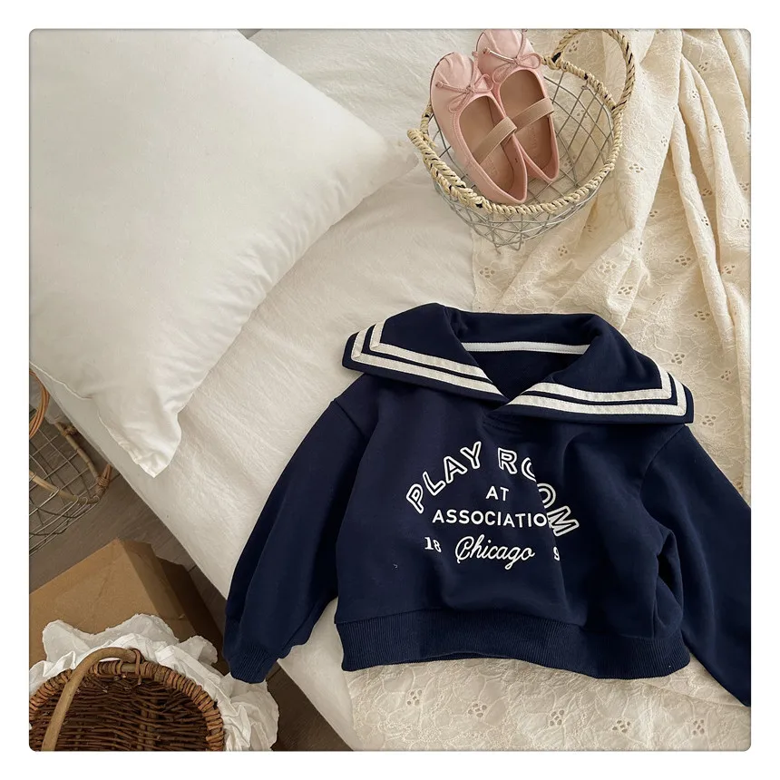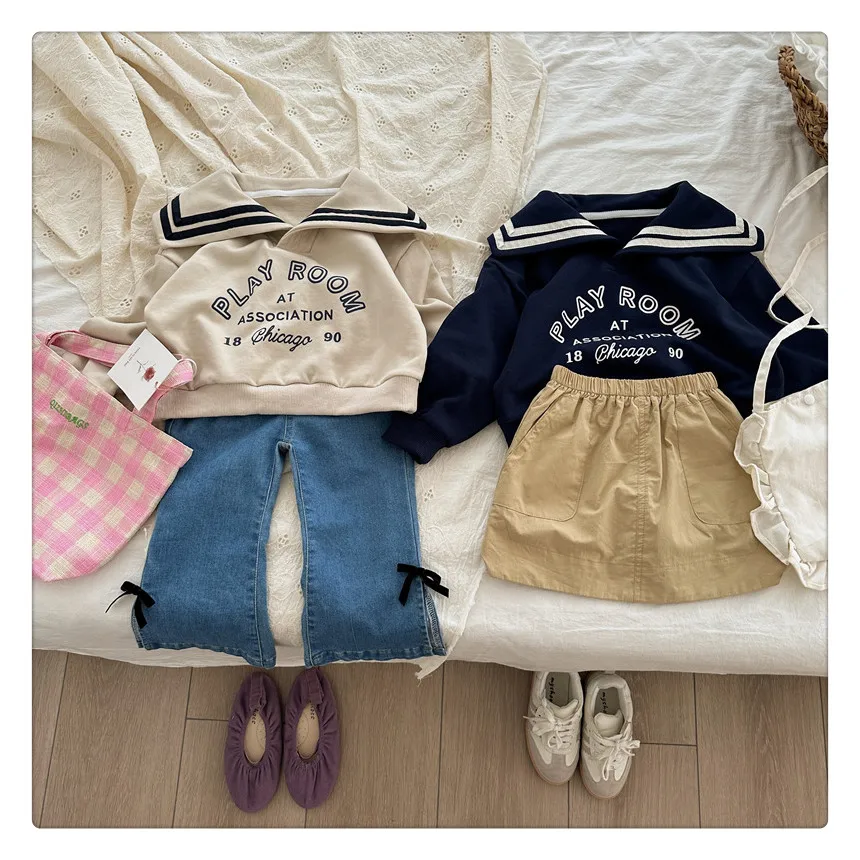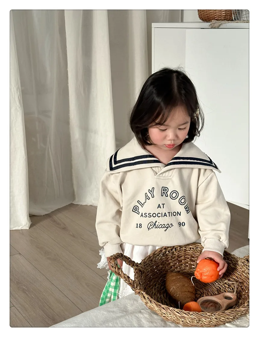 キッズトップス セーラーカラー 長袖スウェットシャツ レターロゴプリント ベージュ/ネイビー/2カラー