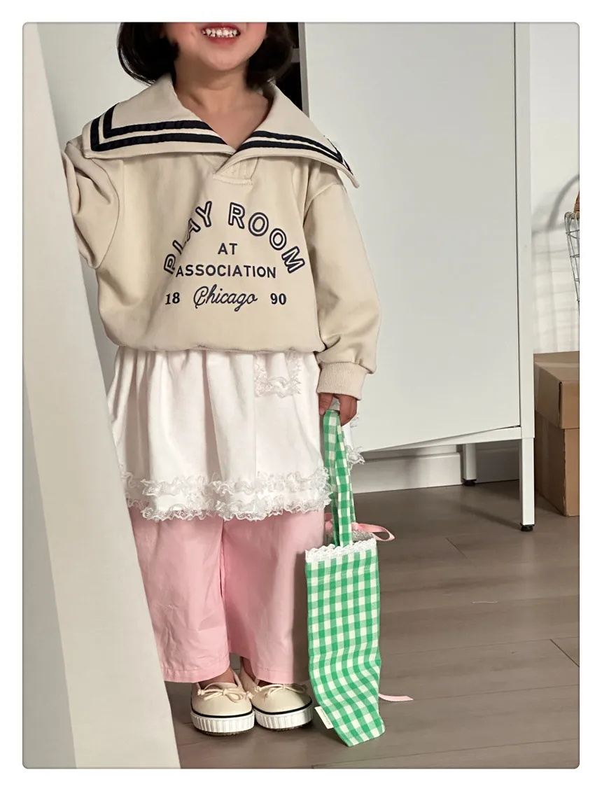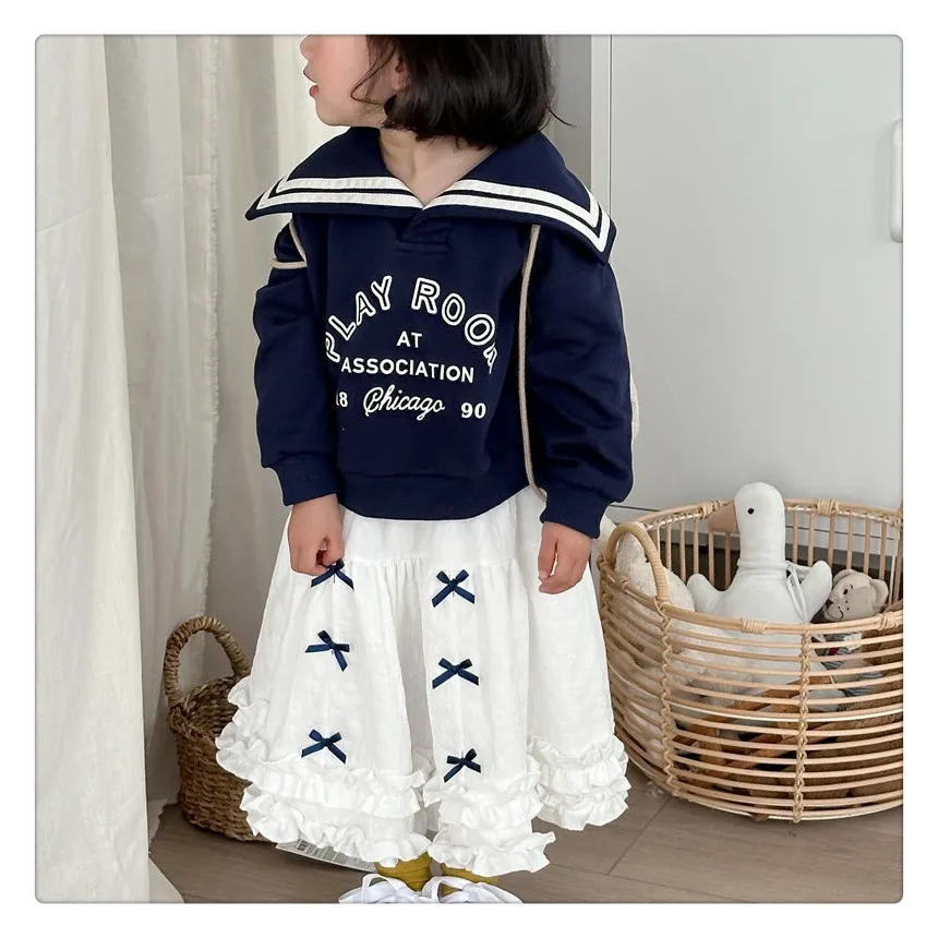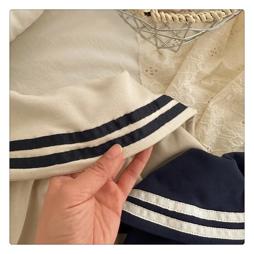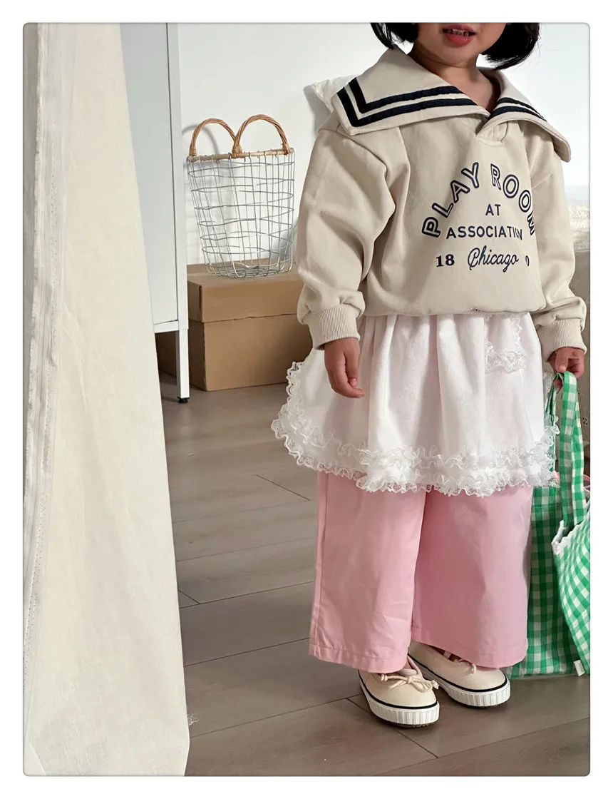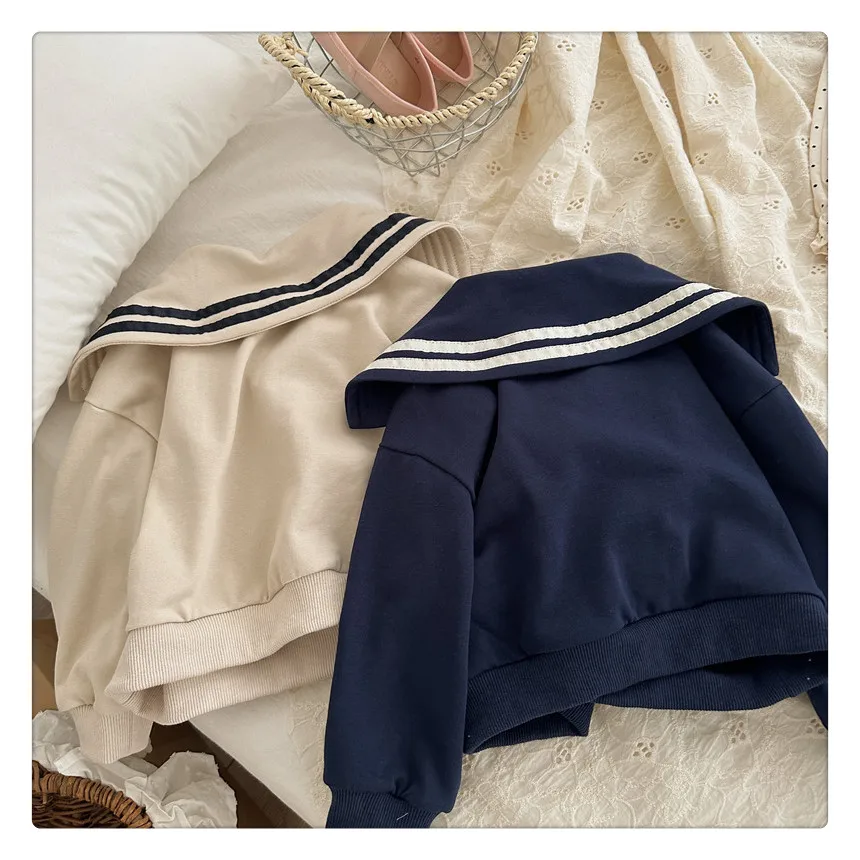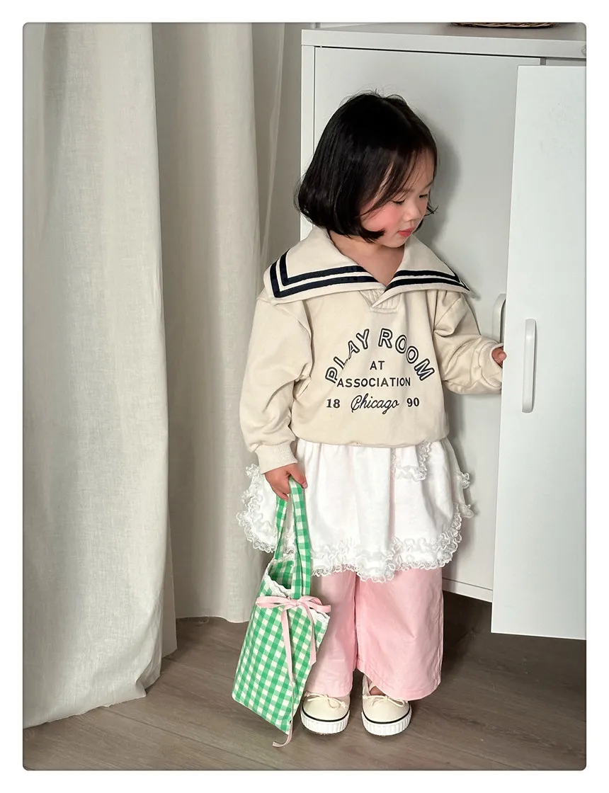 キッズトップス セーラーカラー 長袖スウェットシャツ レターロゴプリント ベージュ/ネイビー/2カラー