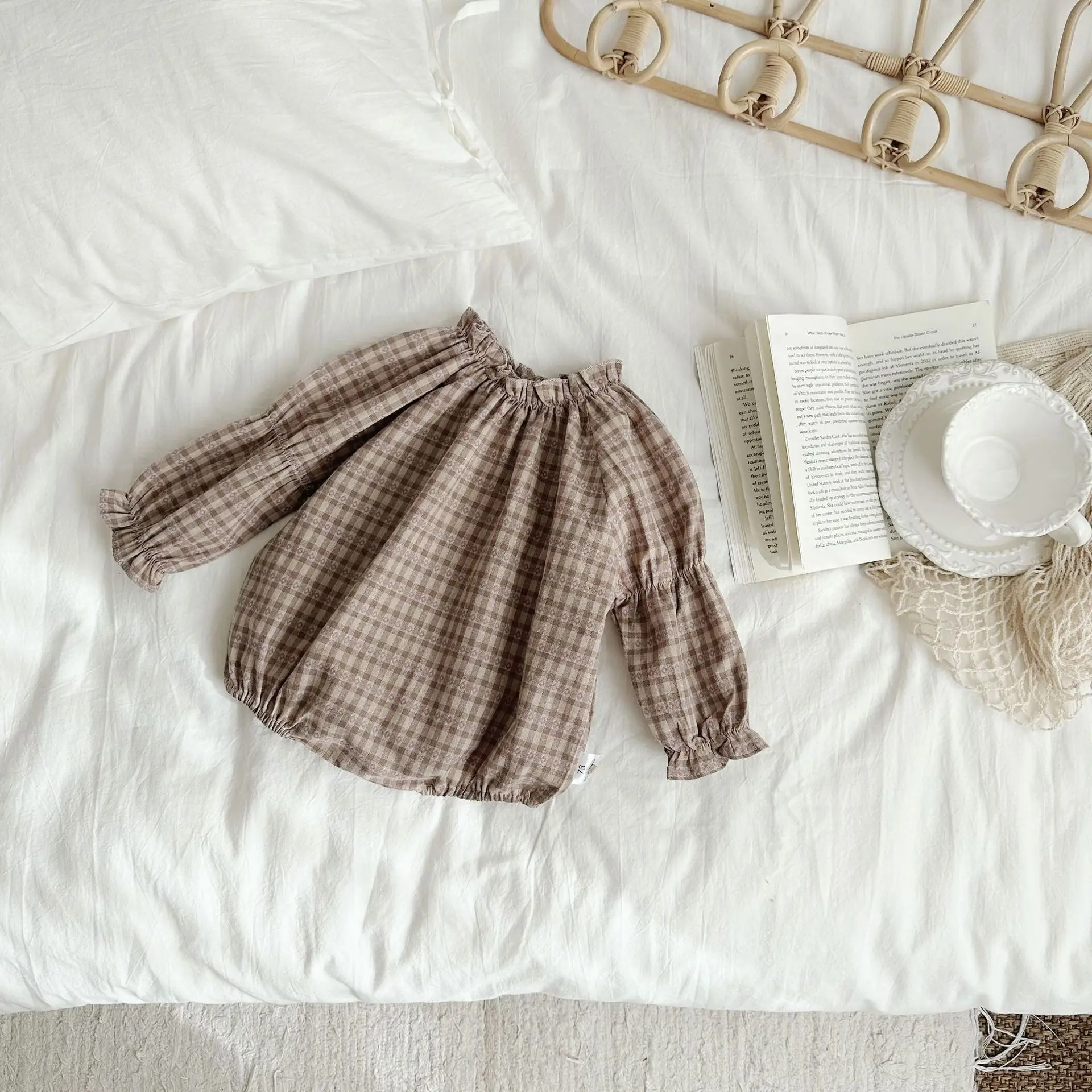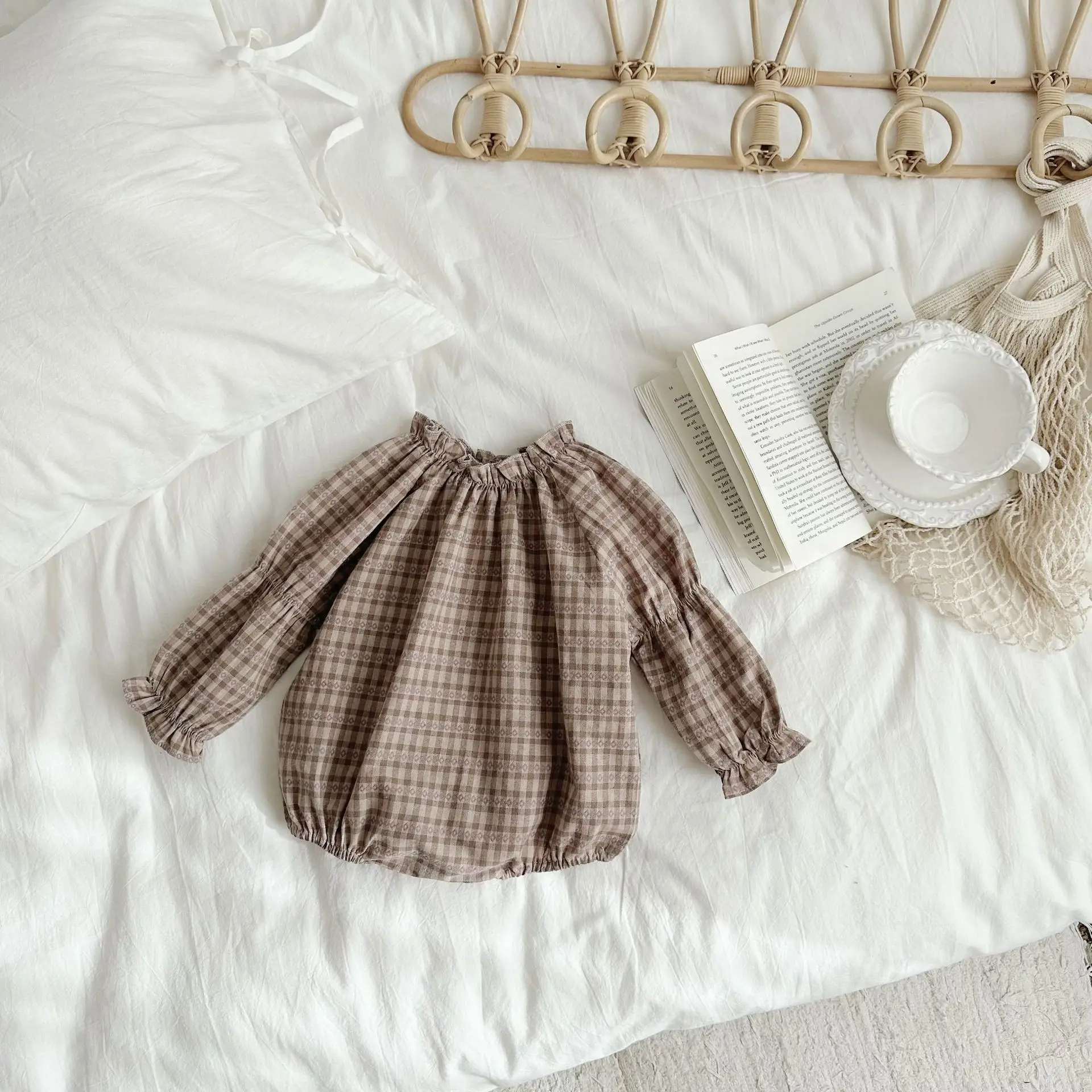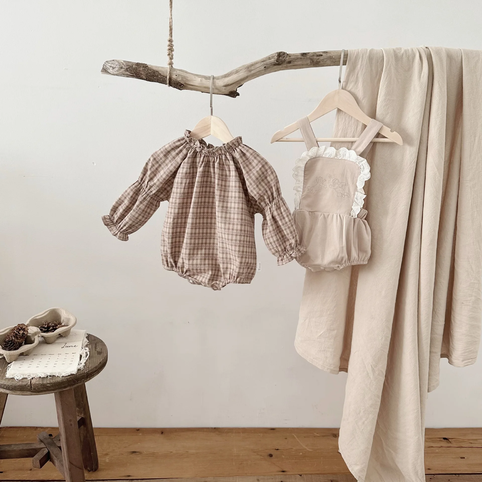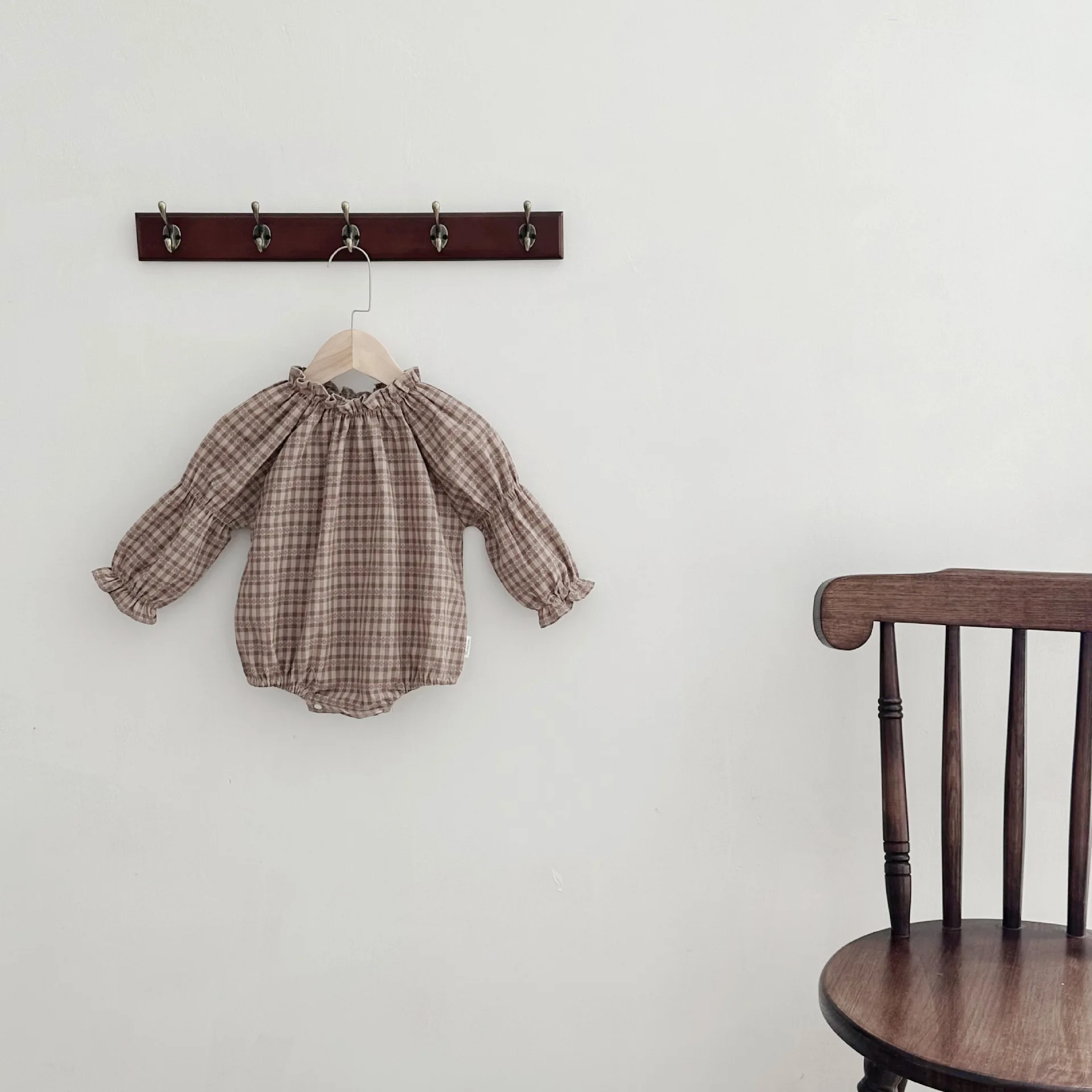 ベビーロンパース チェック柄 フリル襟 長袖ボディスーツ