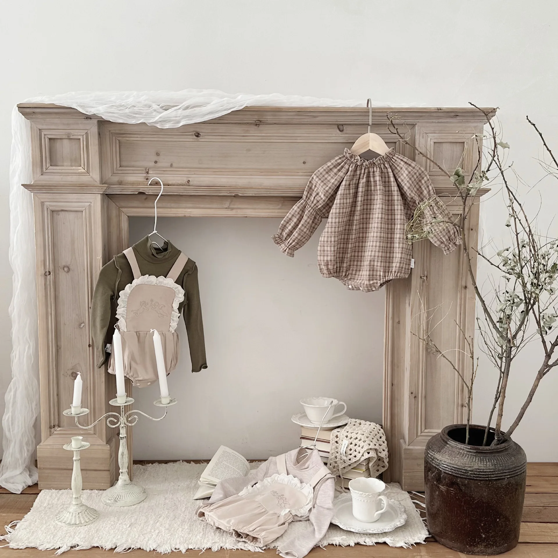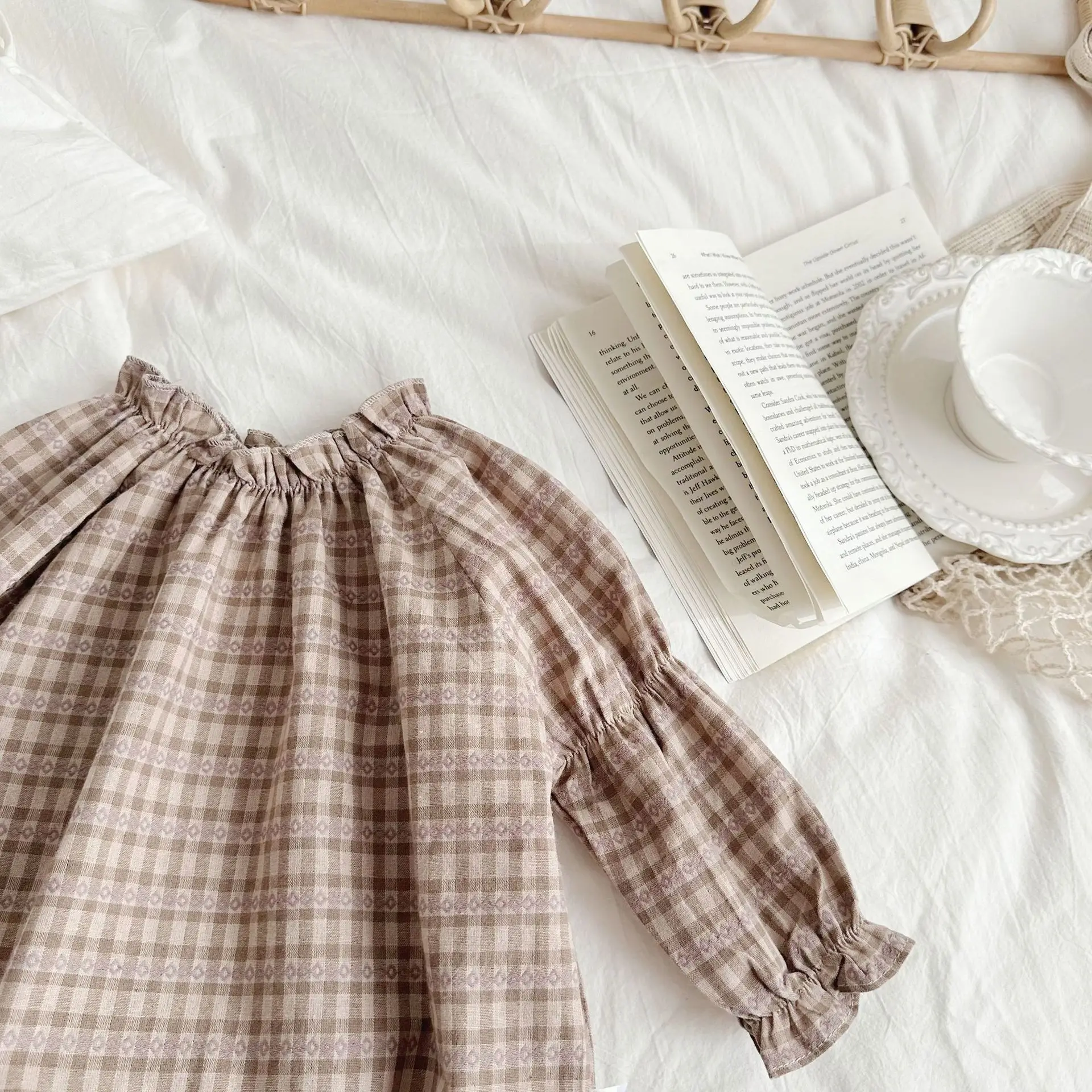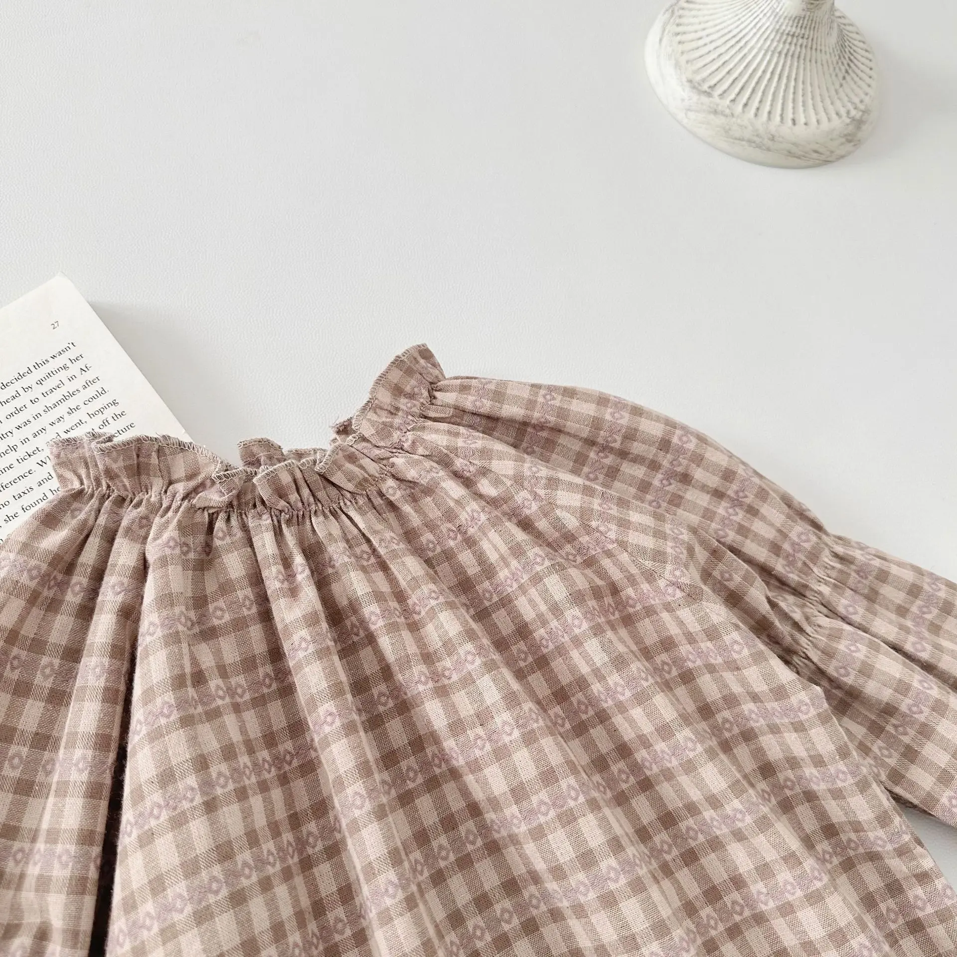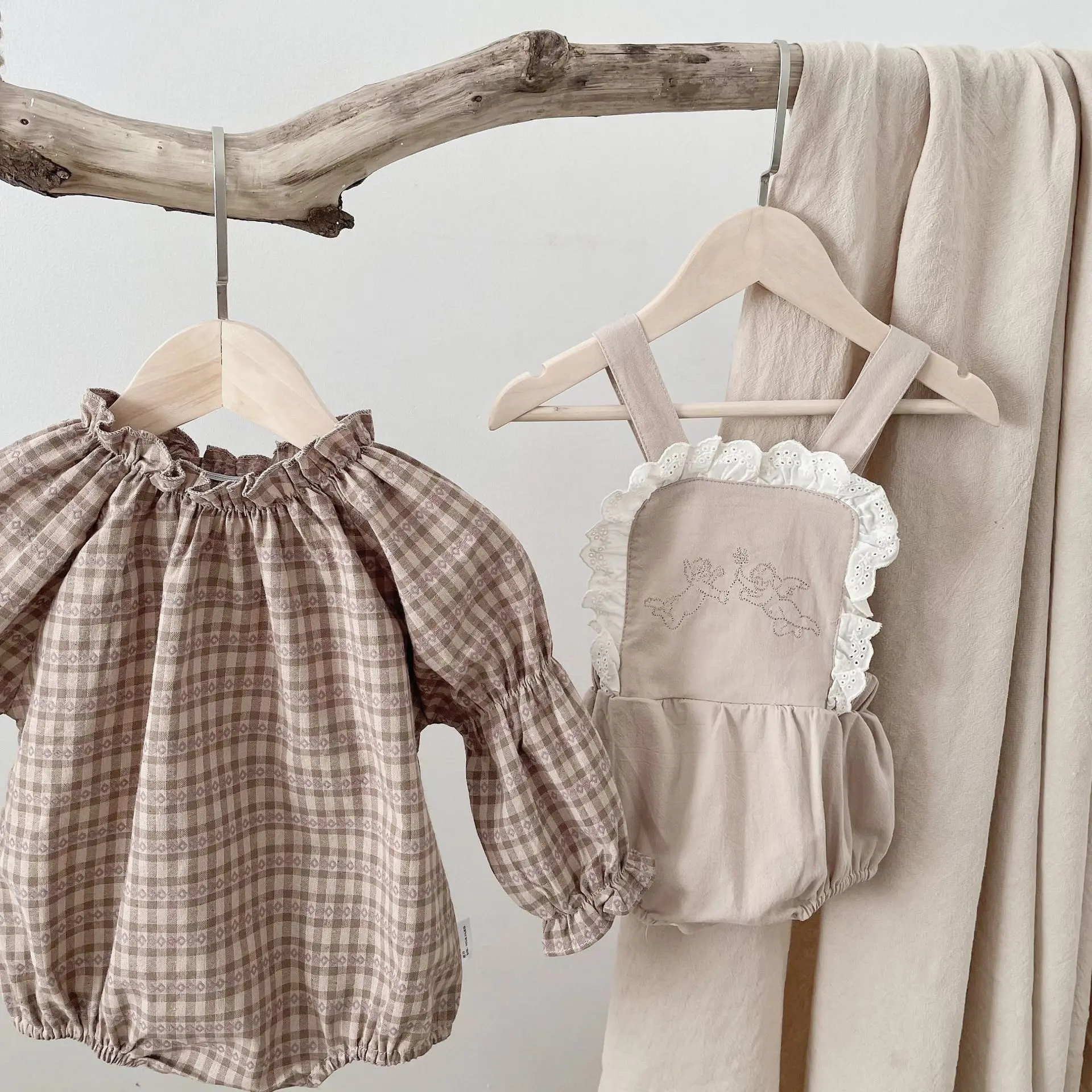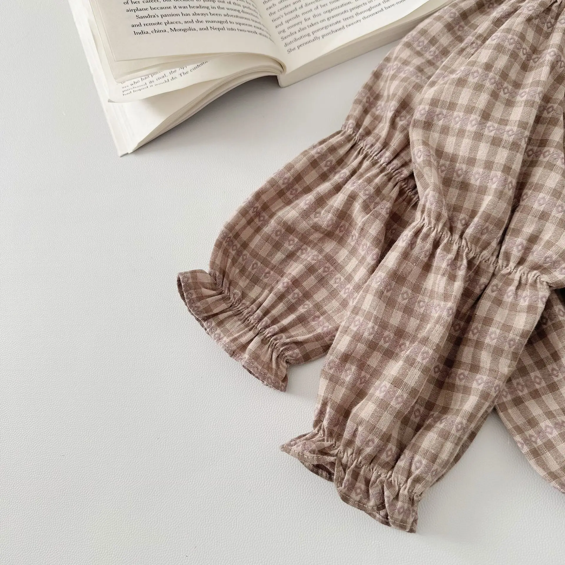 ベビーロンパース チェック柄 フリル襟 長袖ボディスーツ