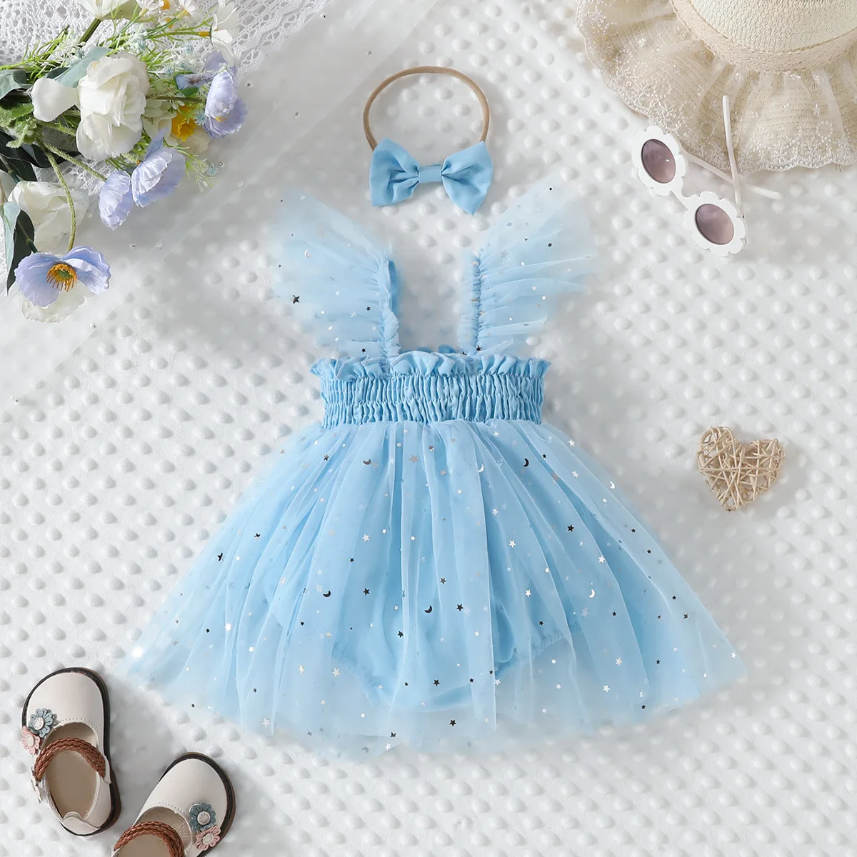 ベビーロンパース チュチュ チュールスカート スパンコール ベビードレス リボンヘアバンドセット 3カラー