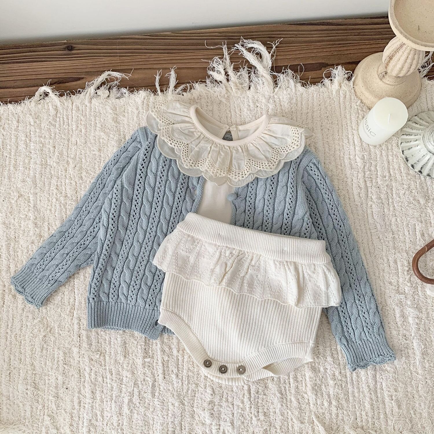 コットンをベースにした柔らかな糸で、立体感のあるケーブル編みと繊細な透かし編みを組み合わせた贅沢な仕立てのカーディガンです。お子様の肌を優しく包み込むソフトな質感で、チクチクしにくく、デイリーからお出かけまで幅広く活躍します。
