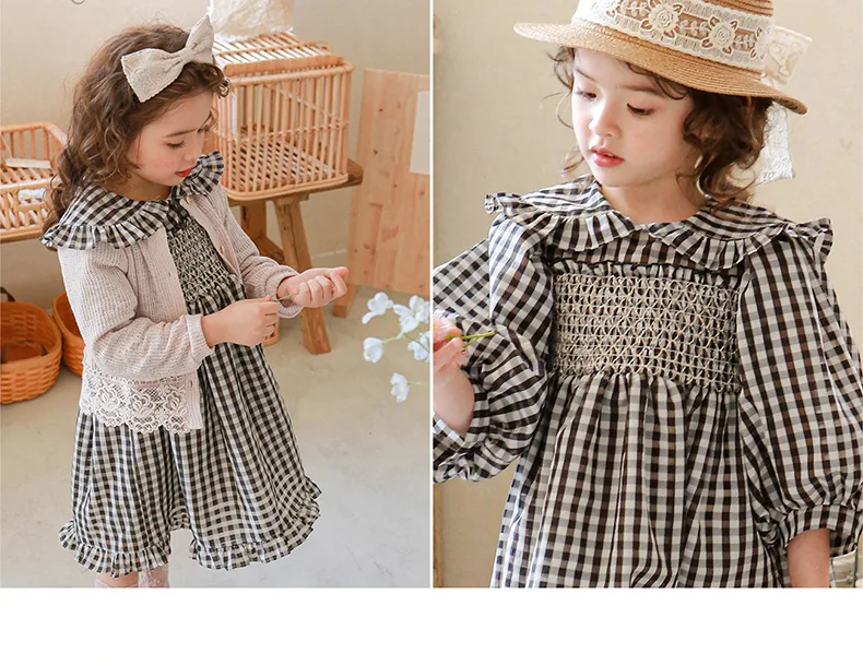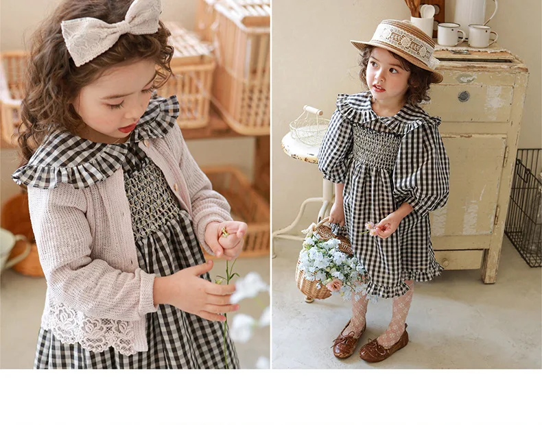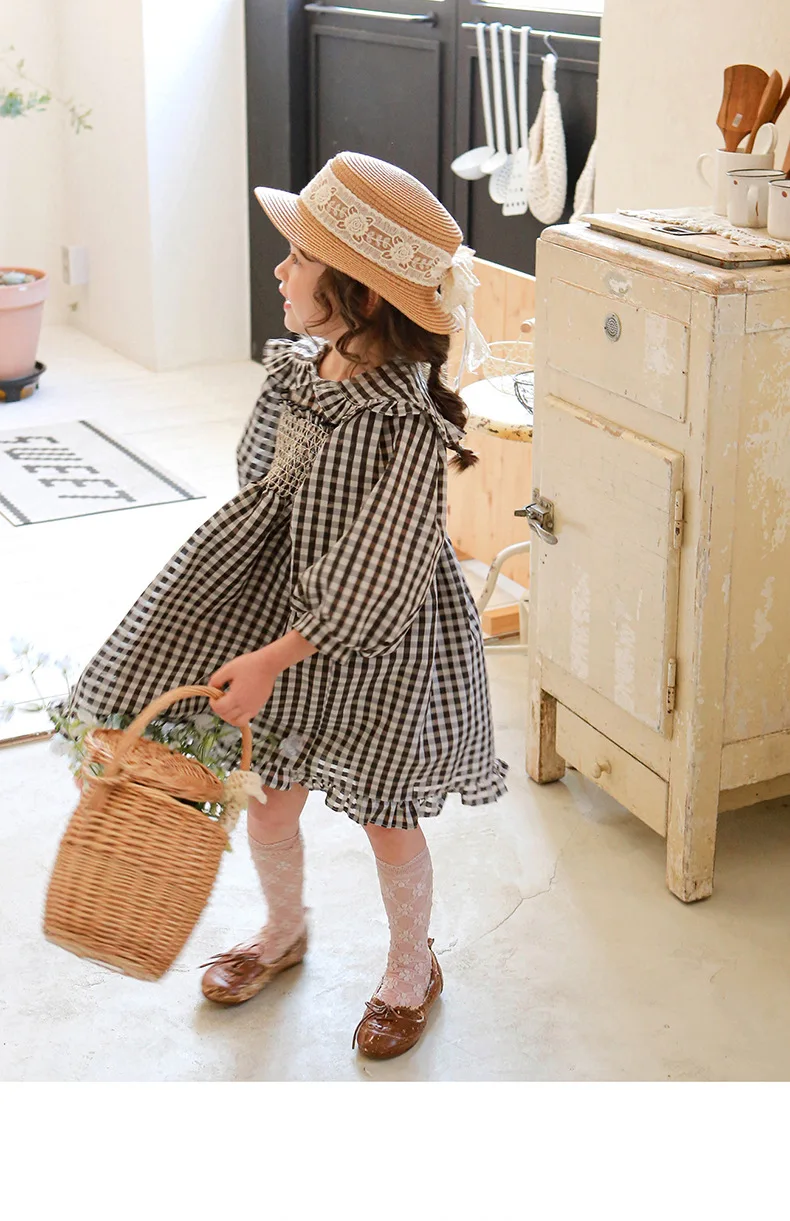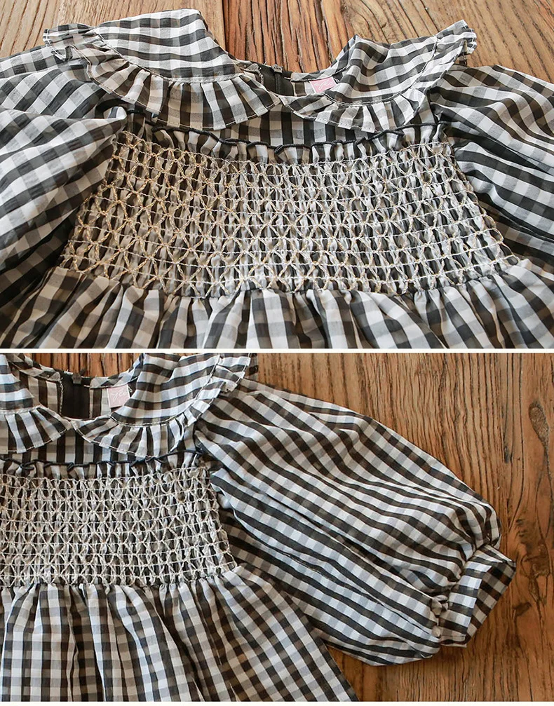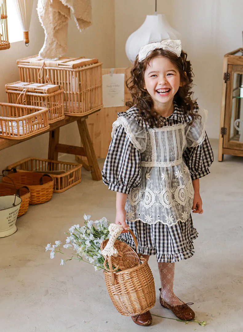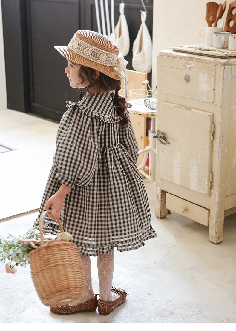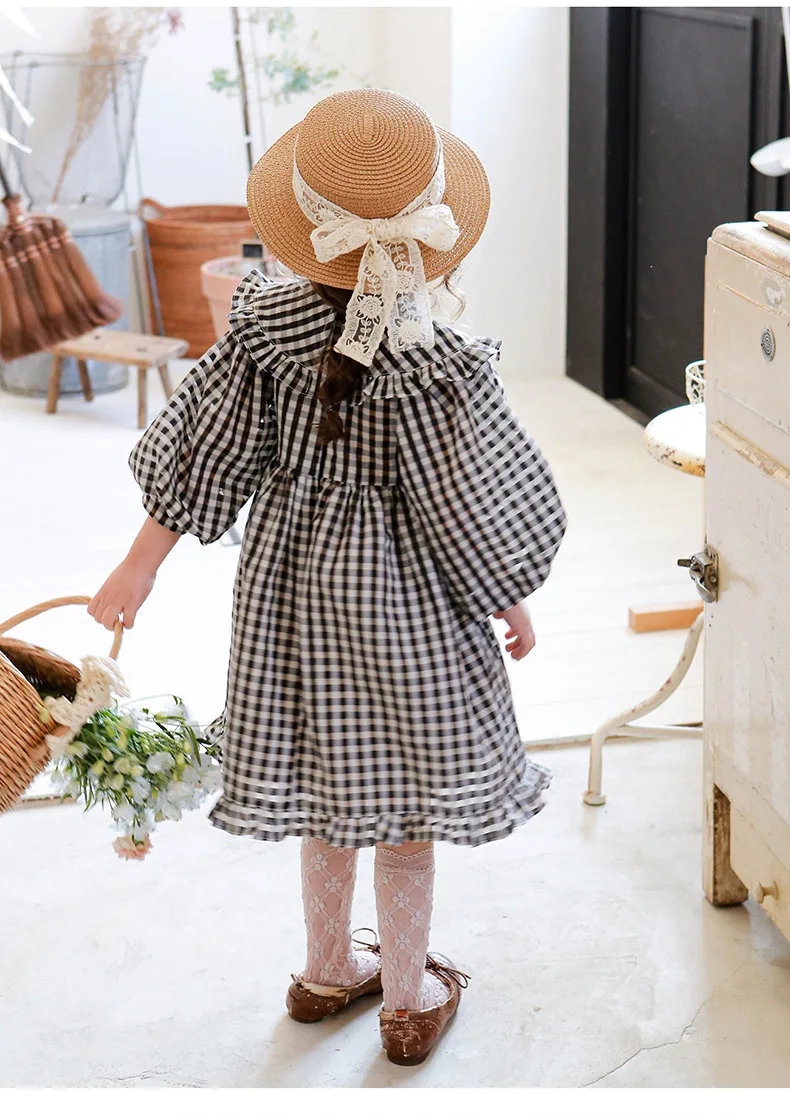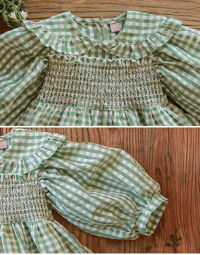 キッズ チェック フラワー 長袖 パフスリーブ ドレス ワンピース【mh0001542】