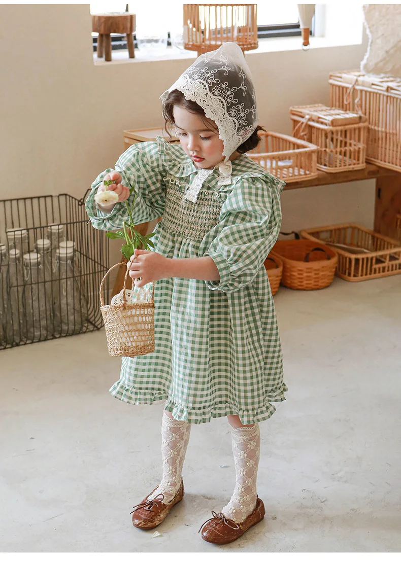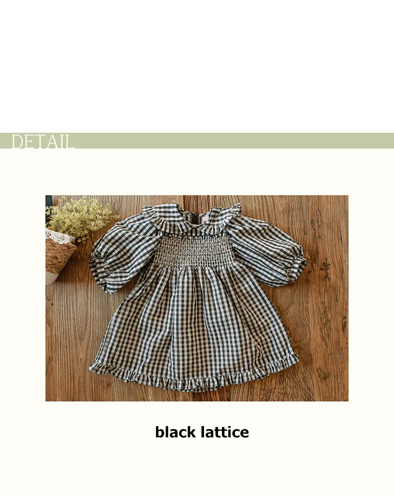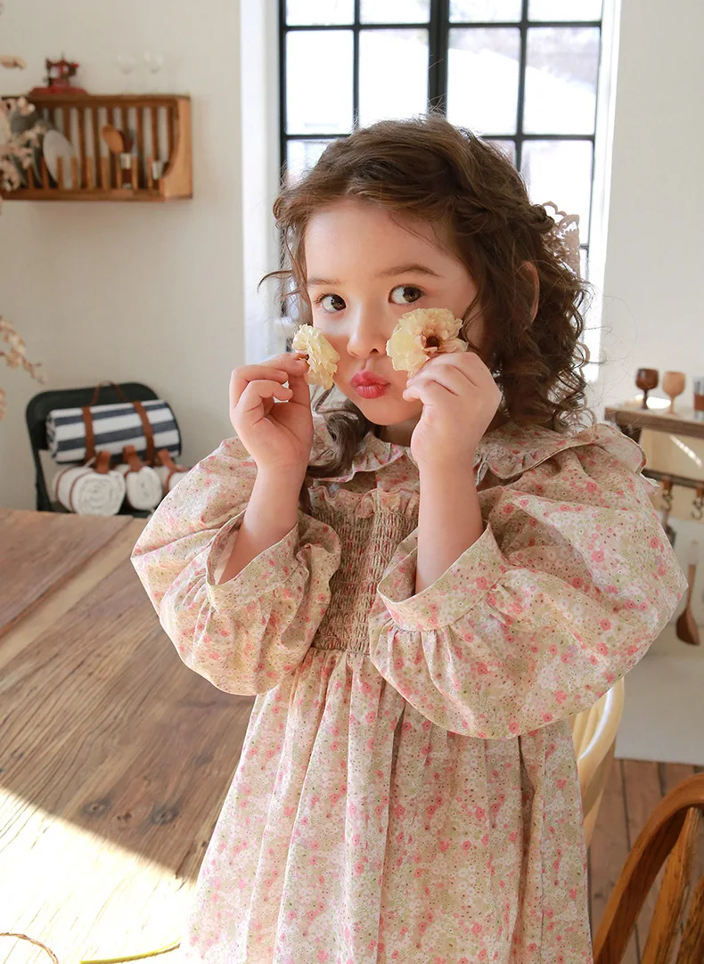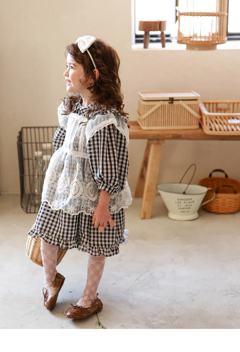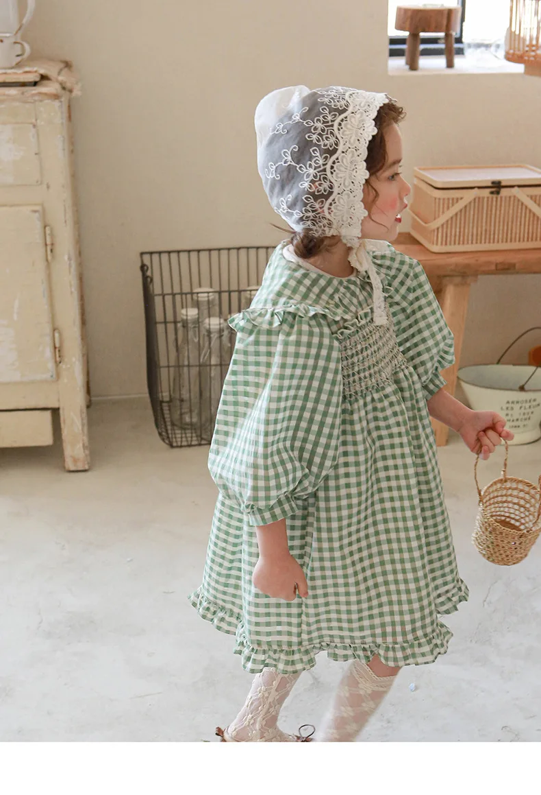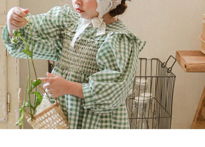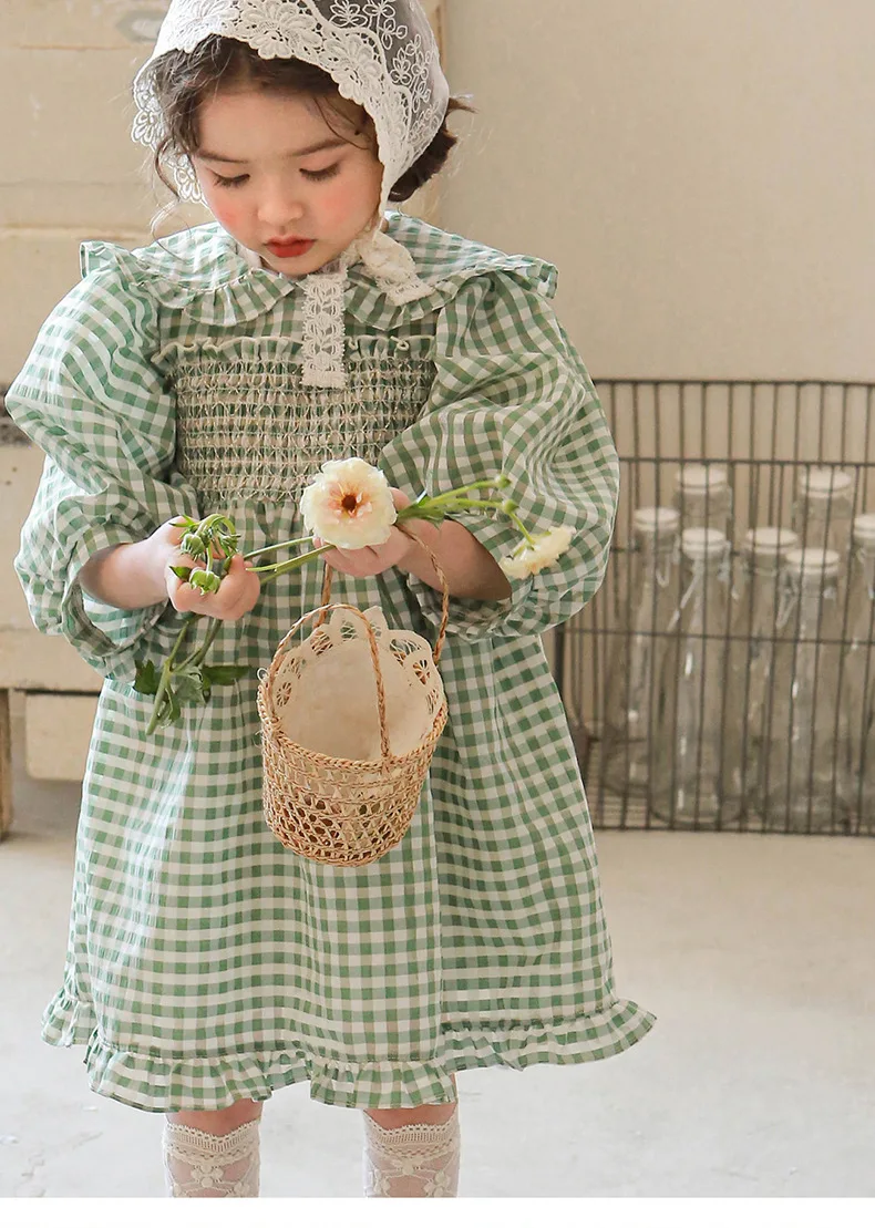 キッズ チェック フラワー 長袖 パフスリーブ ドレス ワンピース【mh0001542】