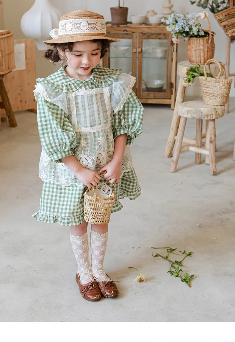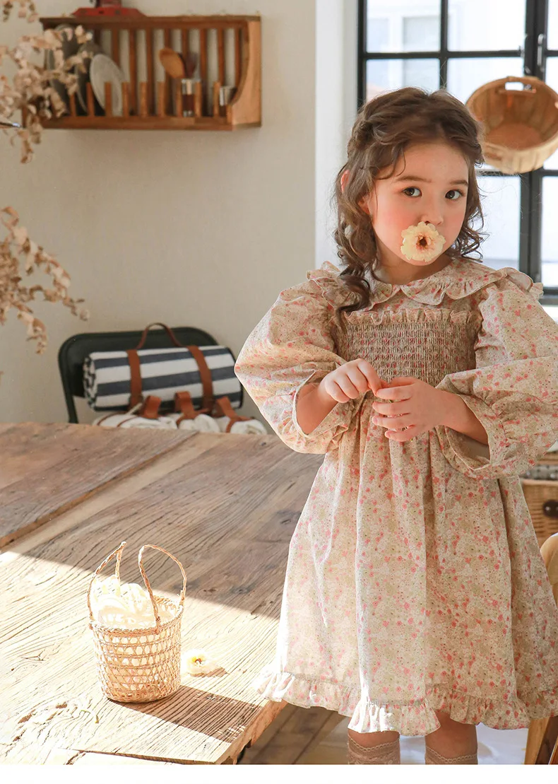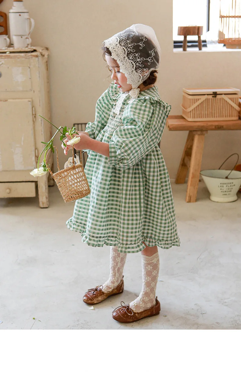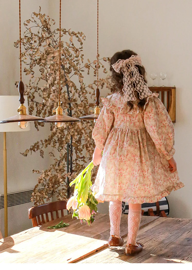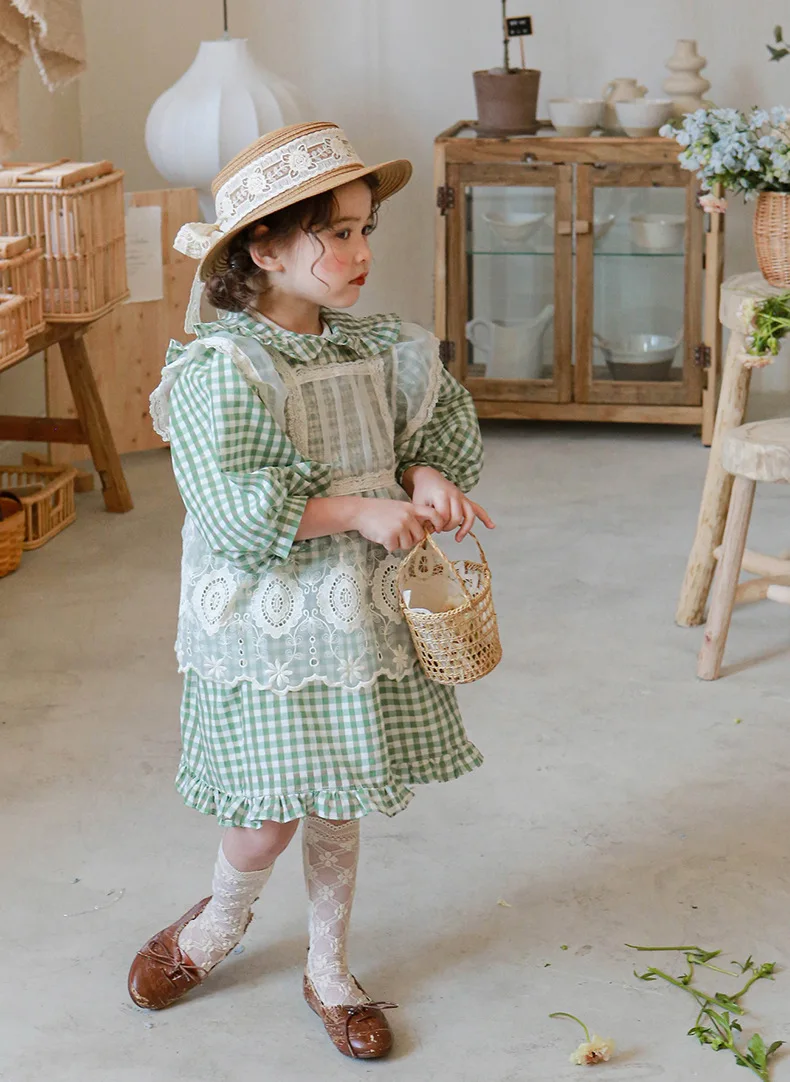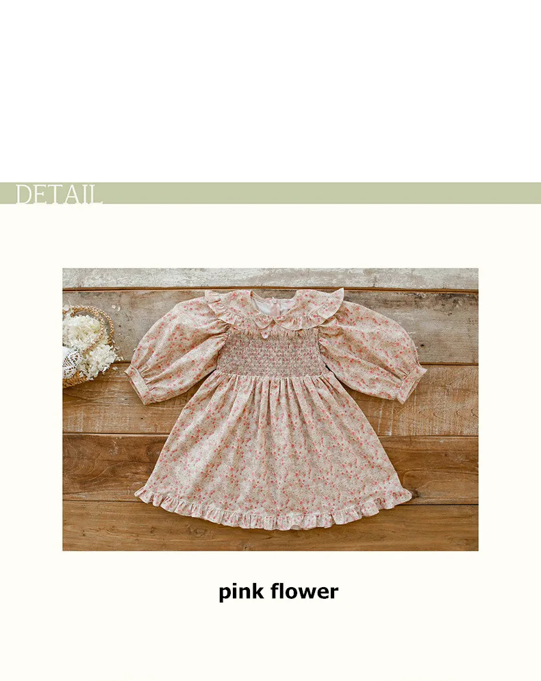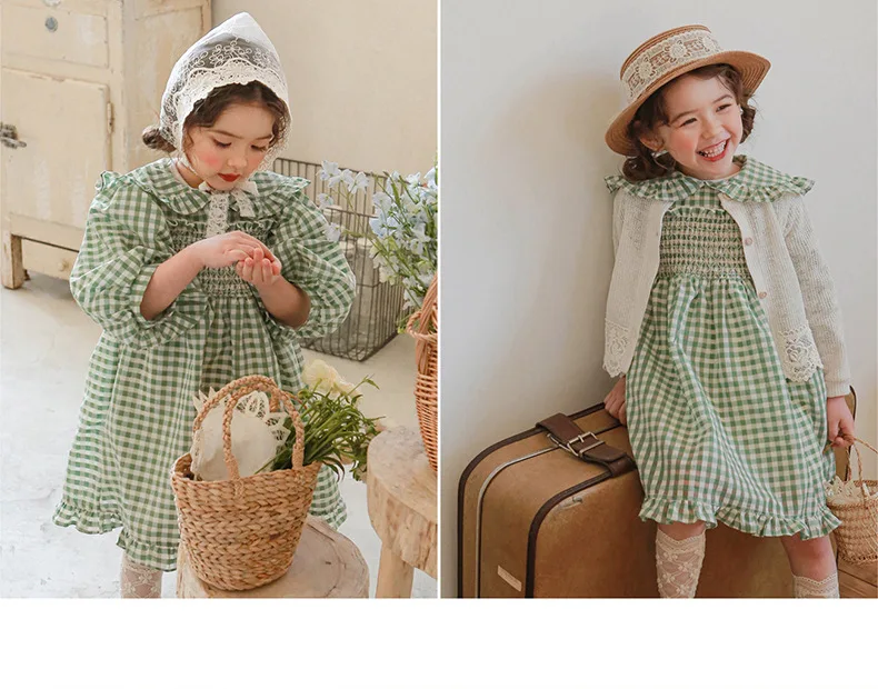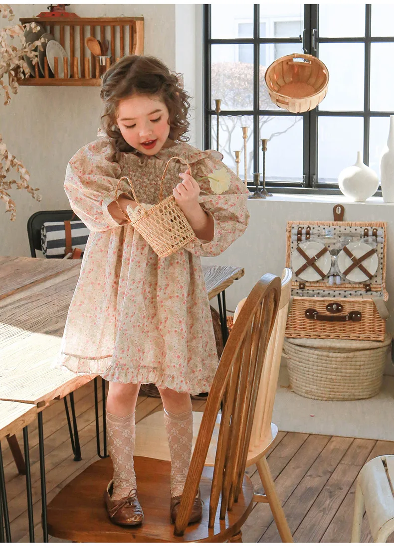 キッズ チェック フラワー 長袖 パフスリーブ ドレス ワンピース【mh0001542】