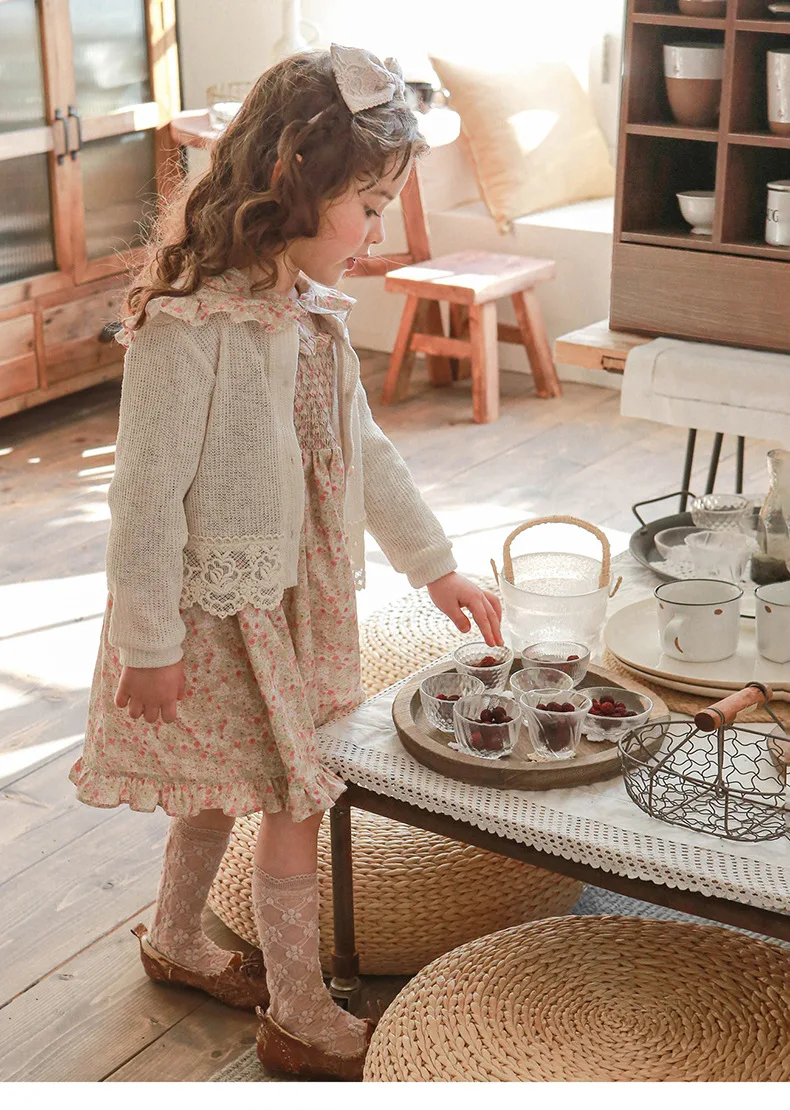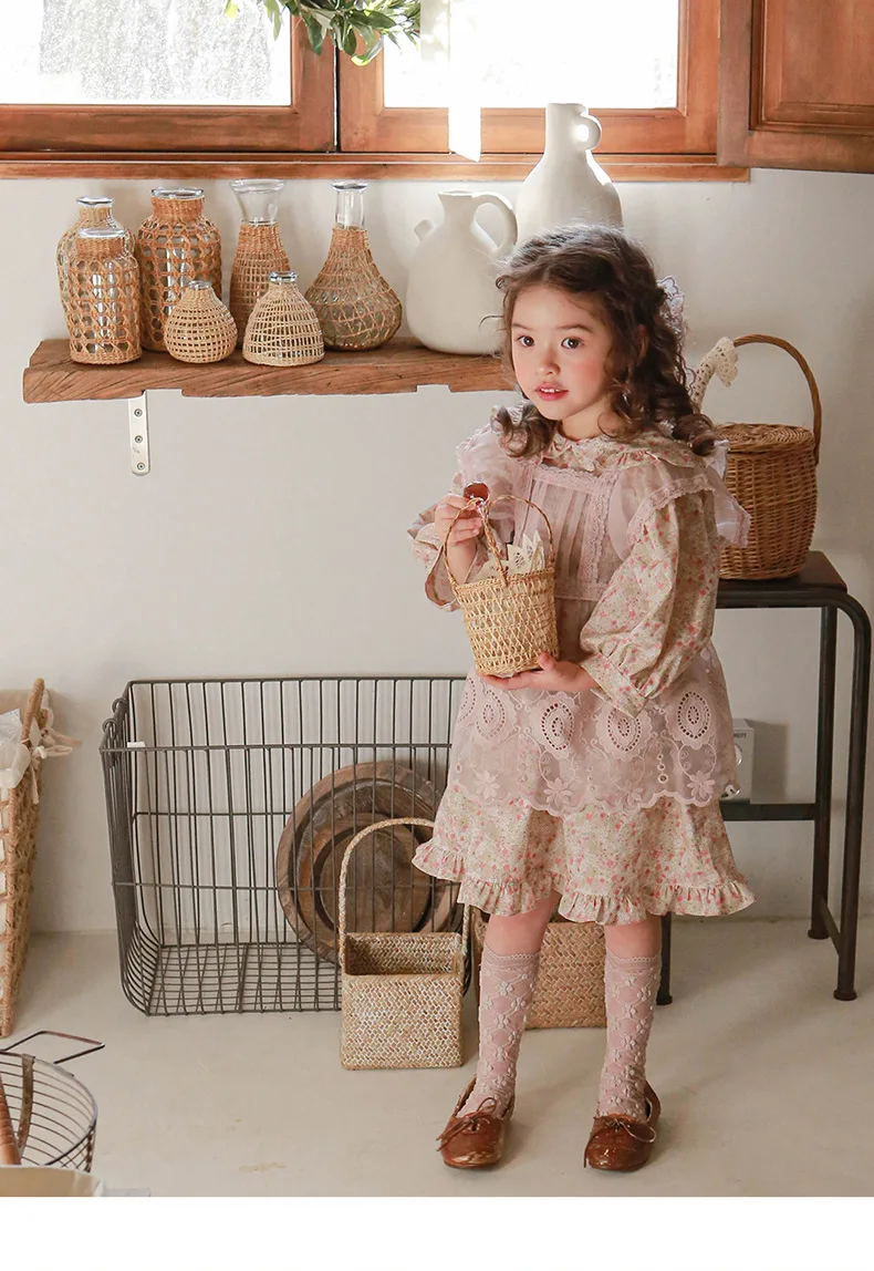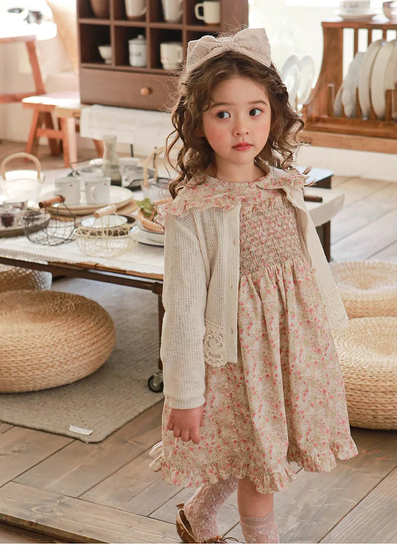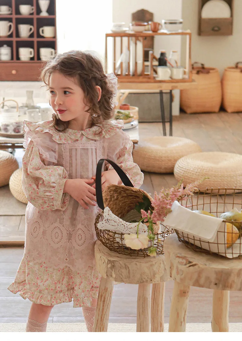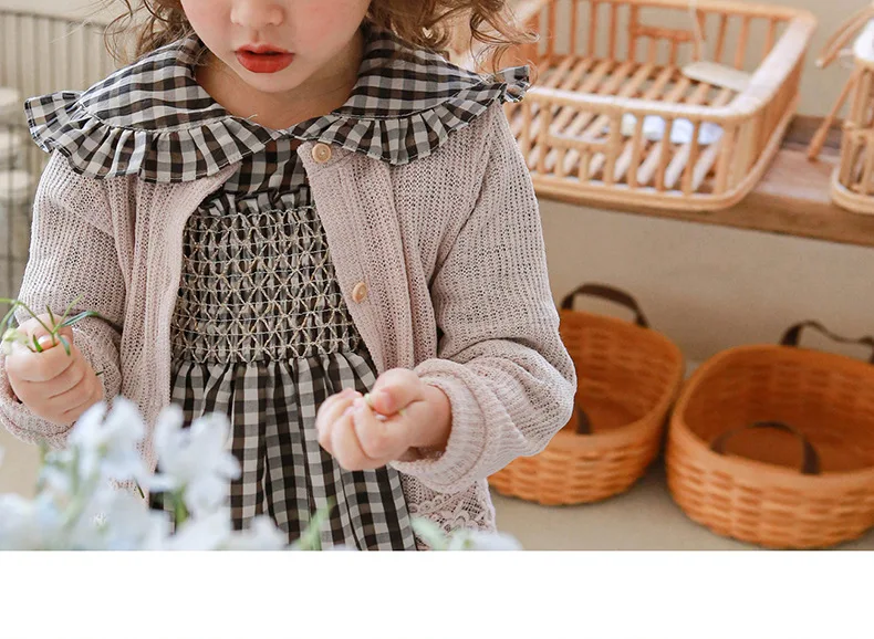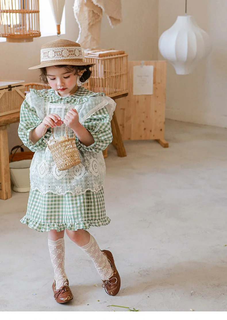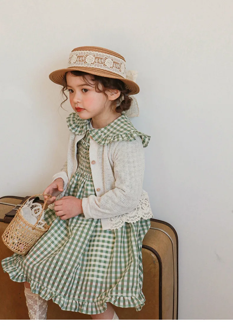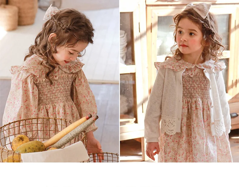 キッズ チェック フラワー 長袖 パフスリーブ ドレス ワンピース【mh0001542】