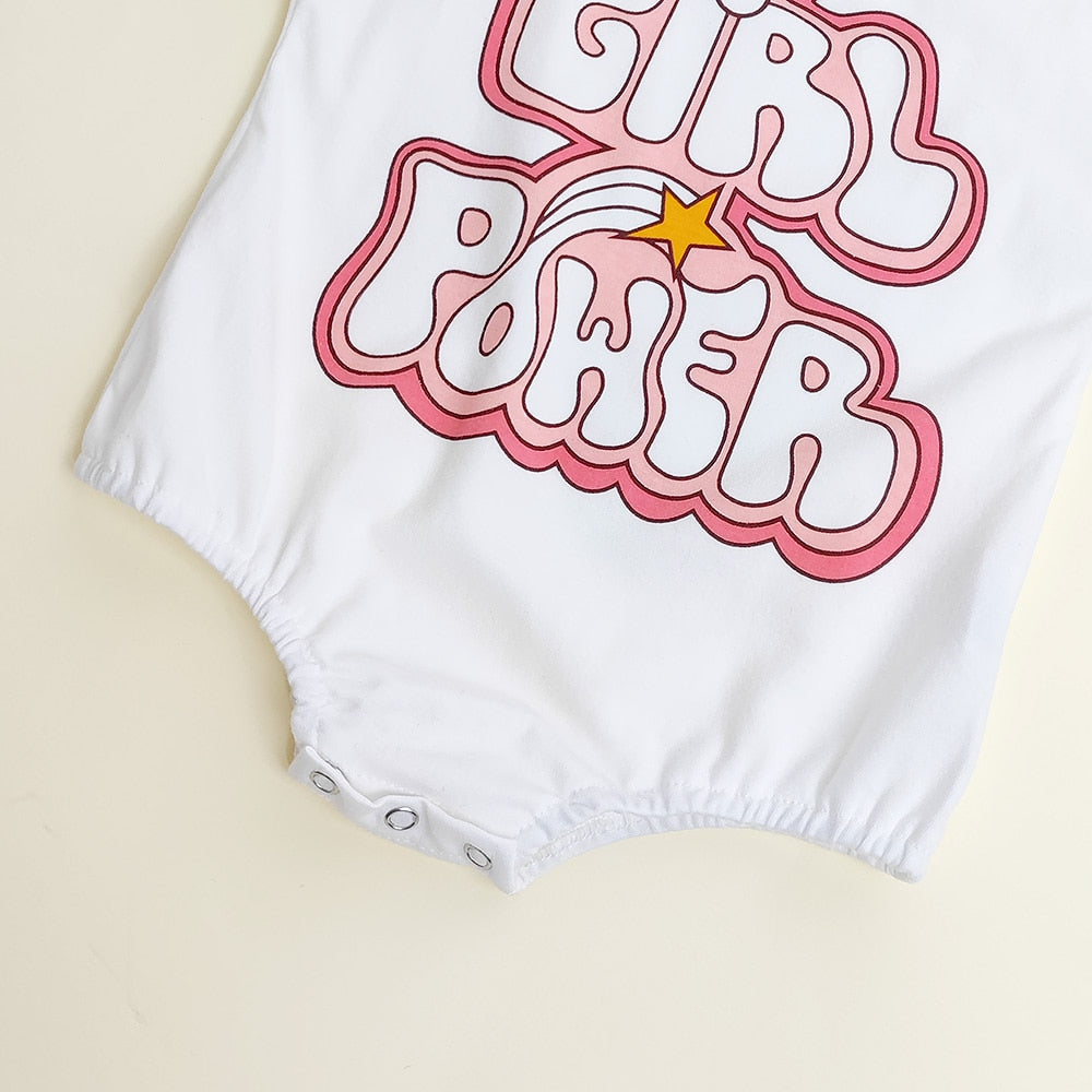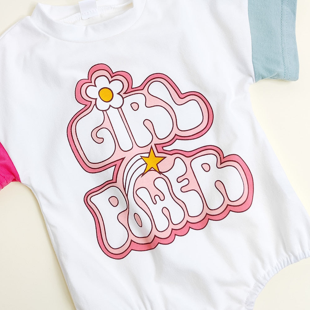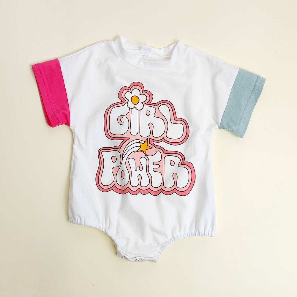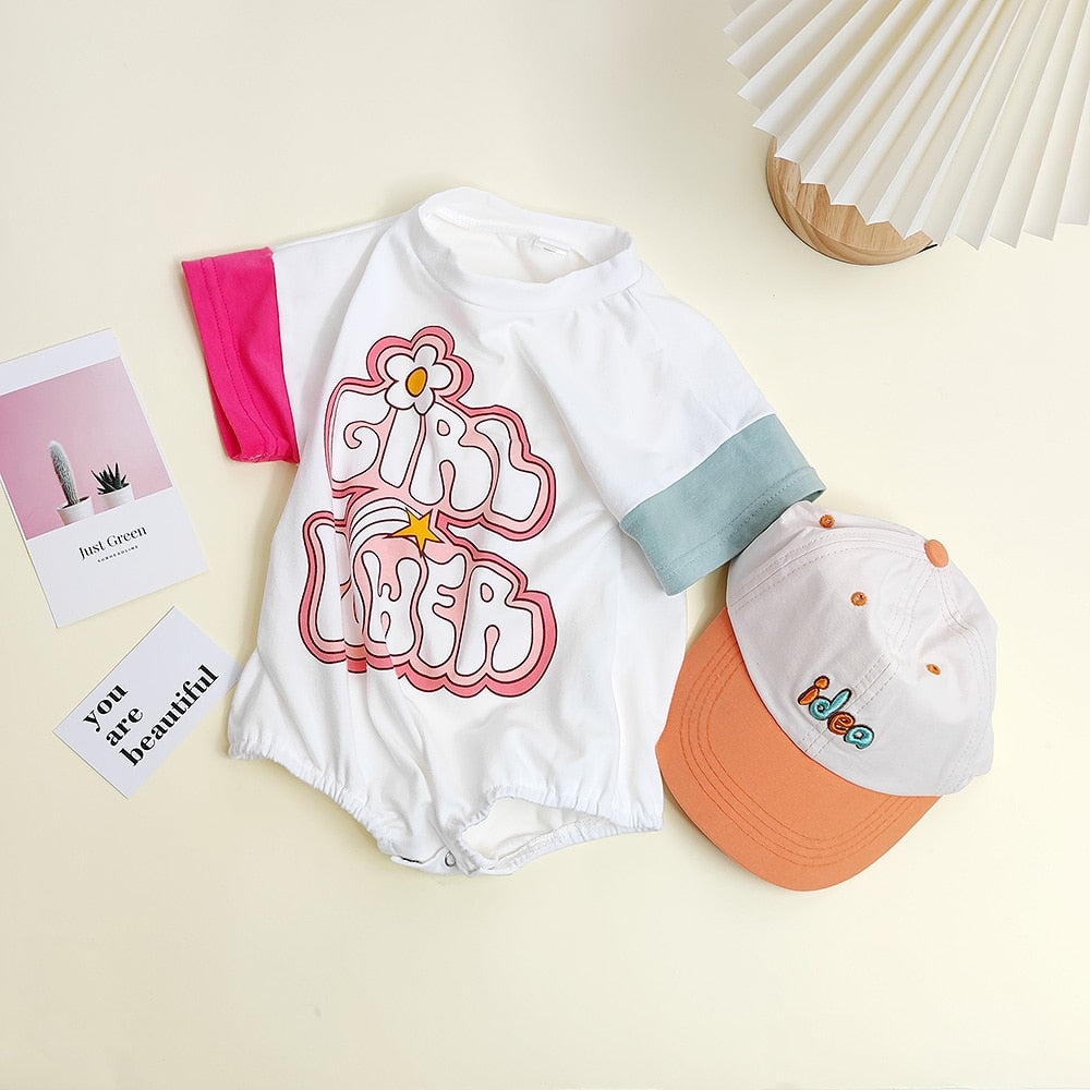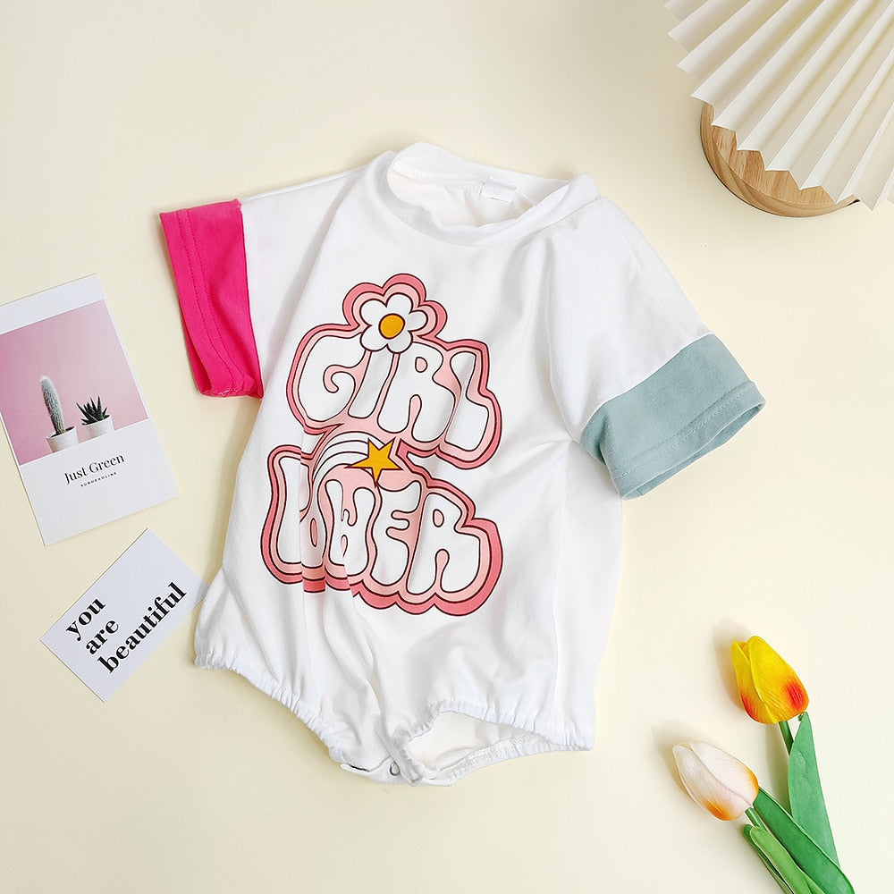 ホワイトベースにカラフルなレタープリントのこのロンパースは、かわいらしいパッチワークで1枚で着用できます。涼しくて肌触りが良い素材で、ベビーが快適な着心地を楽しめます!