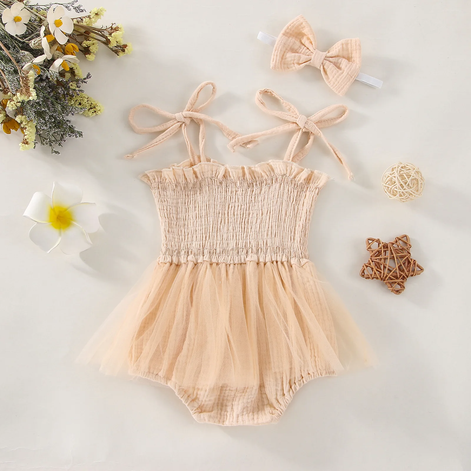 ベビーロンパース キャミソール シャーリング チュチュ チュールスカートボディスーツ ヘアバンドセット 3カラー【mh0005338】