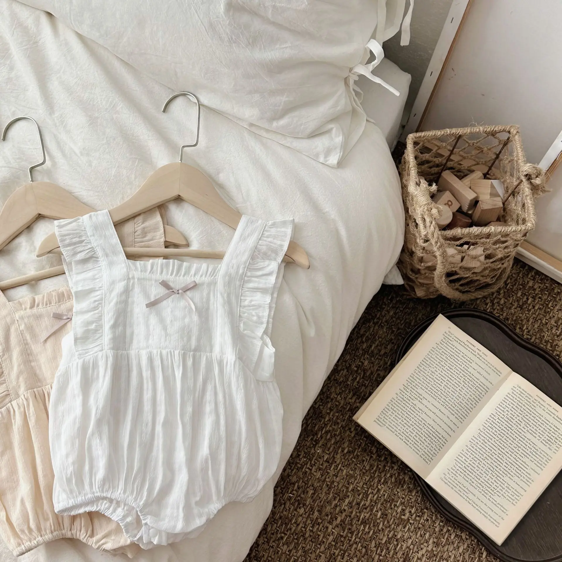 赤ちゃんの肌に優しいコットン素材のベビーロンパース。フリルとリボンの可愛いデザイン。女の子向けで、カジュアルながらもファッショナブルな新生児用のノースリーブボディスーツ。お洒落なルーズフィットで、赤ちゃんの動きを妨げません。2カラー展開で、いつものお洋服がおしゃれになります。