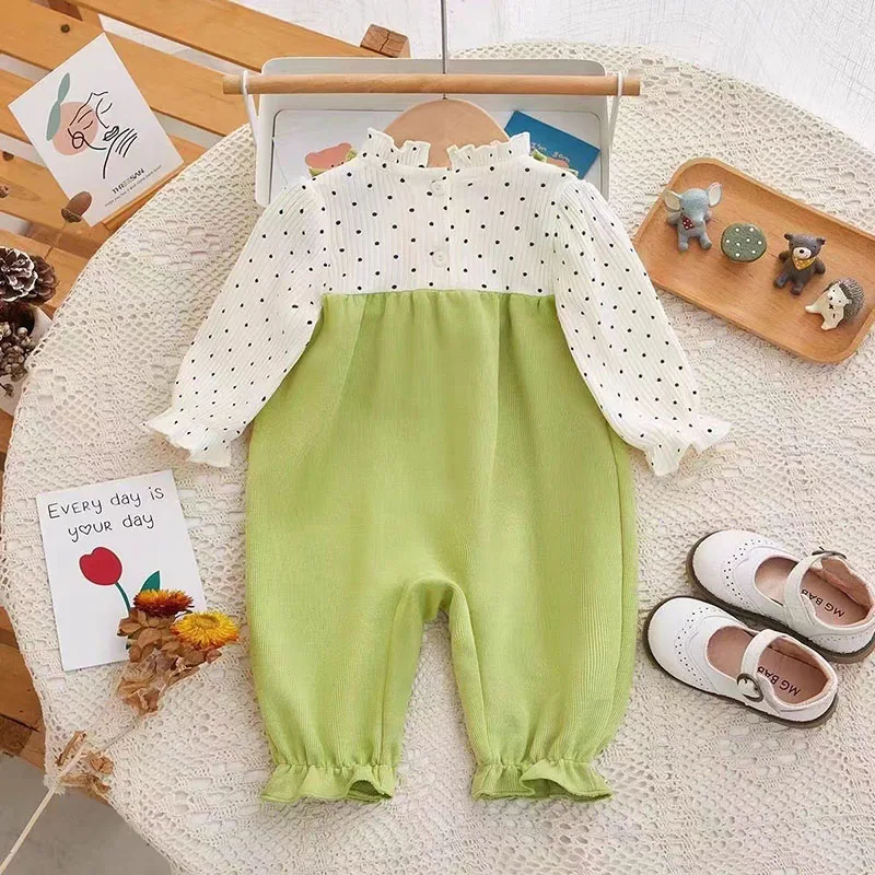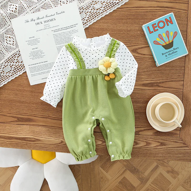 秋の赤ちゃん用のジャンプスーツ。可愛らしい花のアップリケとポルカドットのパッチワークがドッキングデザインで、0-2歳の女の子用。おしゃれでエレガントなデザインは、赤ちゃんの成長に合わせて長く着ることができます。おしゃれな花とドット柄で、赤ちゃんを可愛く演出します。