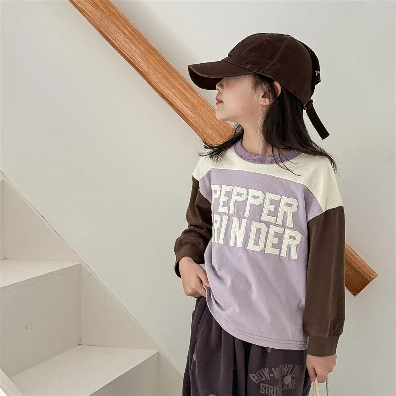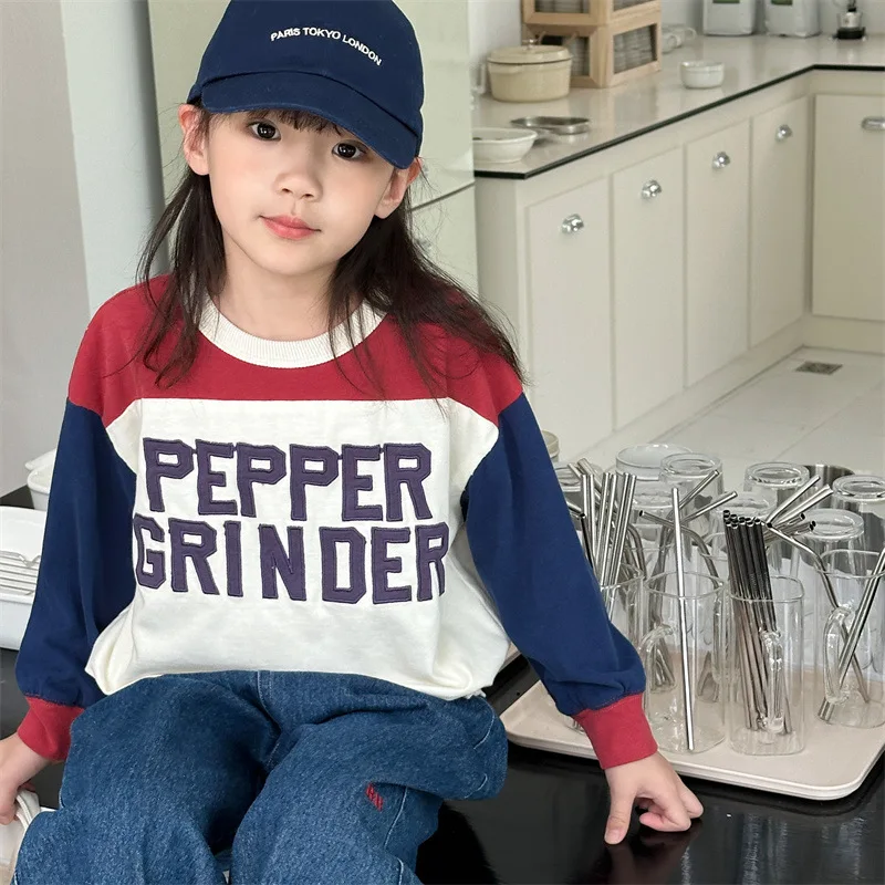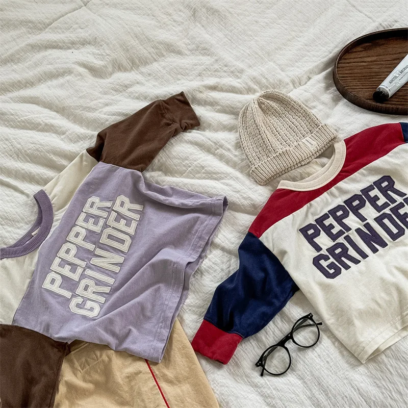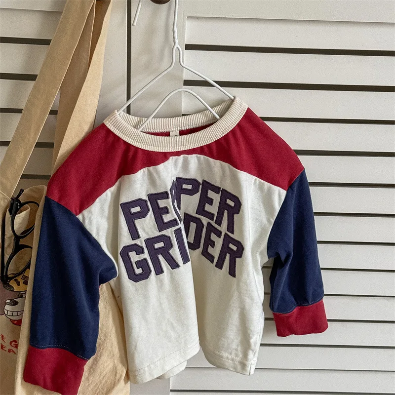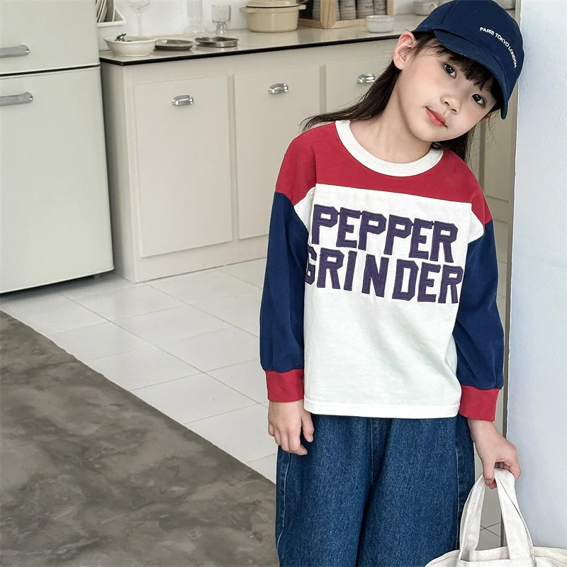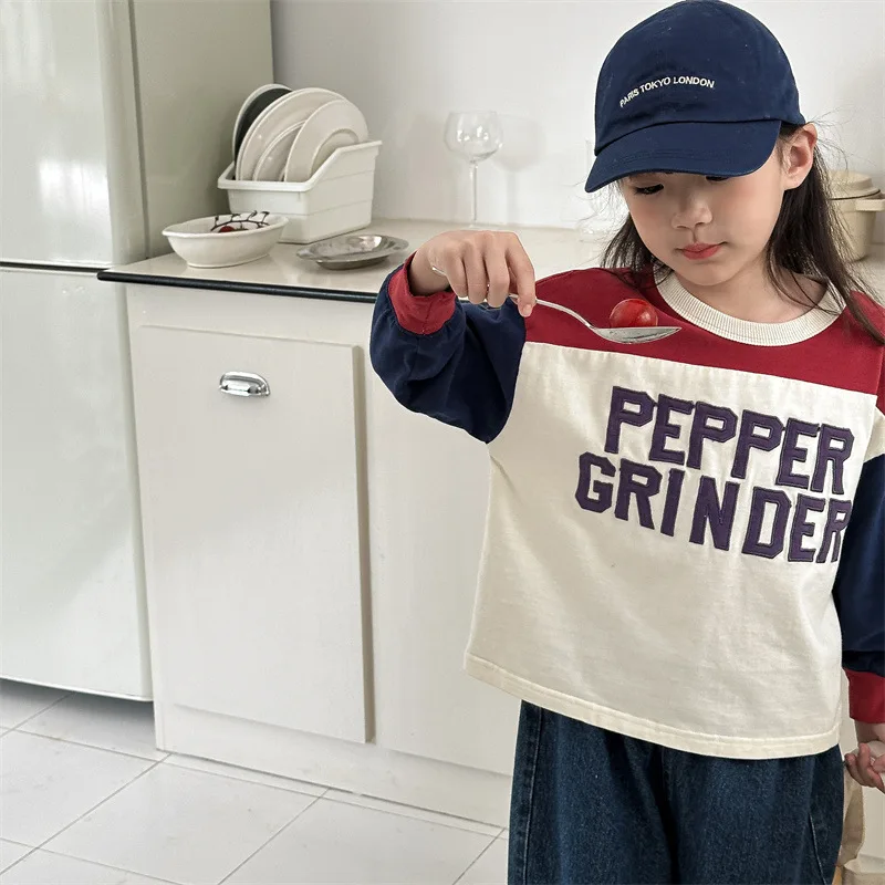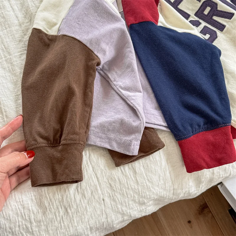 キッズトップス 長袖Tシャツ ホッケーシャツ パッチワーク レターロゴ刺繍 2カラー【mh0006594】