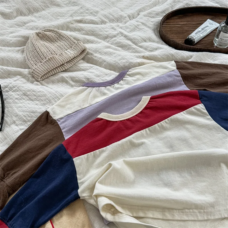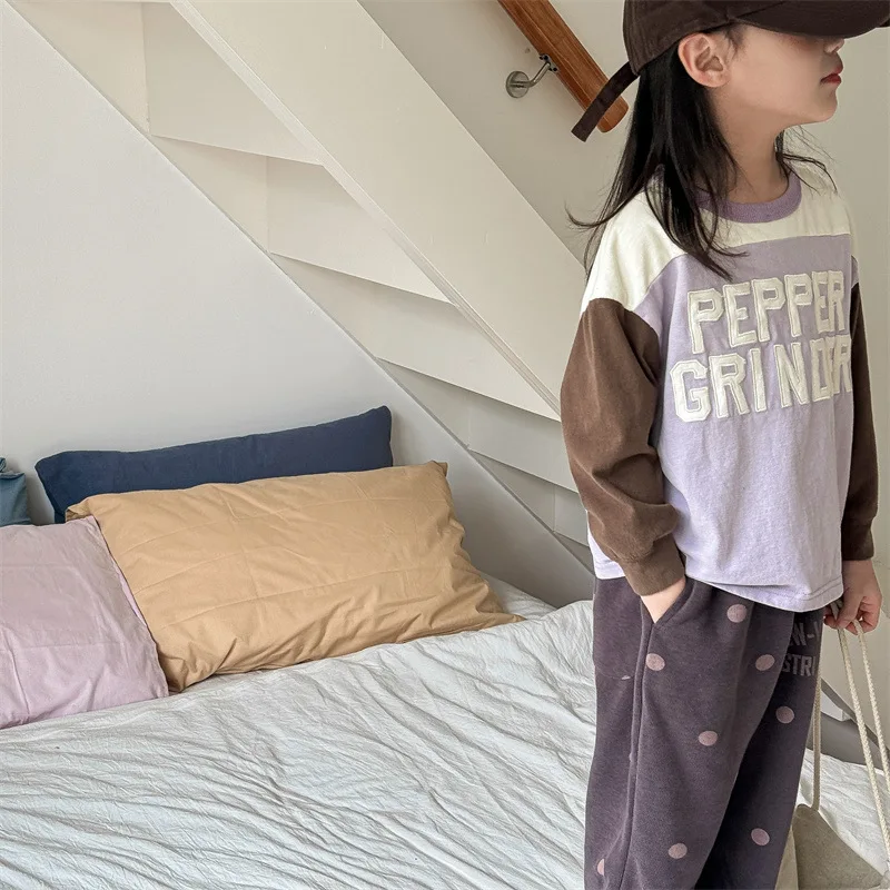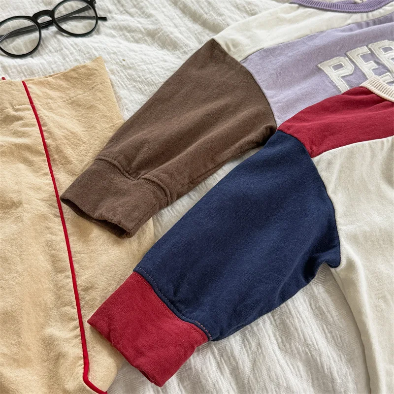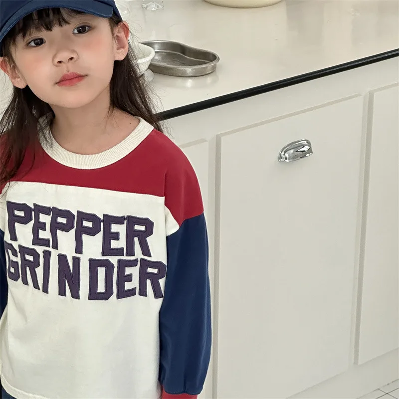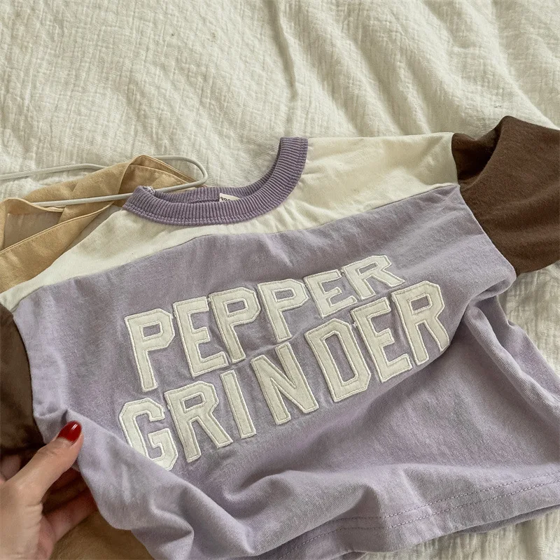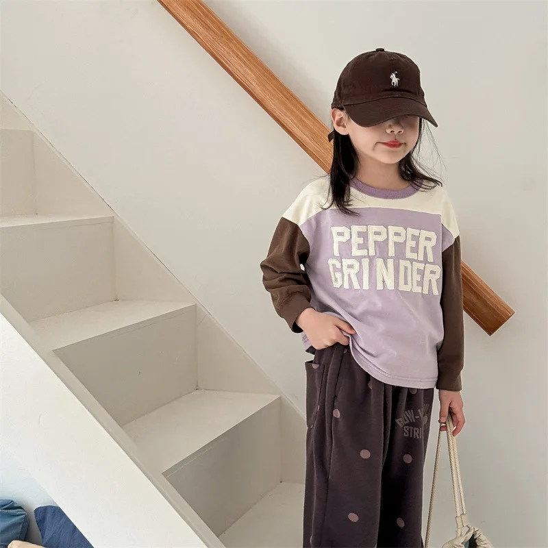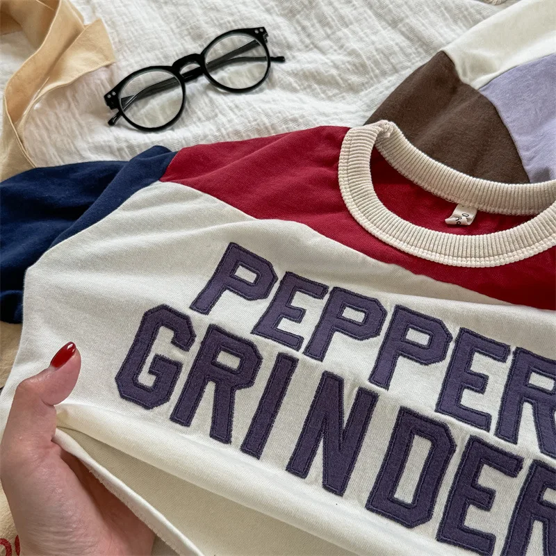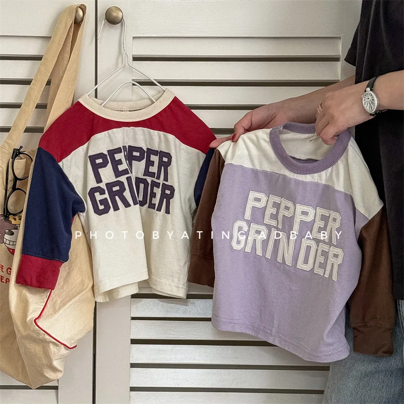 キッズトップス 長袖Tシャツ ホッケーシャツ パッチワーク レターロゴ刺繍 2カラー【mh0006594】