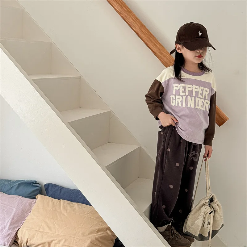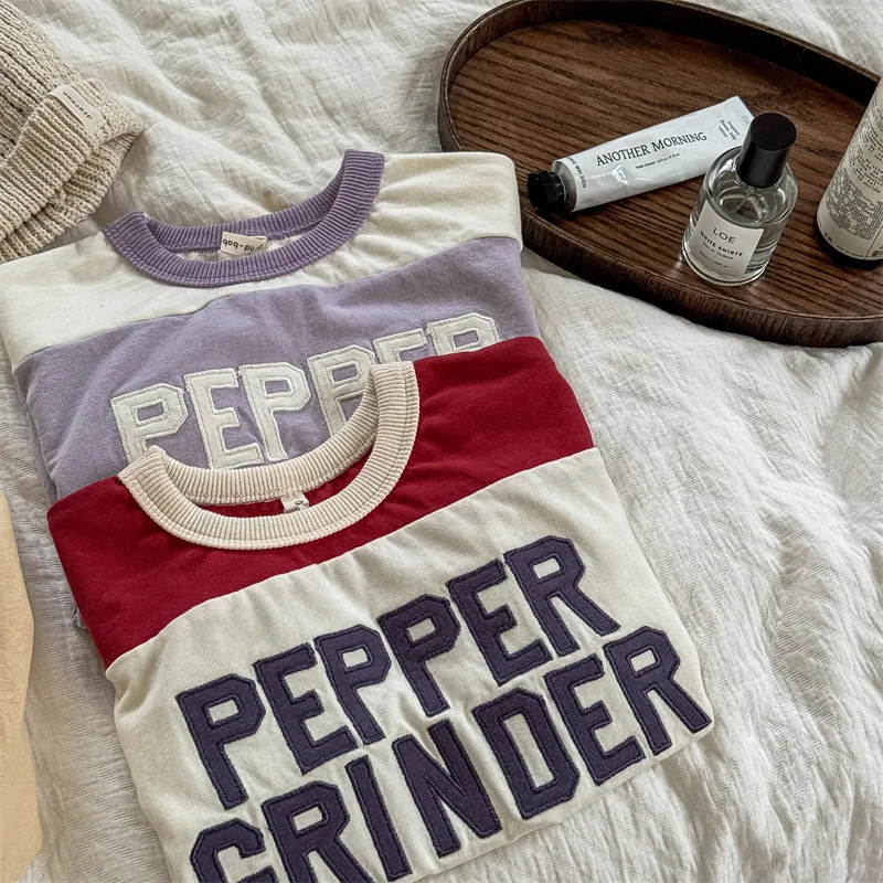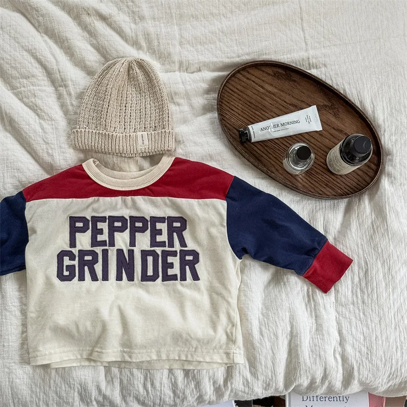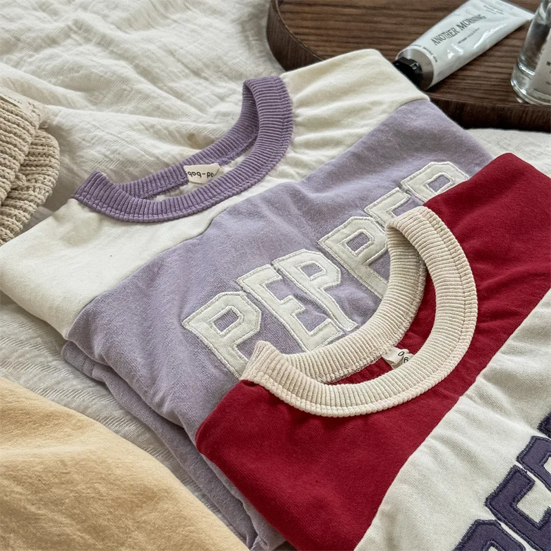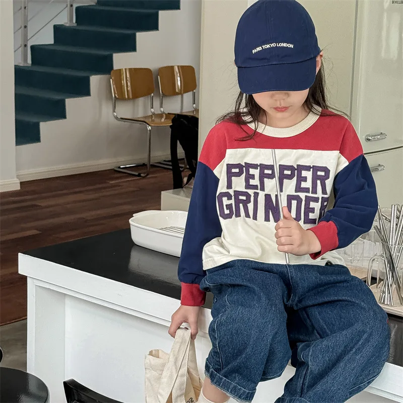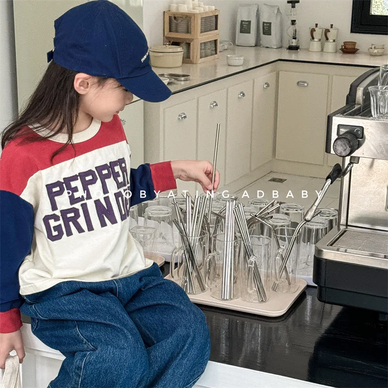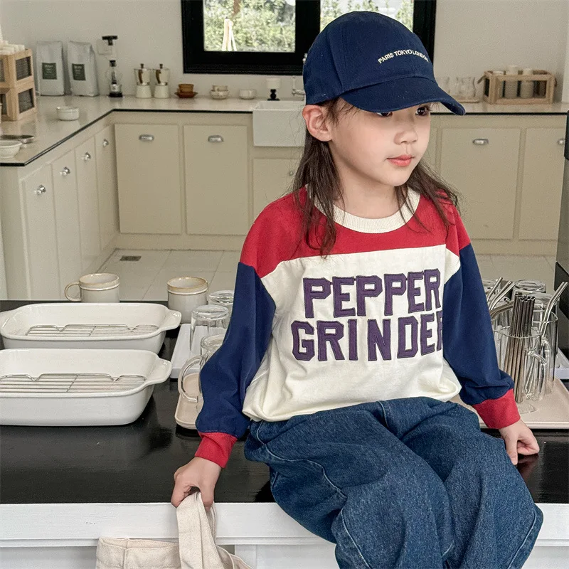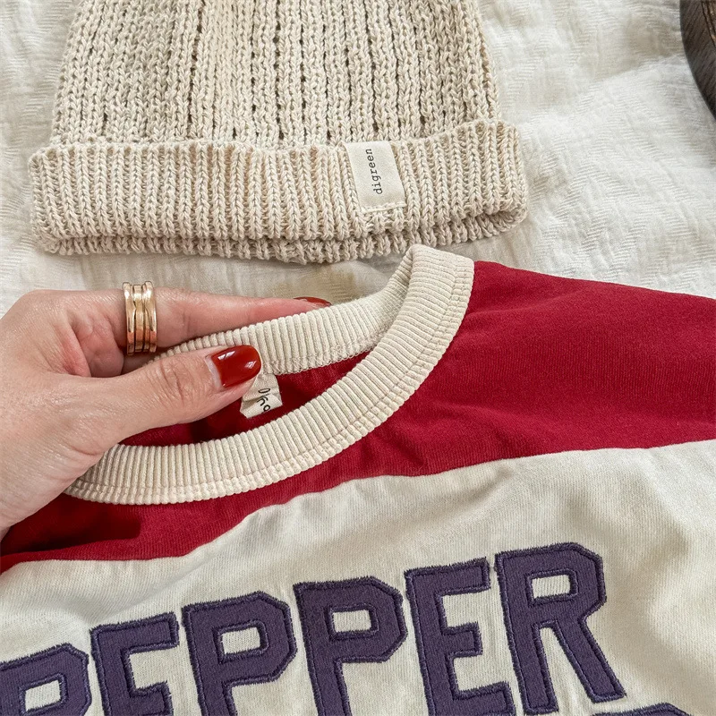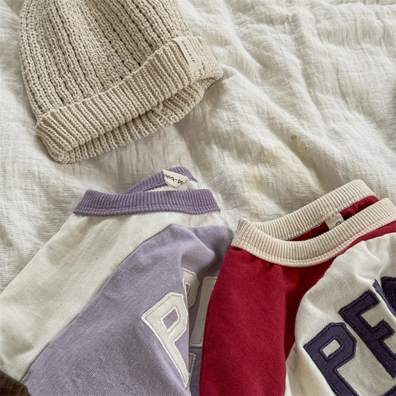 #キッズトップス #ホッケーシャツ #レターロゴ刺繍 #子供服 #長袖Tシャツ #カジュアルスタイル