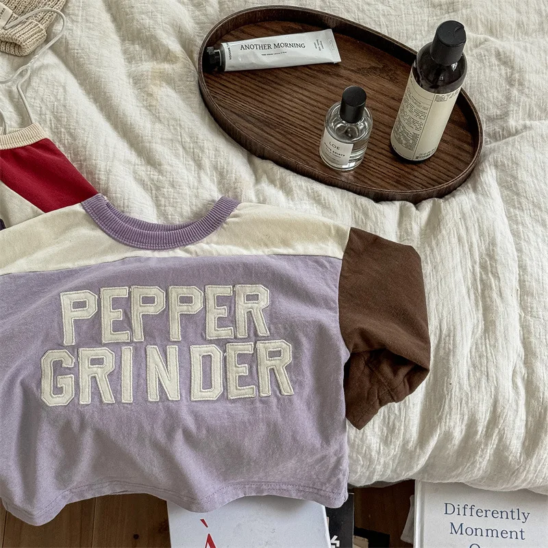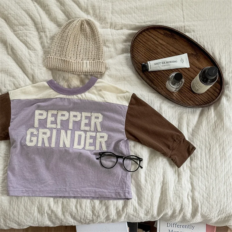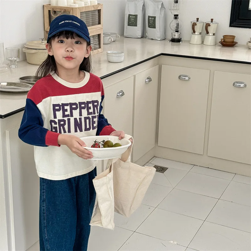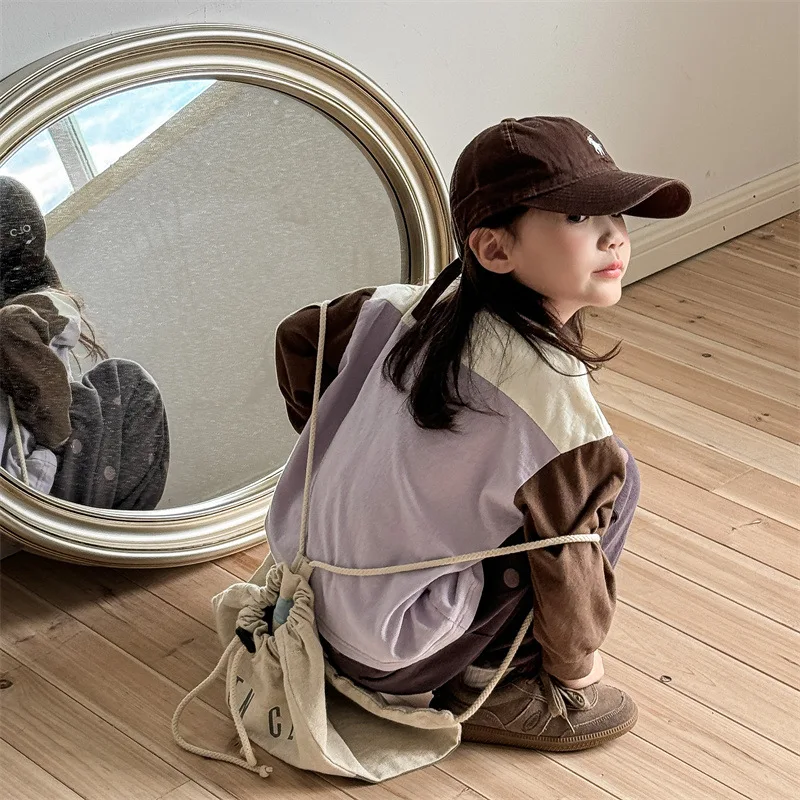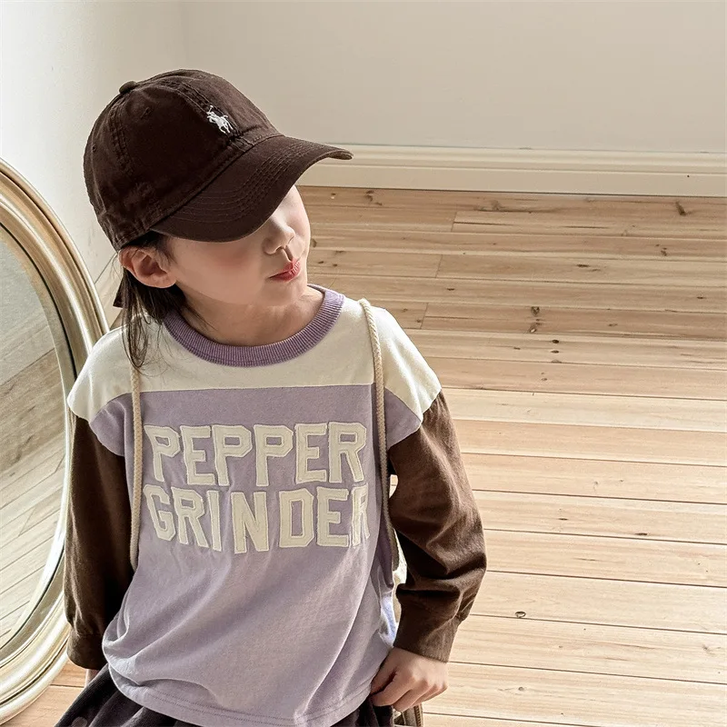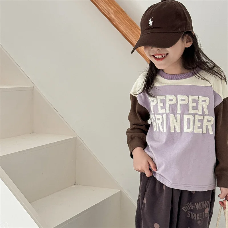 ホッケーシャツスタイルのキッズトップスで、長袖のTシャツです。パッチワークデザインとレターロゴ刺繍が特徴で、カジュアルながらも個性的な印象を与えます。柔らかなコットン素材が快適な着心地を提供し、デイリーのスタイルにぴったりです。2色のカラー展開で、男の子にも女の子にも合わせやすい一枚です。