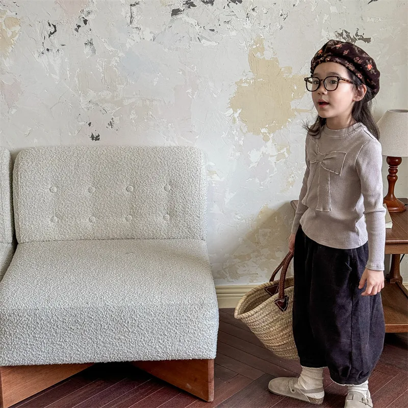 リボン刺繍が可愛らしいキッズトップスで、長袖のTシャツです。柔らかなコットン素材が心地よく、デイリーのカジュアルスタイルにぴったりです。シンプルなデザインにリボンの刺繍がアクセントとなり、おしゃれな印象を引き立てます。3色のカラー展開で、お子様のコーディネートに合わせやすい一枚です。