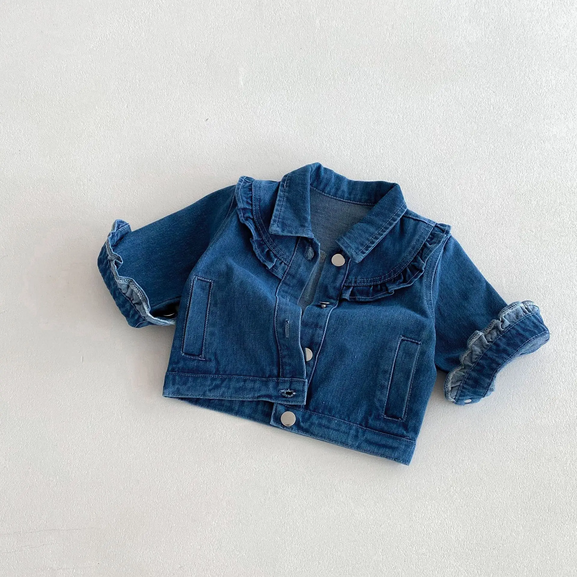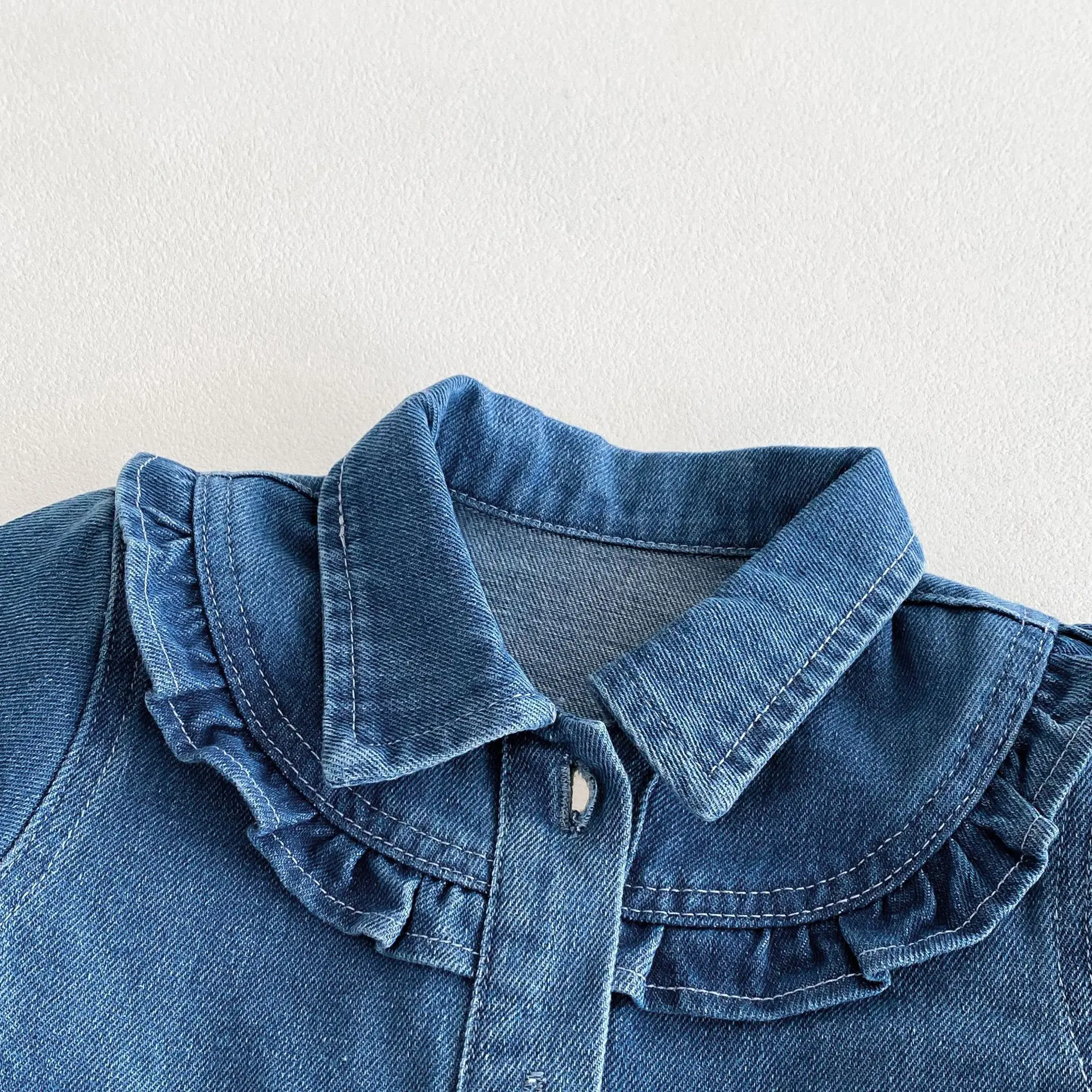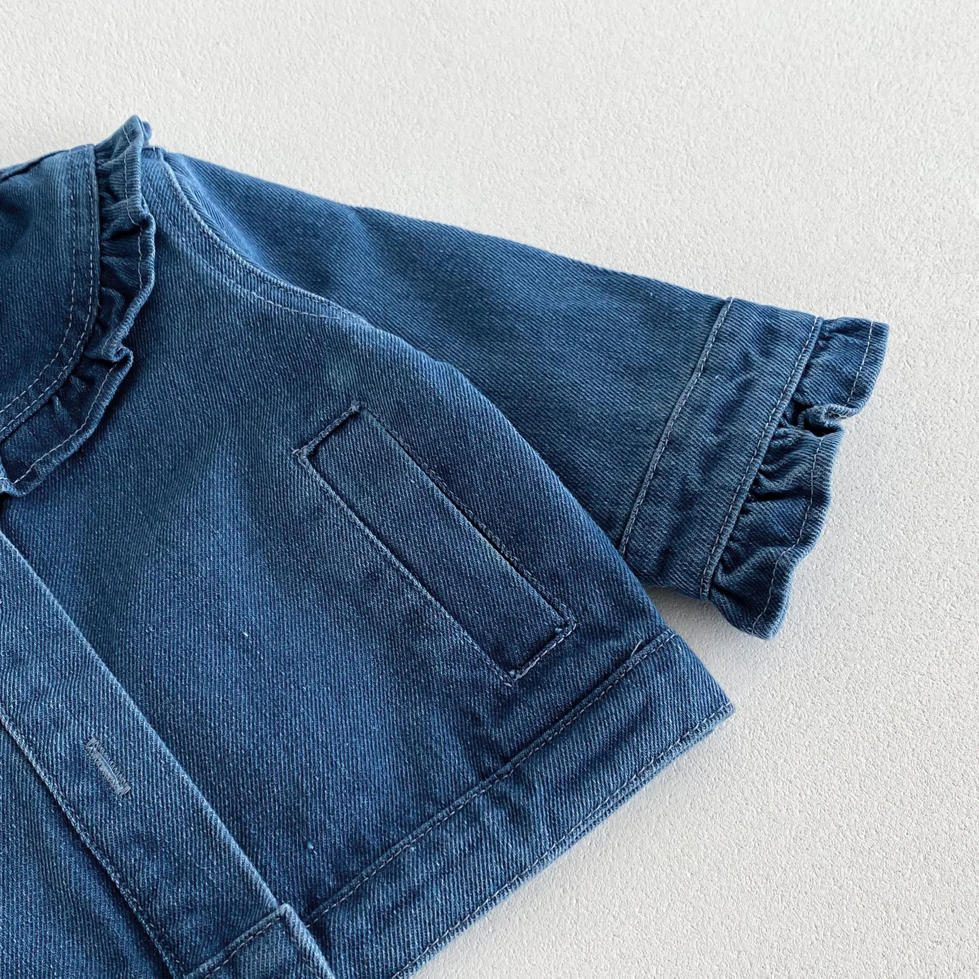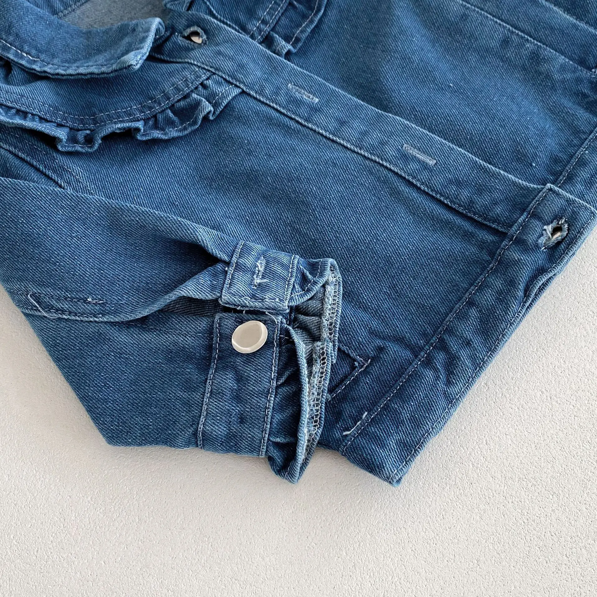 フリルディテールが魅力的なキッズ用デニムジャケットです。おしゃれなレースのラペルがアクセントとなり、カジュアルなスタイルを一層引き立てます。ゆったりとしたシルエットで動きやすく、デイリーユースに最適です。耐久性のあるデニム素材が長持ちし、どんなシーンでも活躍します。お子様のコーディネートに取り入れやすい一枚です。
