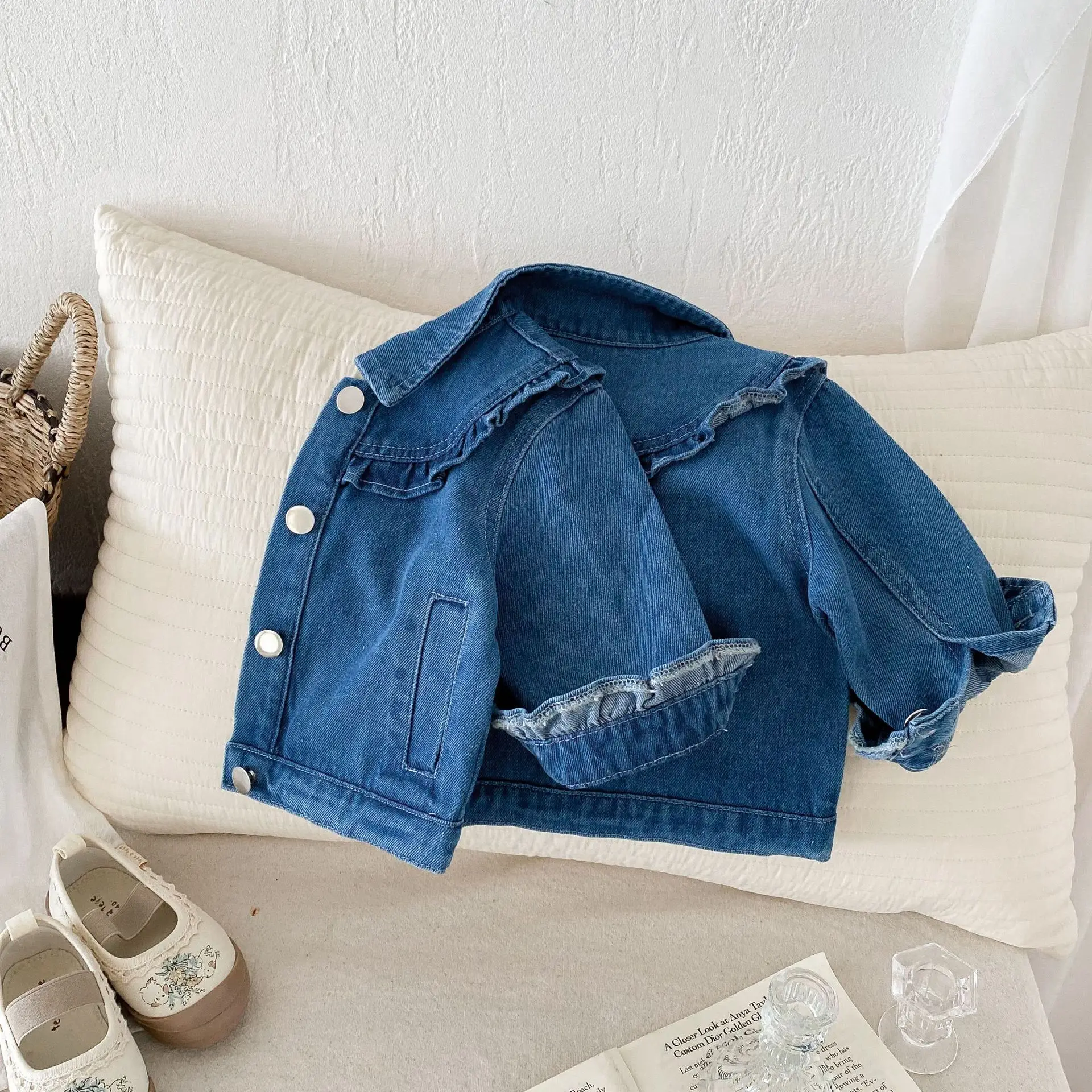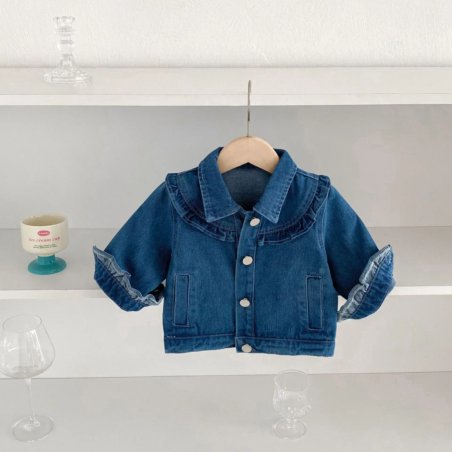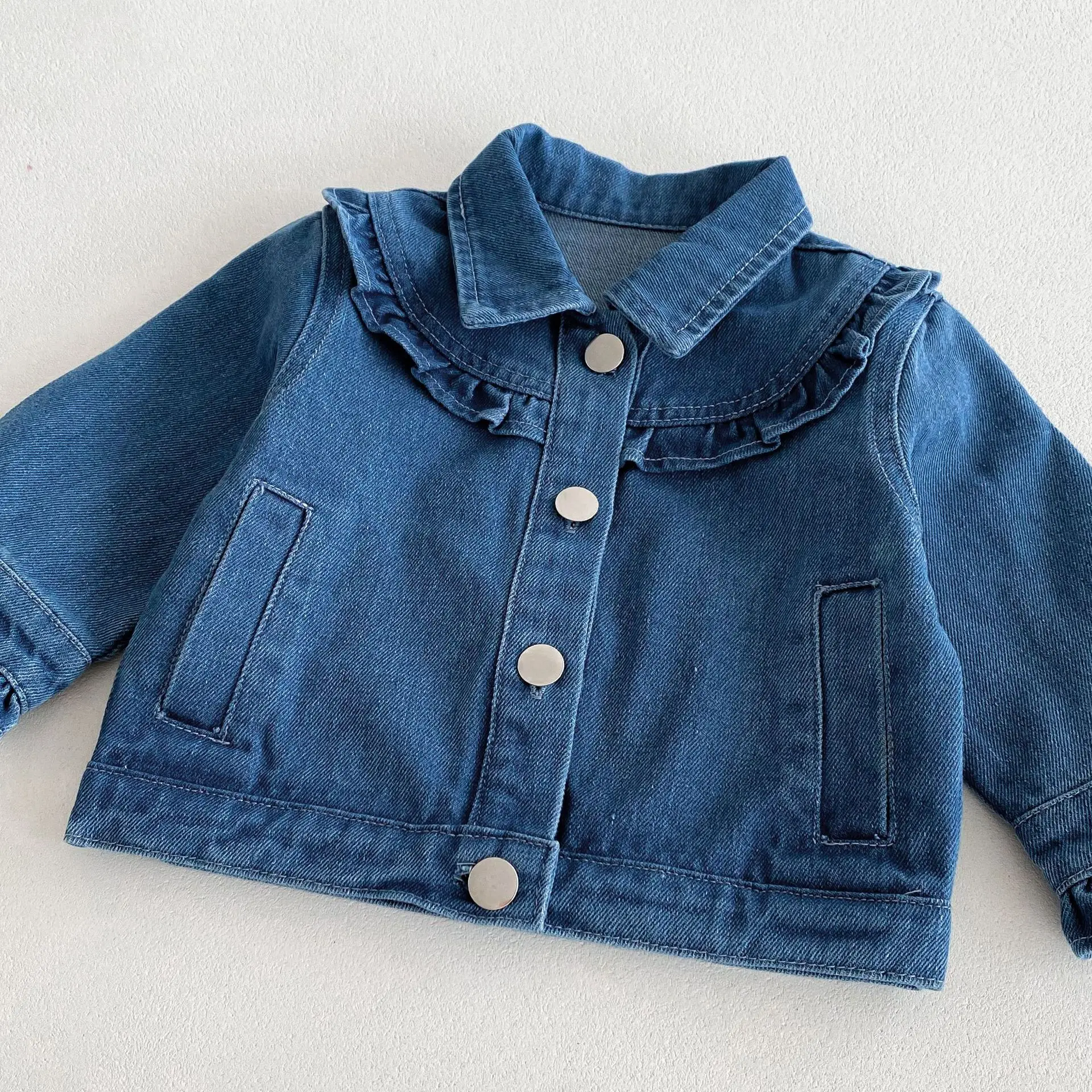 フリルディテールが魅力的なキッズ用デニムジャケットです。おしゃれなレースのラペルがアクセントとなり、カジュアルなスタイルを一層引き立てます。ゆったりとしたシルエットで動きやすく、デイリーユースに最適です。耐久性のあるデニム素材が長持ちし、どんなシーンでも活躍します。お子様のコーディネートに取り入れやすい一枚です。