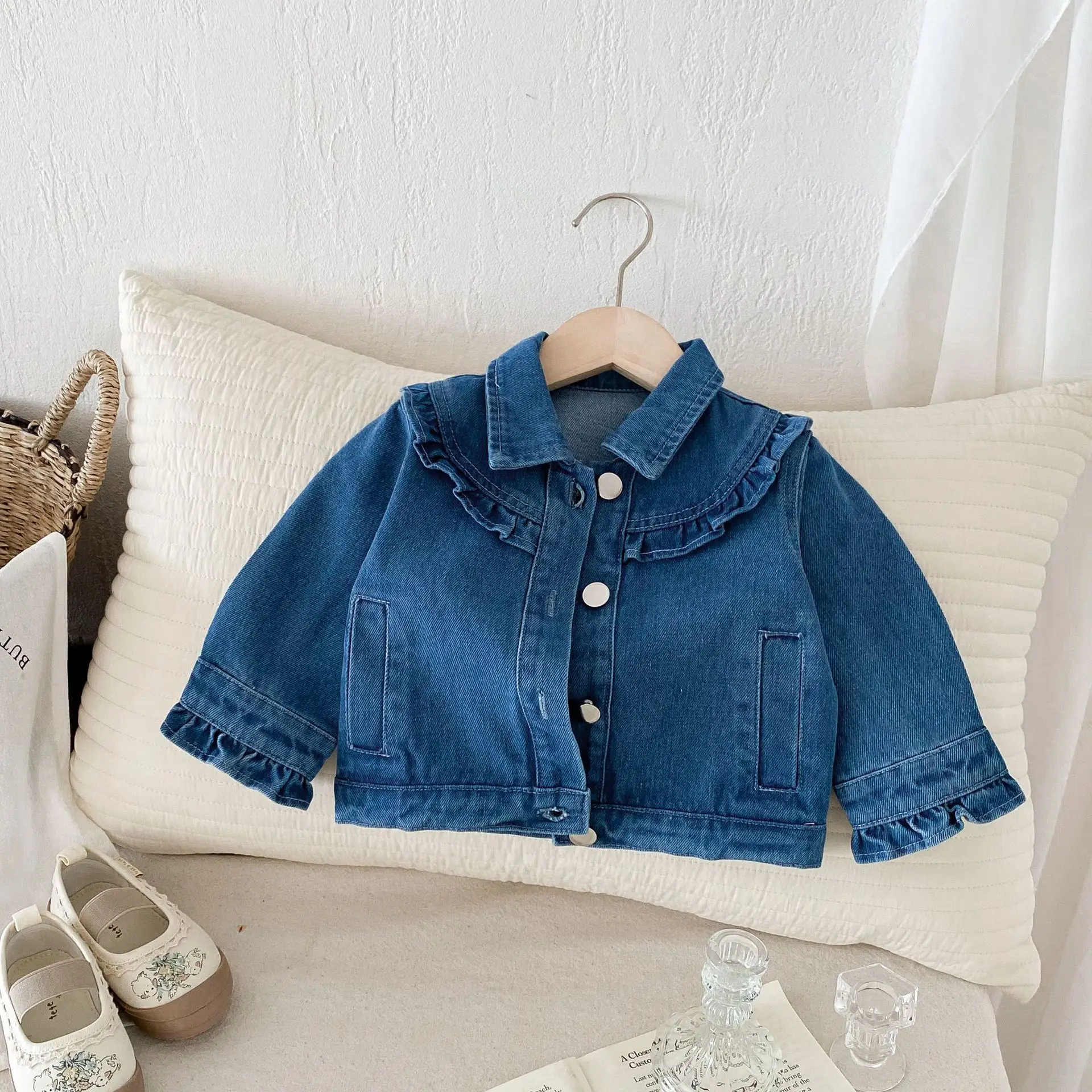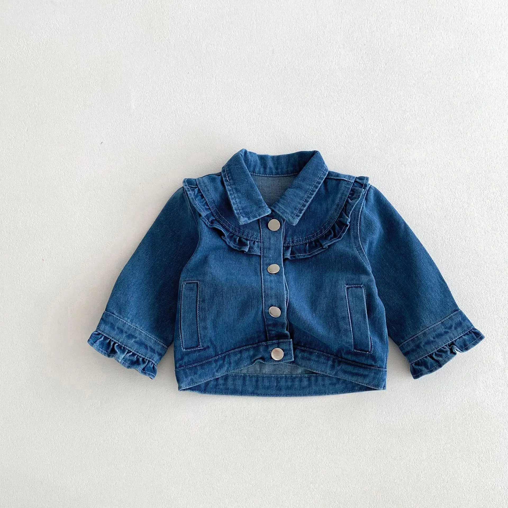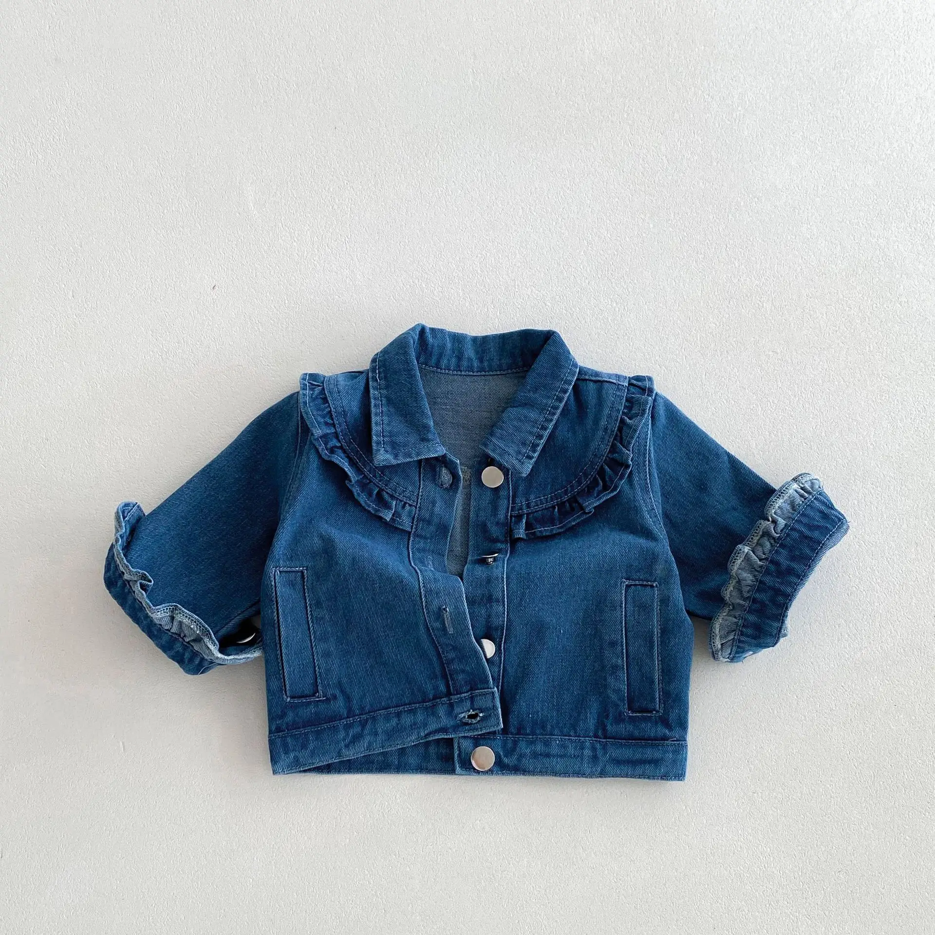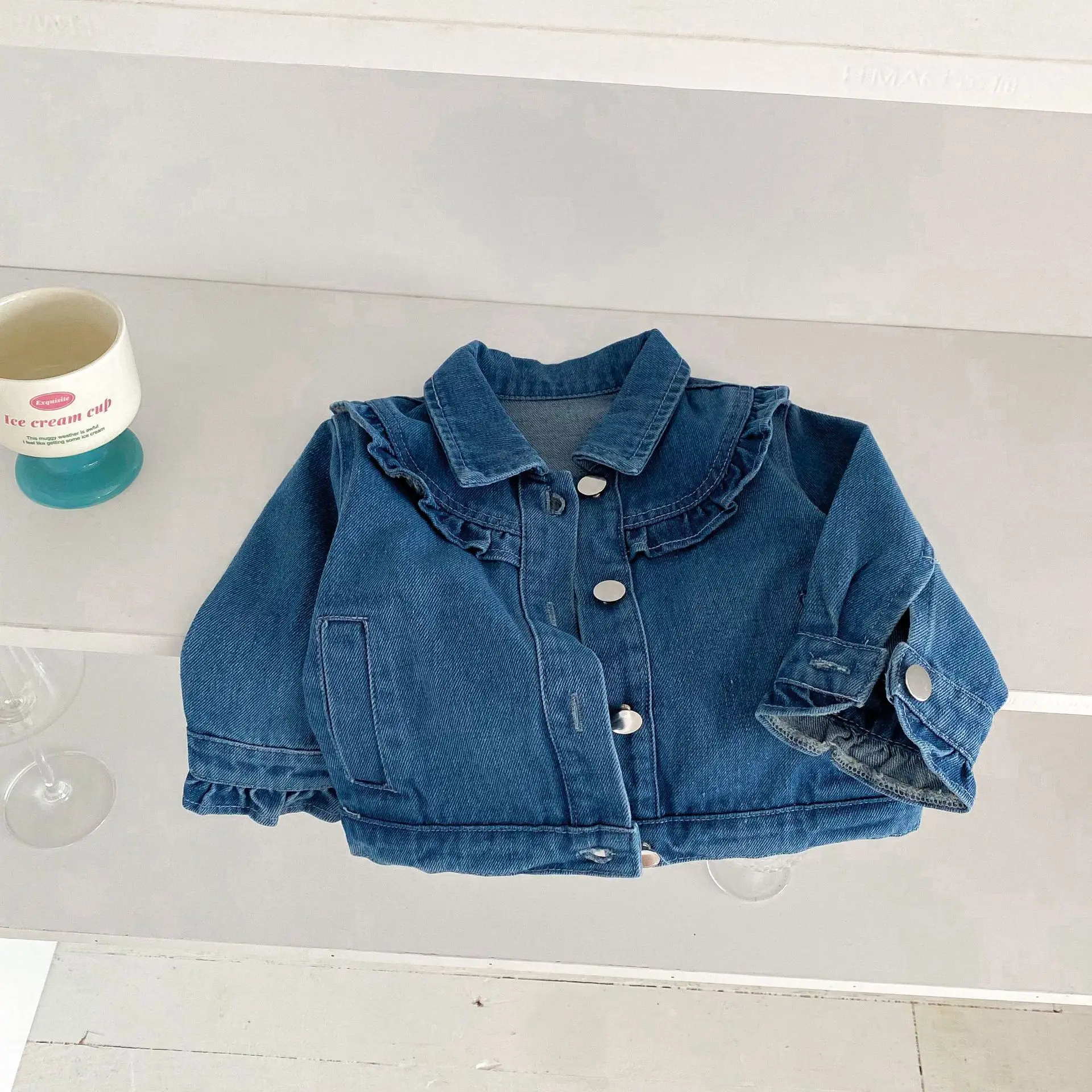 フリルディテールが魅力的なキッズ用デニムジャケットです。おしゃれなレースのラペルがアクセントとなり、カジュアルなスタイルを一層引き立てます。ゆったりとしたシルエットで動きやすく、デイリーユースに最適です。耐久性のあるデニム素材が長持ちし、どんなシーンでも活躍します。お子様のコーディネートに取り入れやすい一枚です。