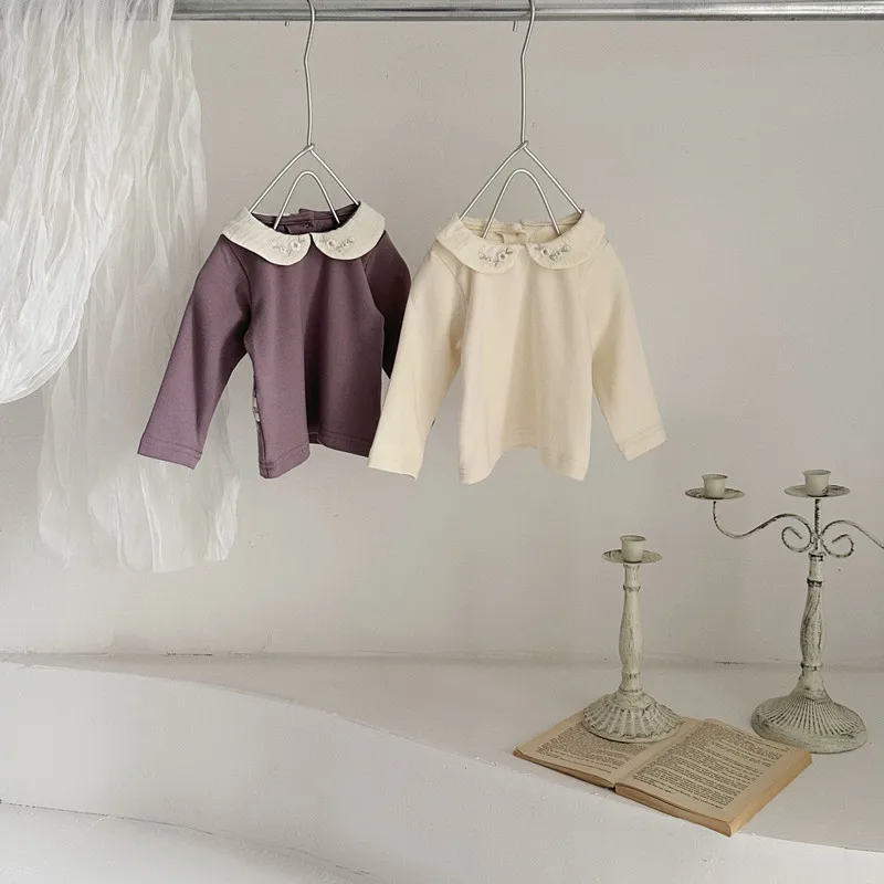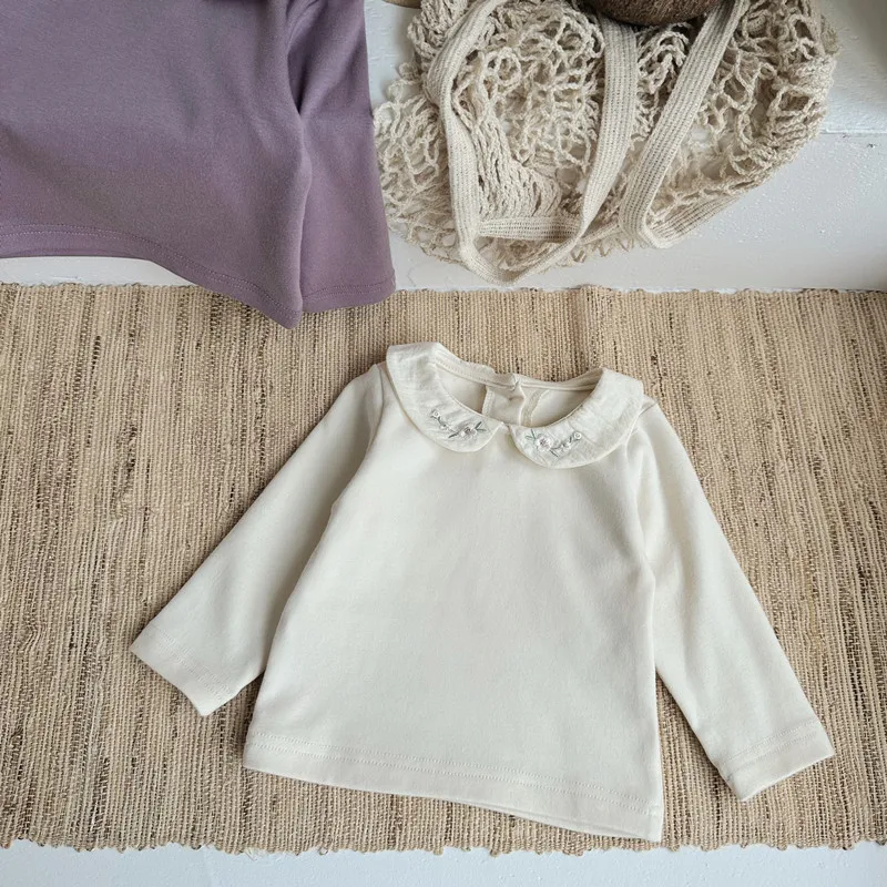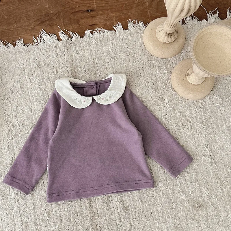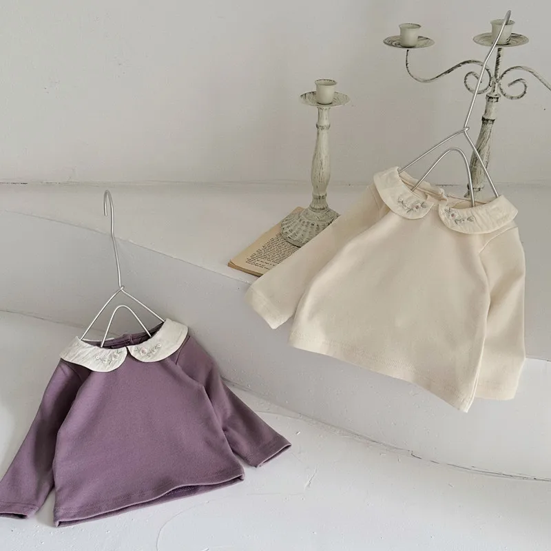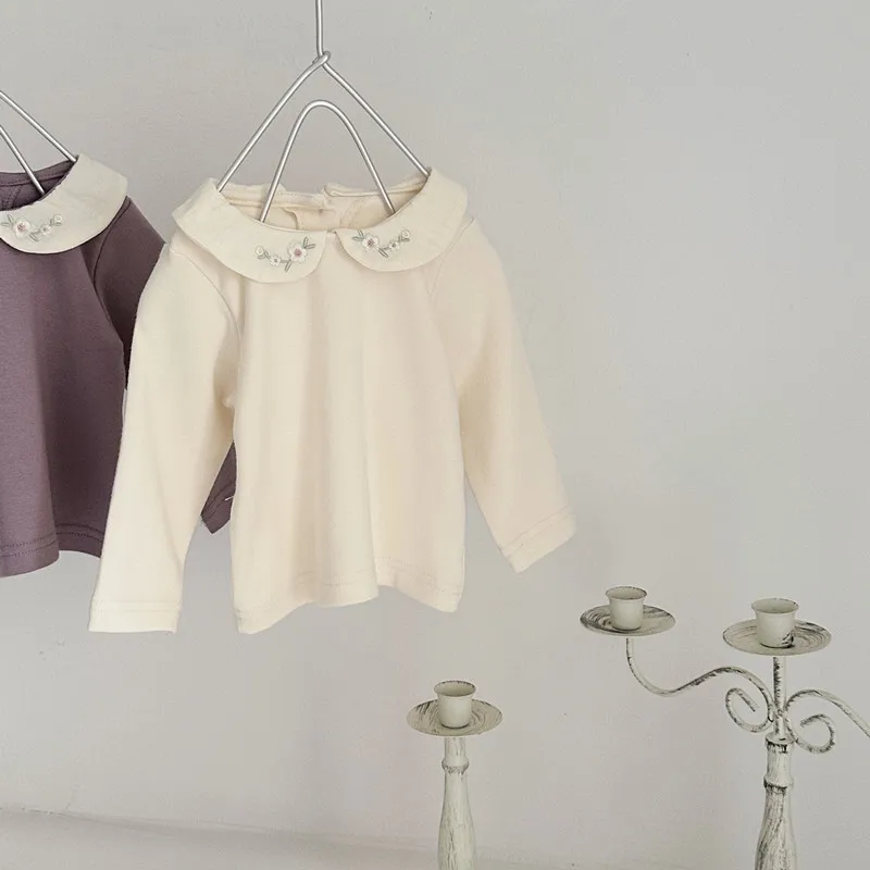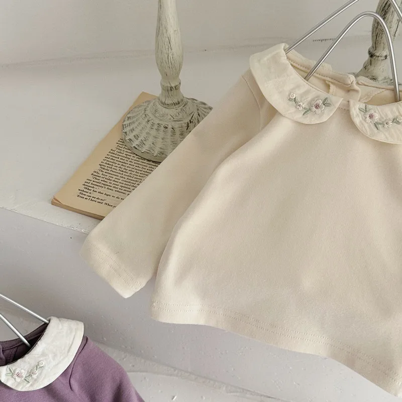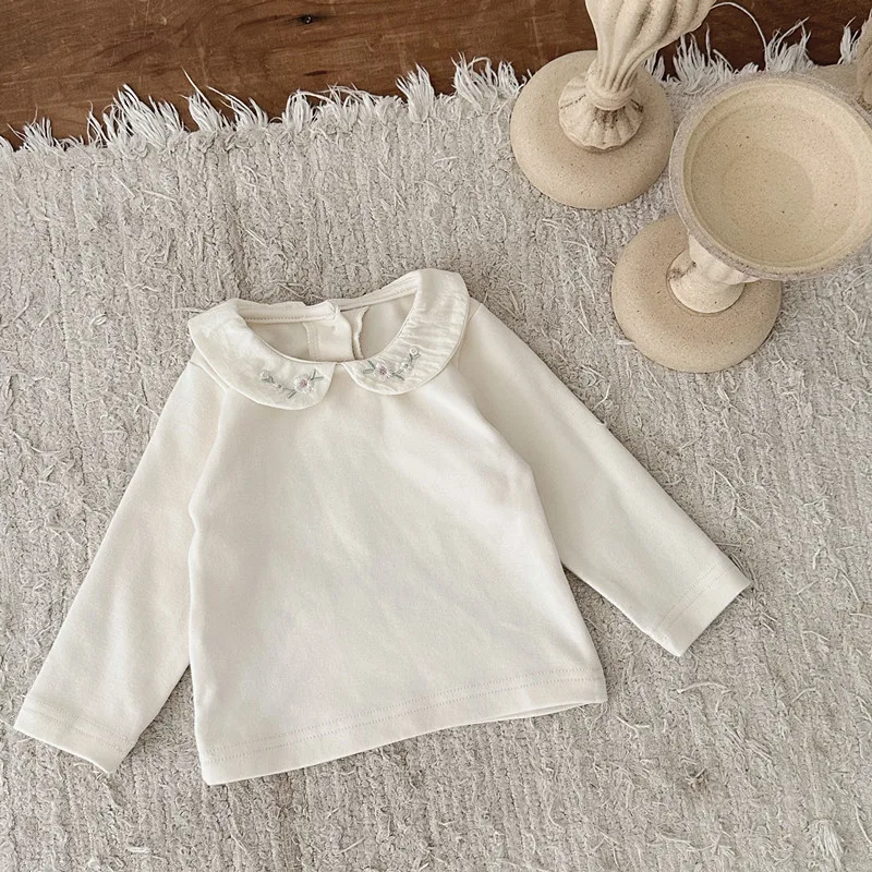 ベビートップス フラワー刺繍丸襟長袖Tシャツブラウス 2カラー【mh0006702】
