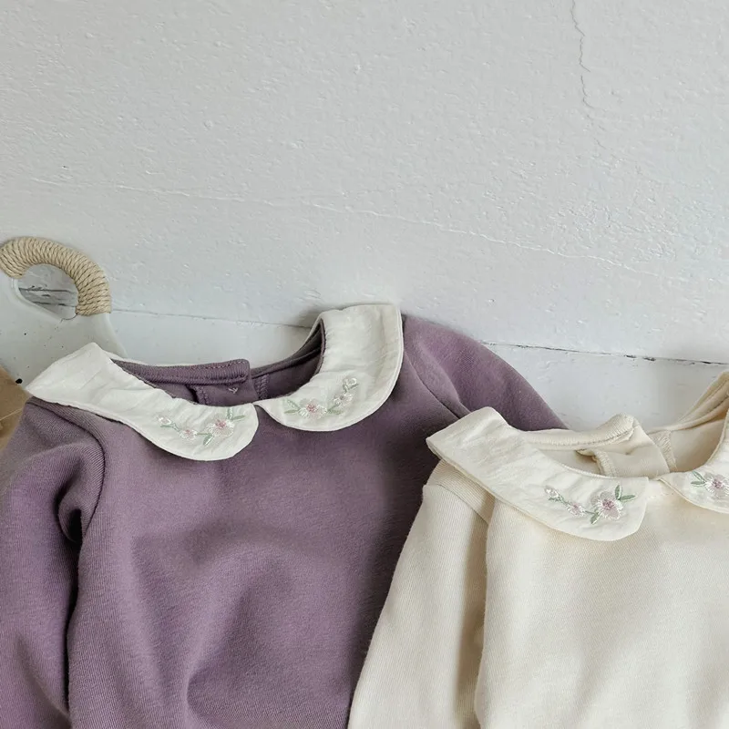 可愛らしいフラワー刺繍が施された丸襟の長袖Tシャツブラウスです。ピーターパンカラーが上品さを引き立て、赤ちゃんやトドラーにぴったりのデザイン。柔らかなコットン素材を使用し、快適さとスタイルを両立させた1枚です。2カラー展開で、さまざまなコーディネートに合わせやすく、デイリーにもお出かけにも使える万能アイテムです。