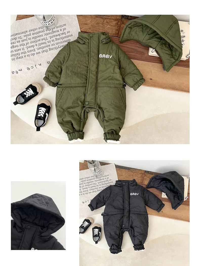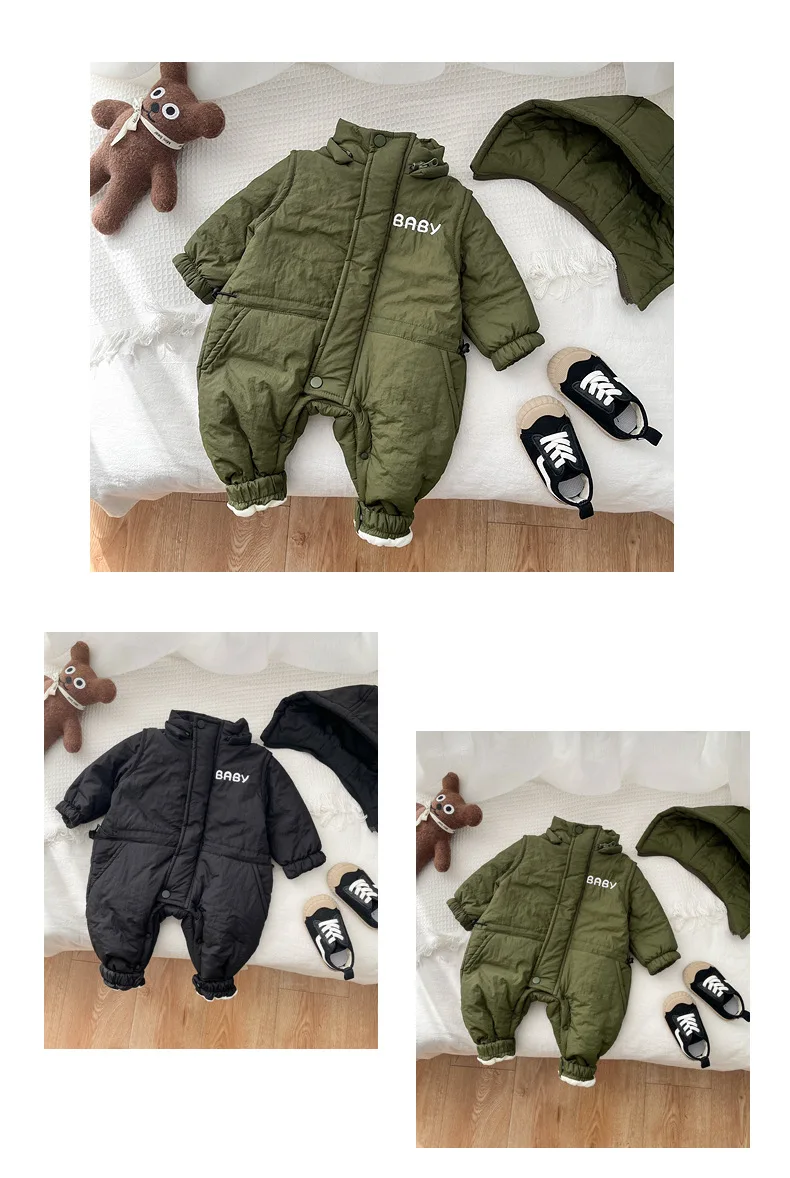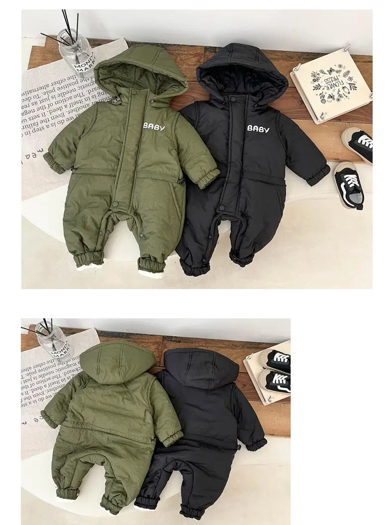 #ベビーアウター #ジャンプスーツ #ロゴプリント #防寒ロンパース #厚手アウター #赤ちゃん服 #カジュアルコーデ