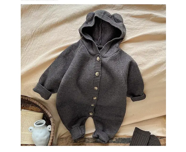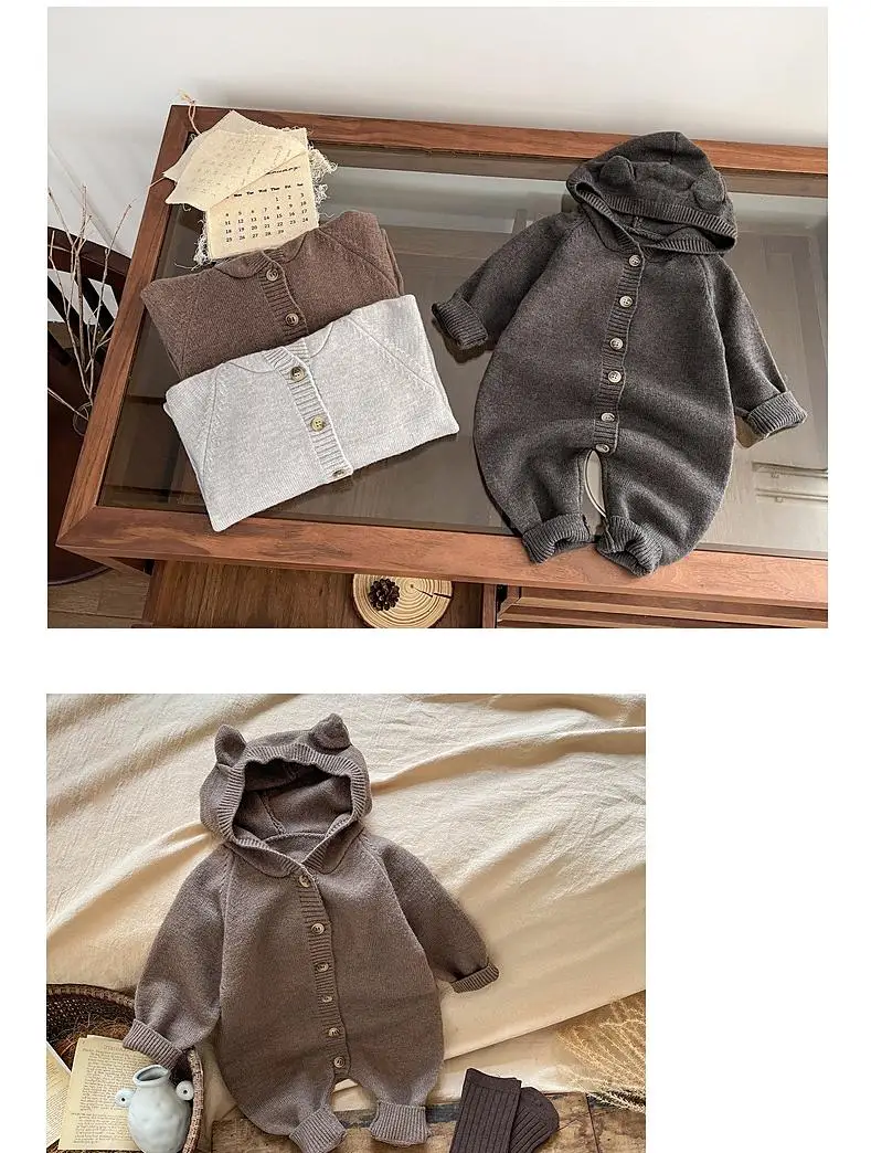 #ベビーロンパース #くま耳フード #ニット素材 #長袖ジャンプスーツ #赤ちゃん服 #可愛いデザイン