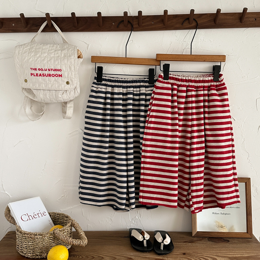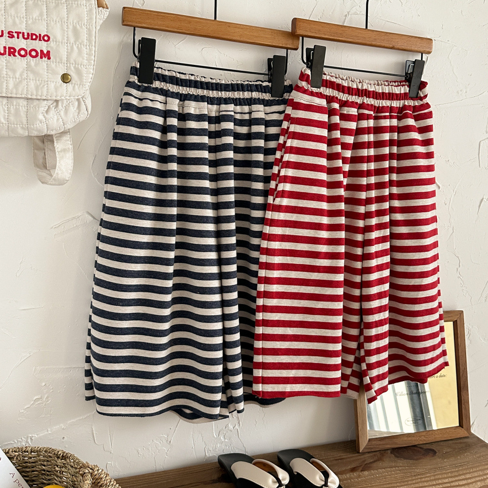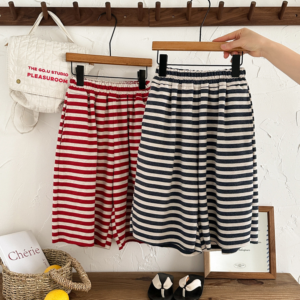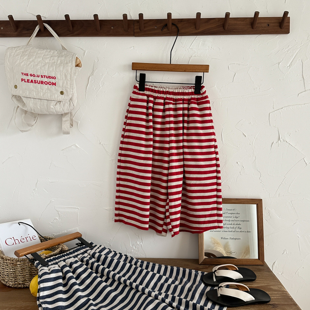ゆったりとしたワイドシルエットと爽やかなボーダー柄が特徴で、リラックス感のある着心地です。膝丈の五分丈は、様々なトップスと合わせやすく、カジュアルなデイリーコーデに大活躍。ウエストはゴム仕様なので、お子さん一人でも着脱が簡単です。動きやすさを重視したデザインで、活発に遊び回るお子さんも快適に過ごせます。シンプルながらもトレンド感のあるデザインで、着回し力も抜群です。
