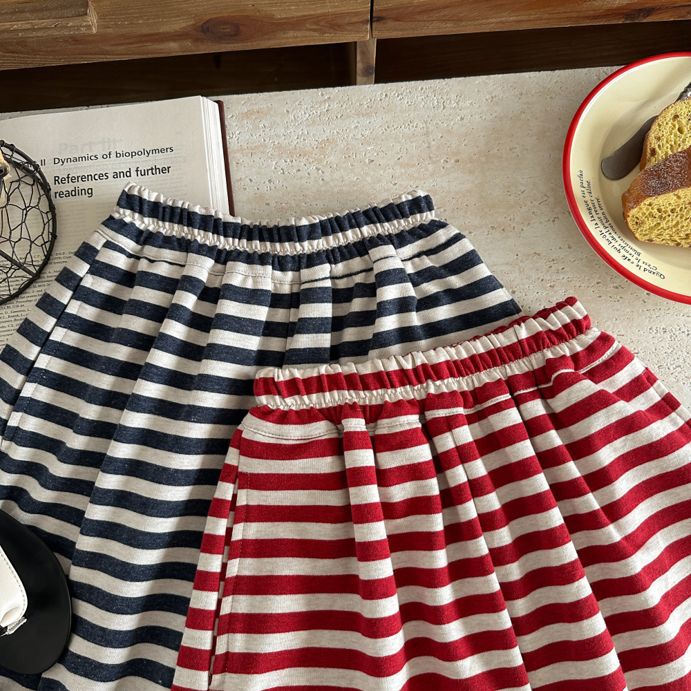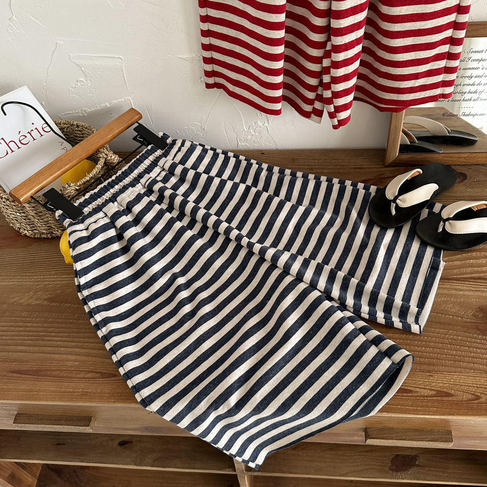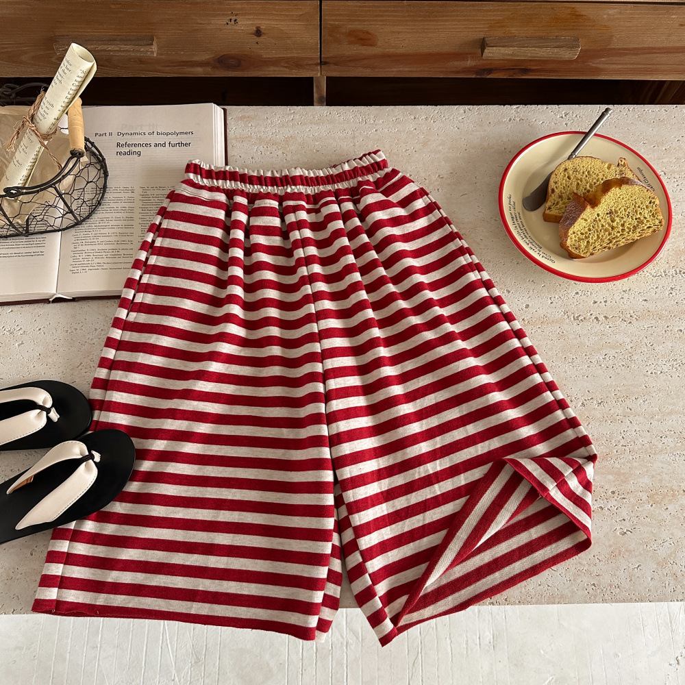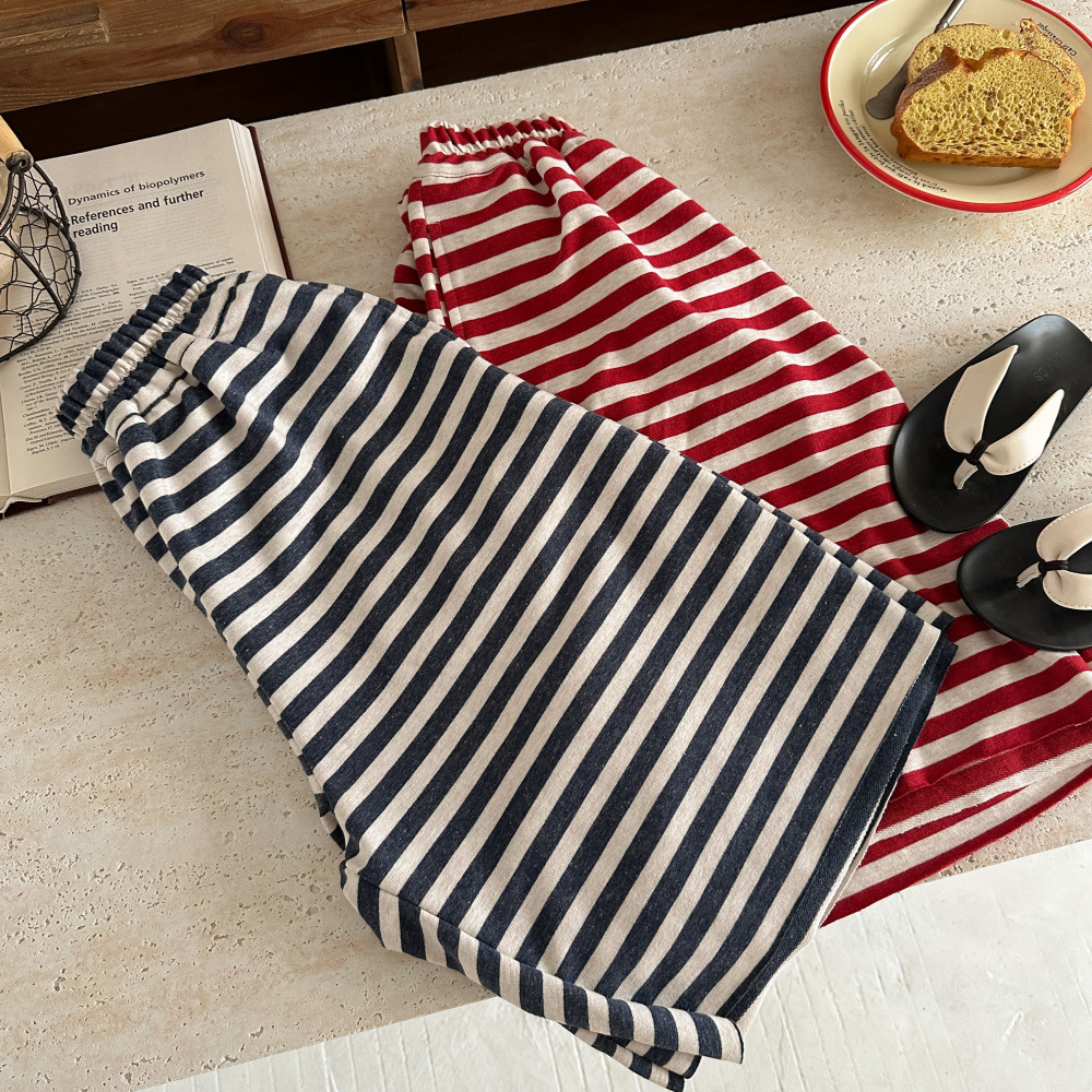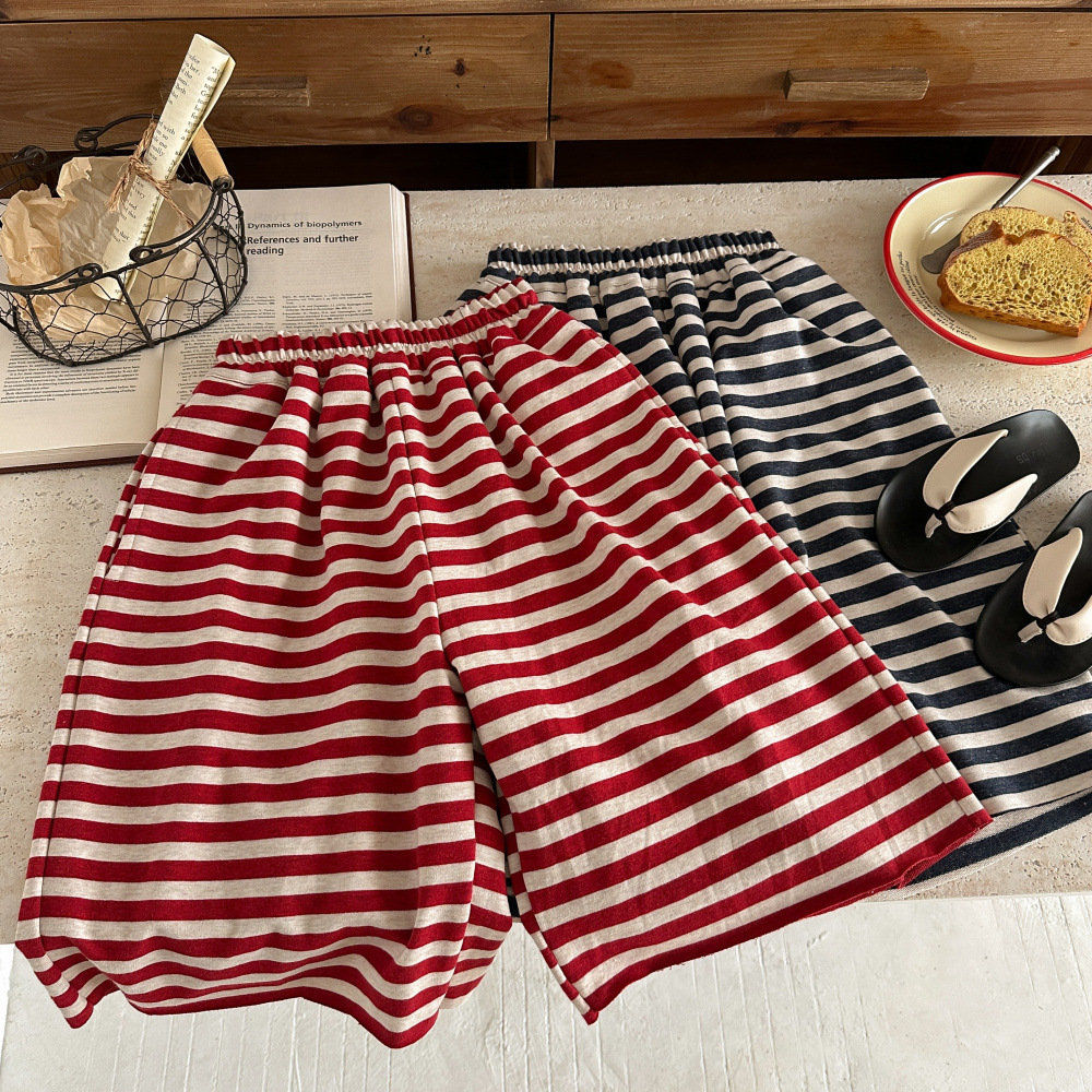 ゆったりとしたワイドシルエットと爽やかなボーダー柄が特徴で、リラックス感のある着心地です。膝丈の五分丈は、様々なトップスと合わせやすく、カジュアルなデイリーコーデに大活躍。ウエストはゴム仕様なので、お子さん一人でも着脱が簡単です。動きやすさを重視したデザインで、活発に遊び回るお子さんも快適に過ごせます。シンプルながらもトレンド感のあるデザインで、着回し力も抜群です。